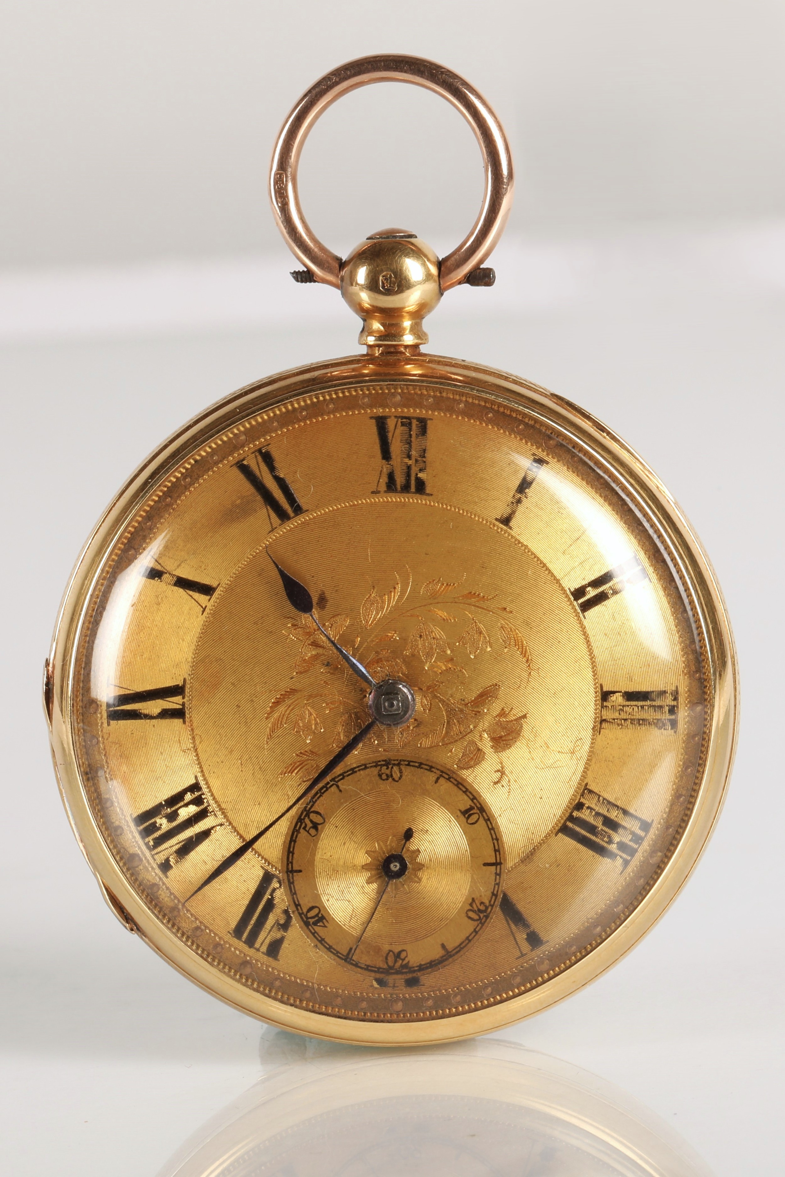 Gents 18ct gold open faced pocket watch, engraved dial with Roman numerals and subsidiary dial, gross weight 109.8 grams