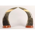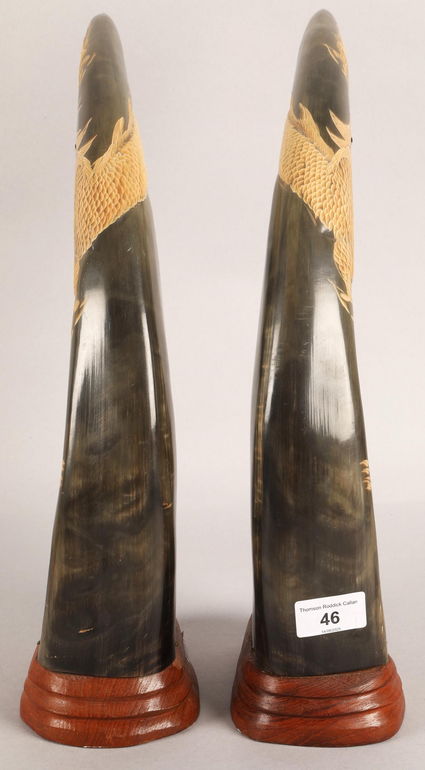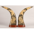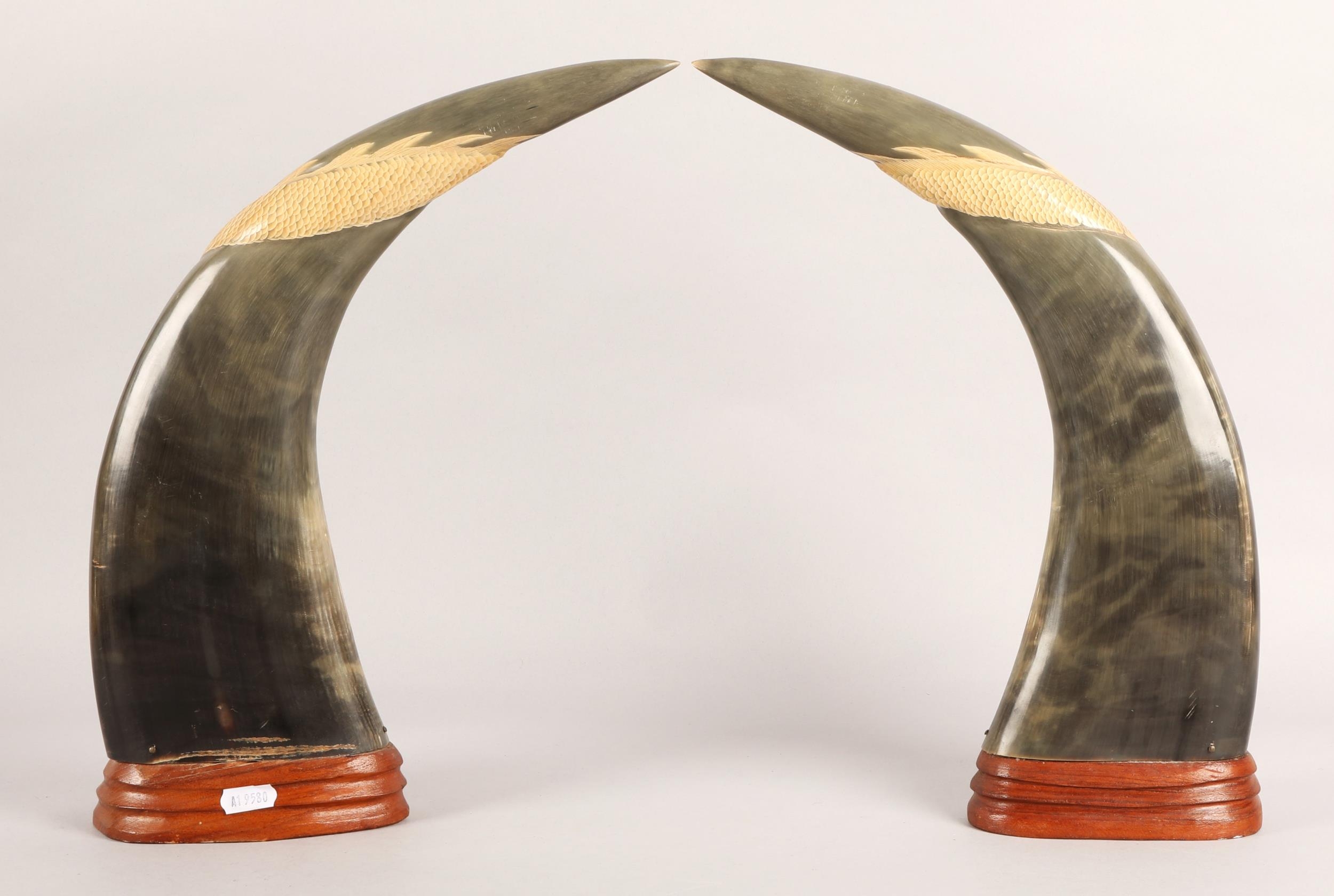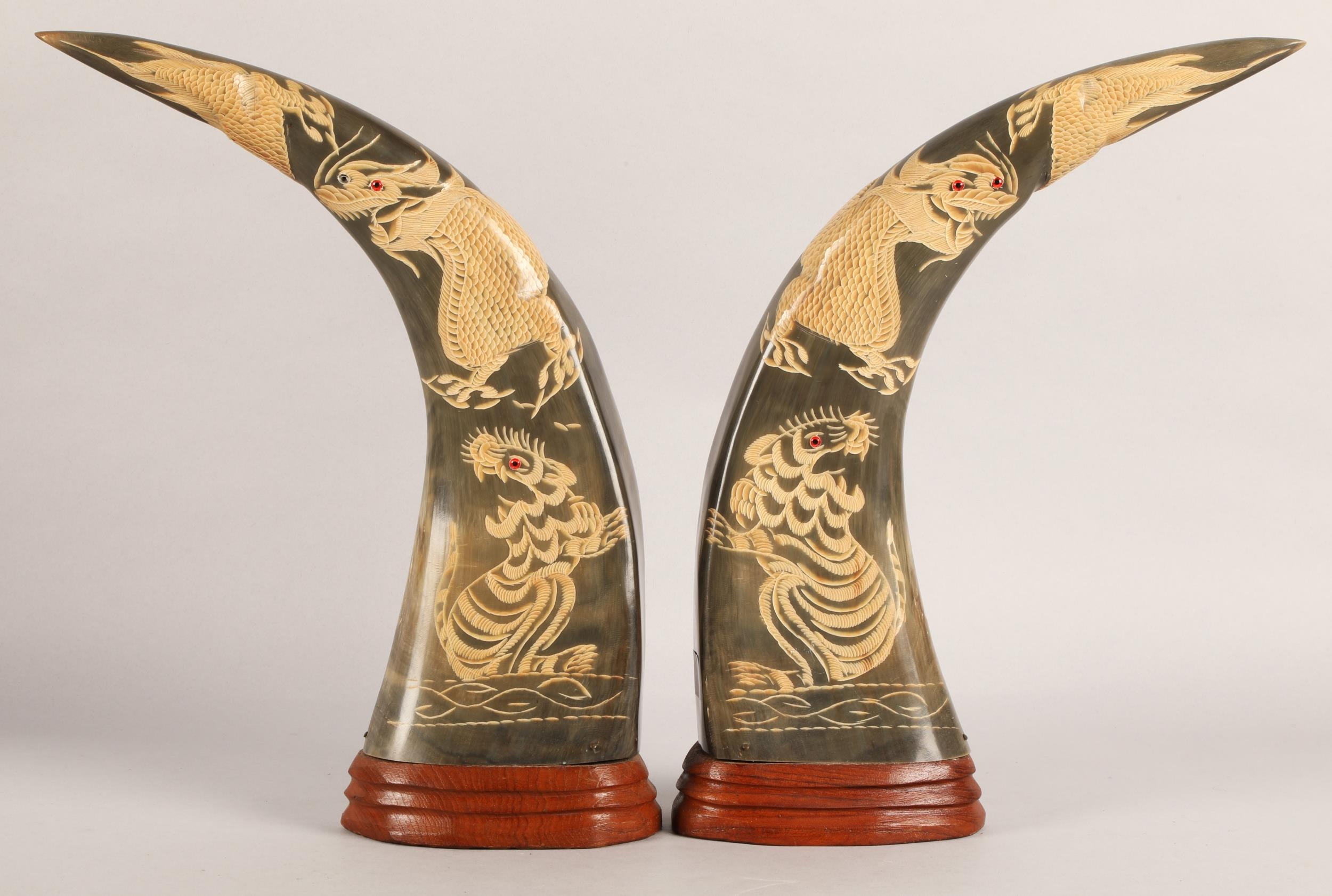 Pair of mounted horns with carved dragon and tiger design, a...
