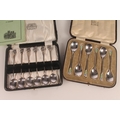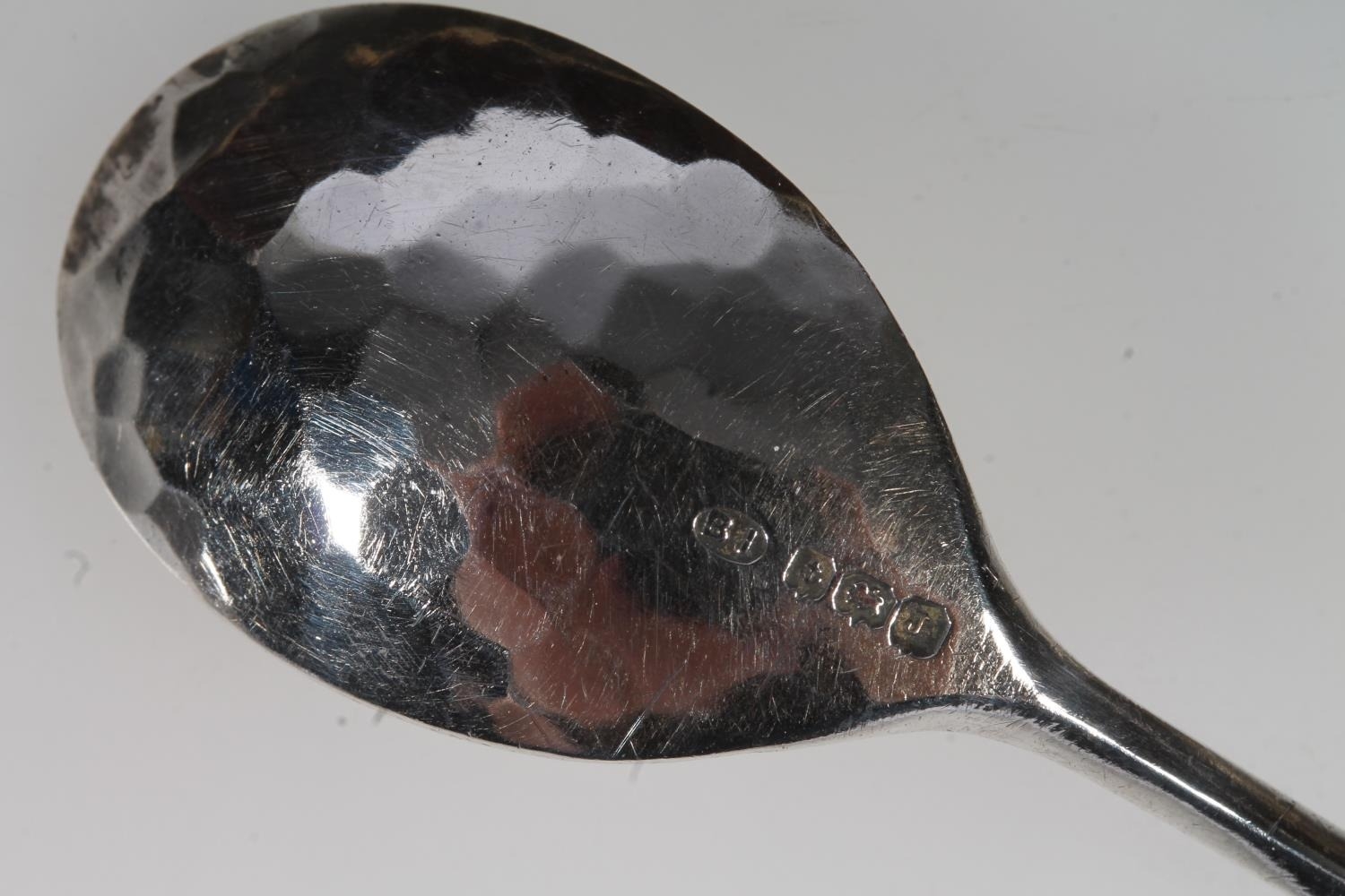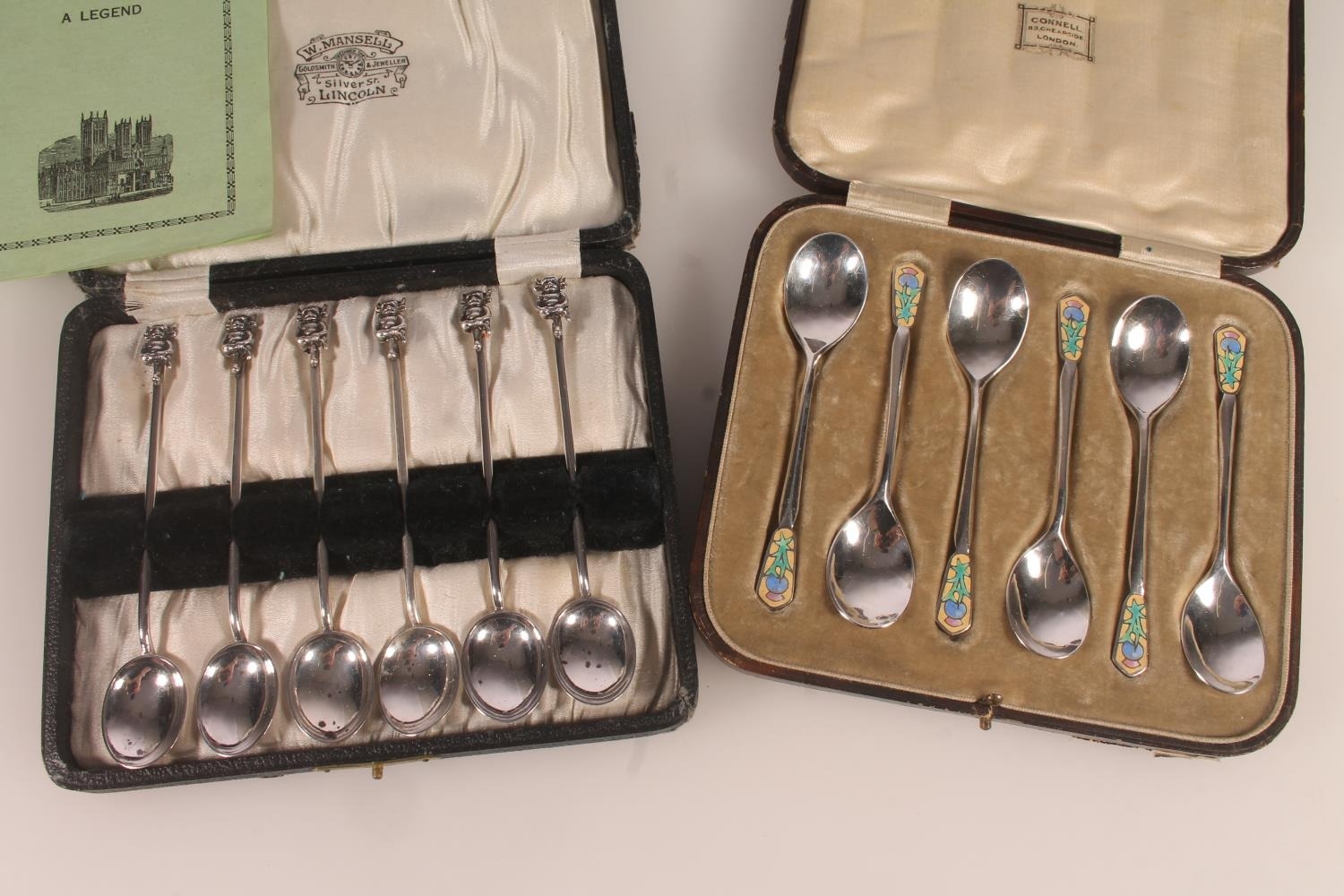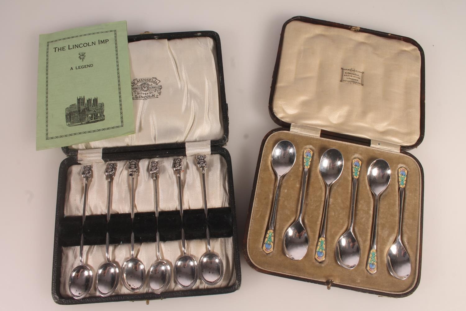 Set of six Geo. V silver and enamel teaspoons, with thistle terminals leading to hammered bowls, Bernard Instone Birmingham 1933, together with a set of six hallmarked Lincoln Imp coffee spoons, both sets in original cases, gross silver weight 103g.