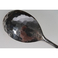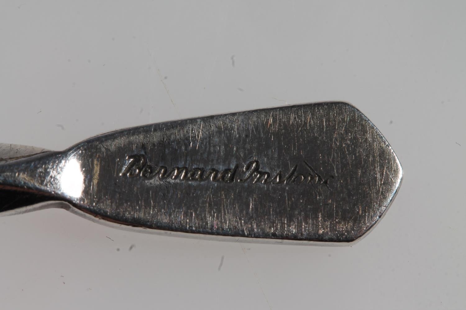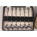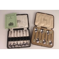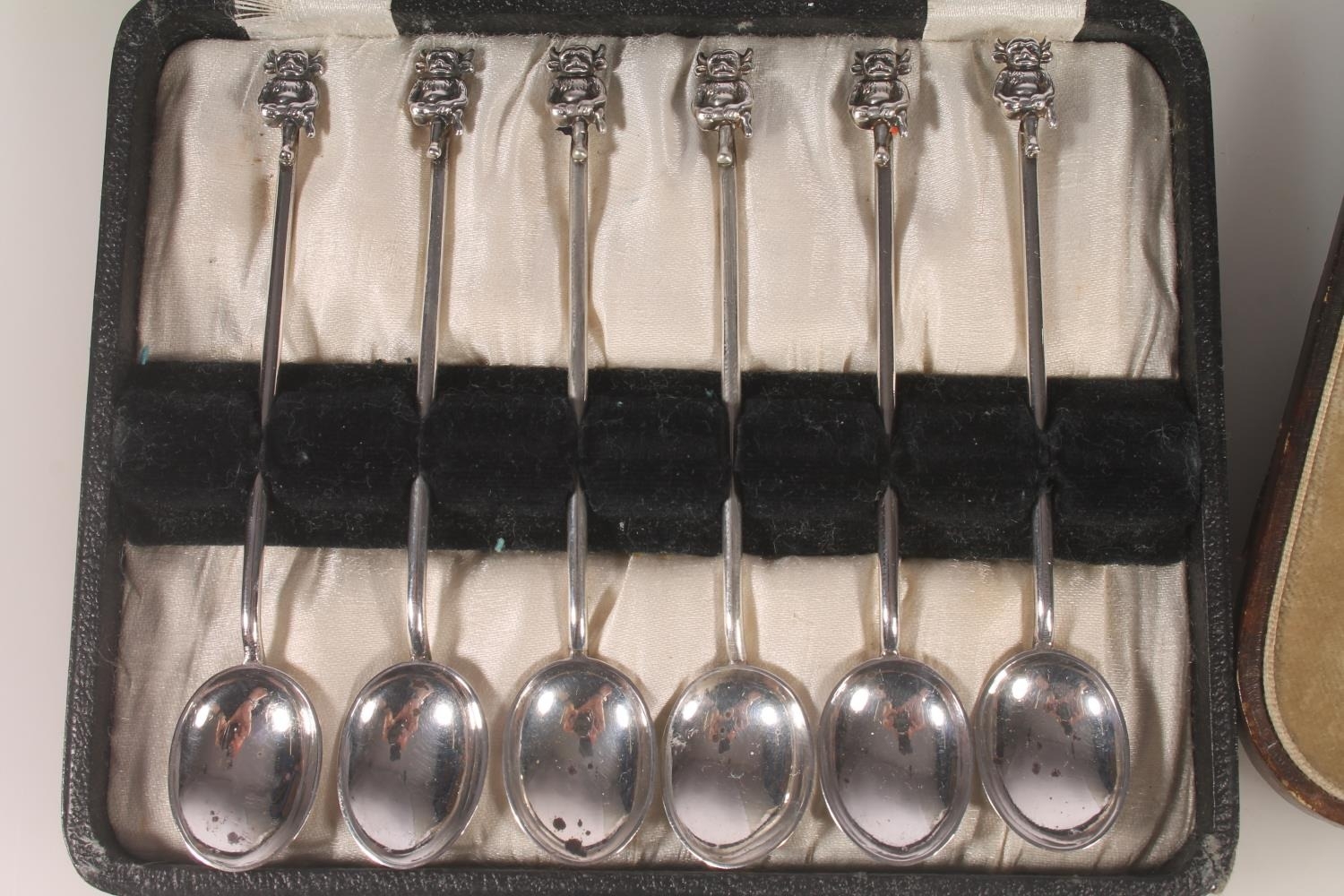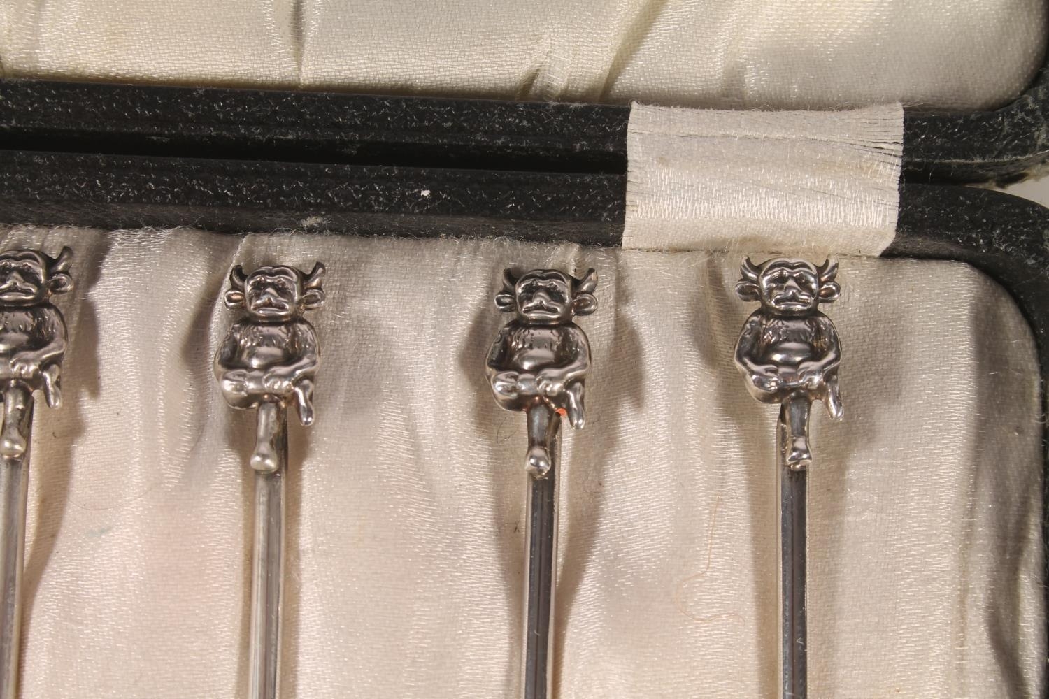 Set of six Geo. V silver and enamel teaspoons, with thistle terminals leading to hammered bowls, Bernard Instone Birmingham 1933, together with a set of six hallmarked Lincoln Imp coffee spoons, both sets in original cases, gross silver weight 103g.