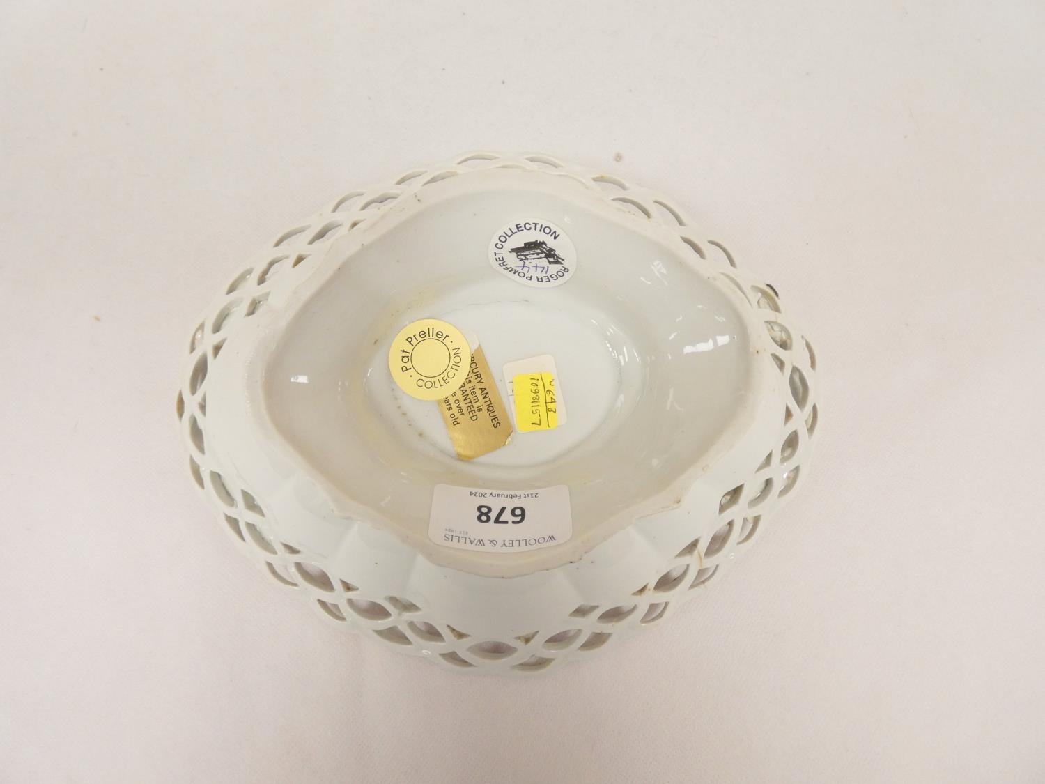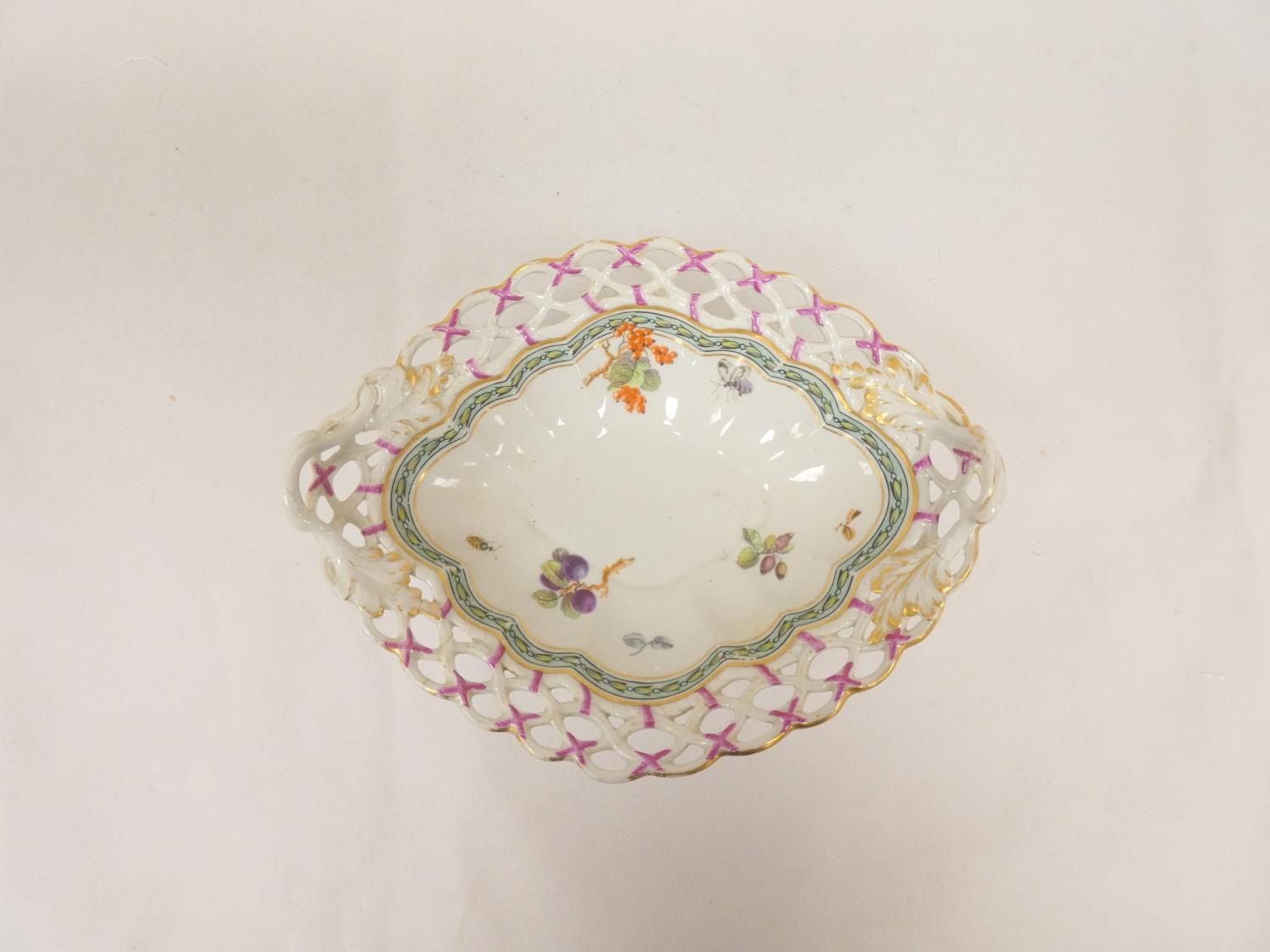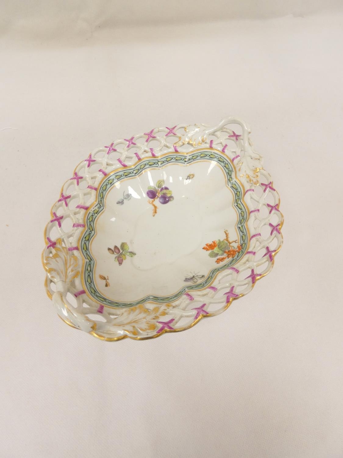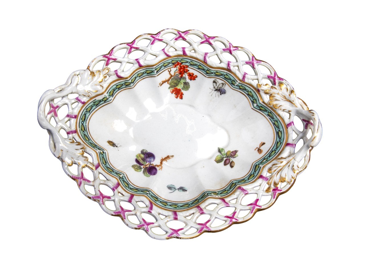 Rare New Hall dessert basket, decorated in the manner of George Davis, with insects and fruit sprigs within a husk border, of lobed quatrefoil form with pierced rim and leaf and branch handles. 25cm long, c.1787/88. Prov. Mercury Antiques and Pat Preller collection. Possible alternative attribution to Enoch Wood.