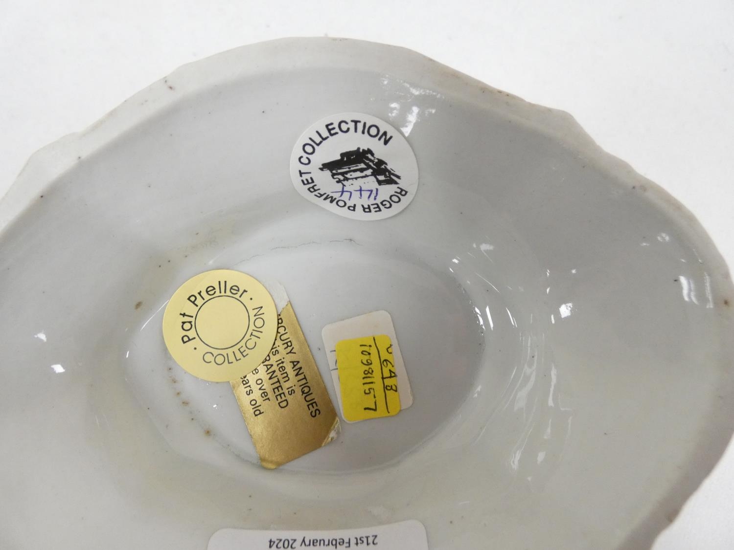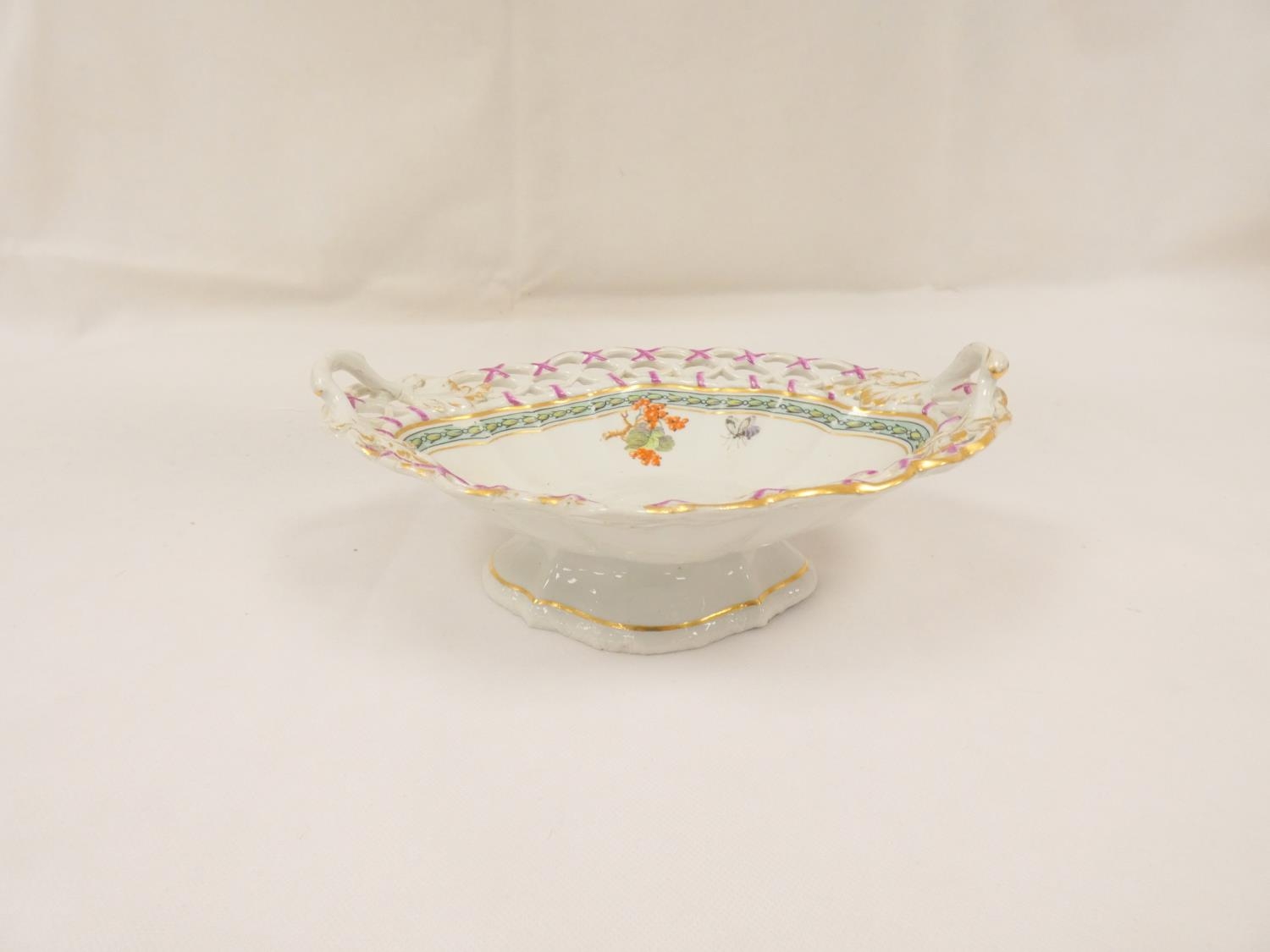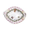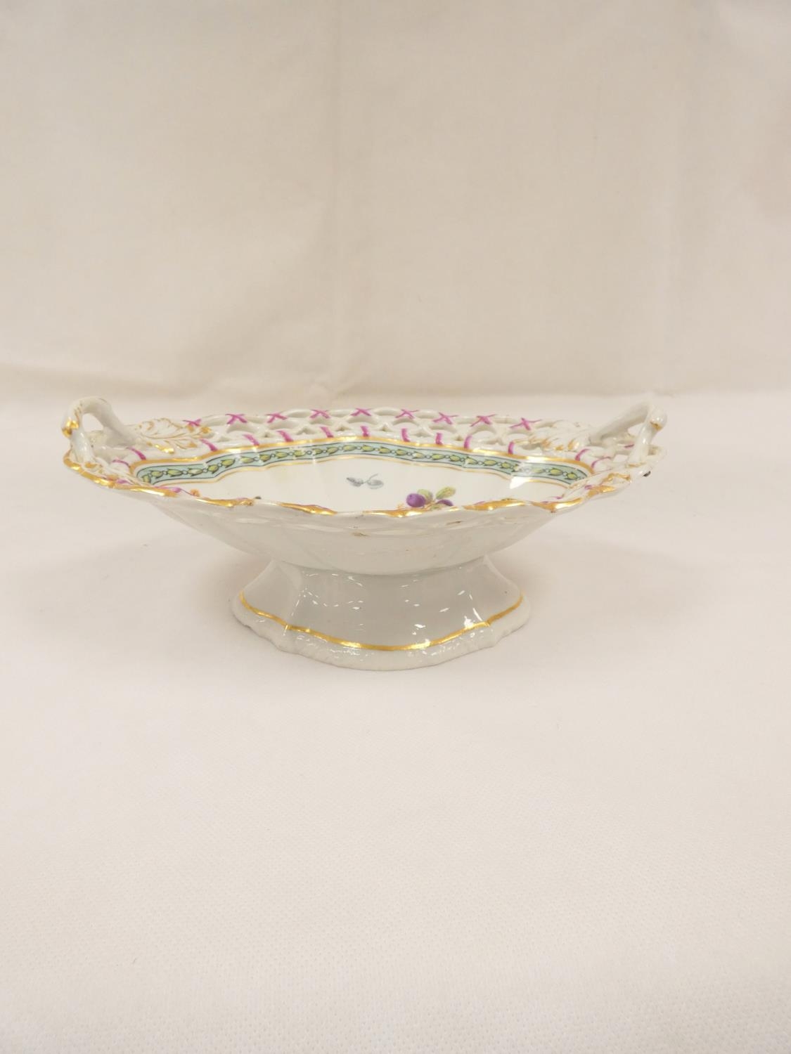 Rare New Hall dessert basket, decorated in the manner of George Davis, with insects and fruit sprigs within a husk border, of lobed quatrefoil form with pierced rim and leaf and branch handles. 25cm long, c.1787/88. Prov. Mercury Antiques and Pat Preller collection. Possible alternative attribution to Enoch Wood.