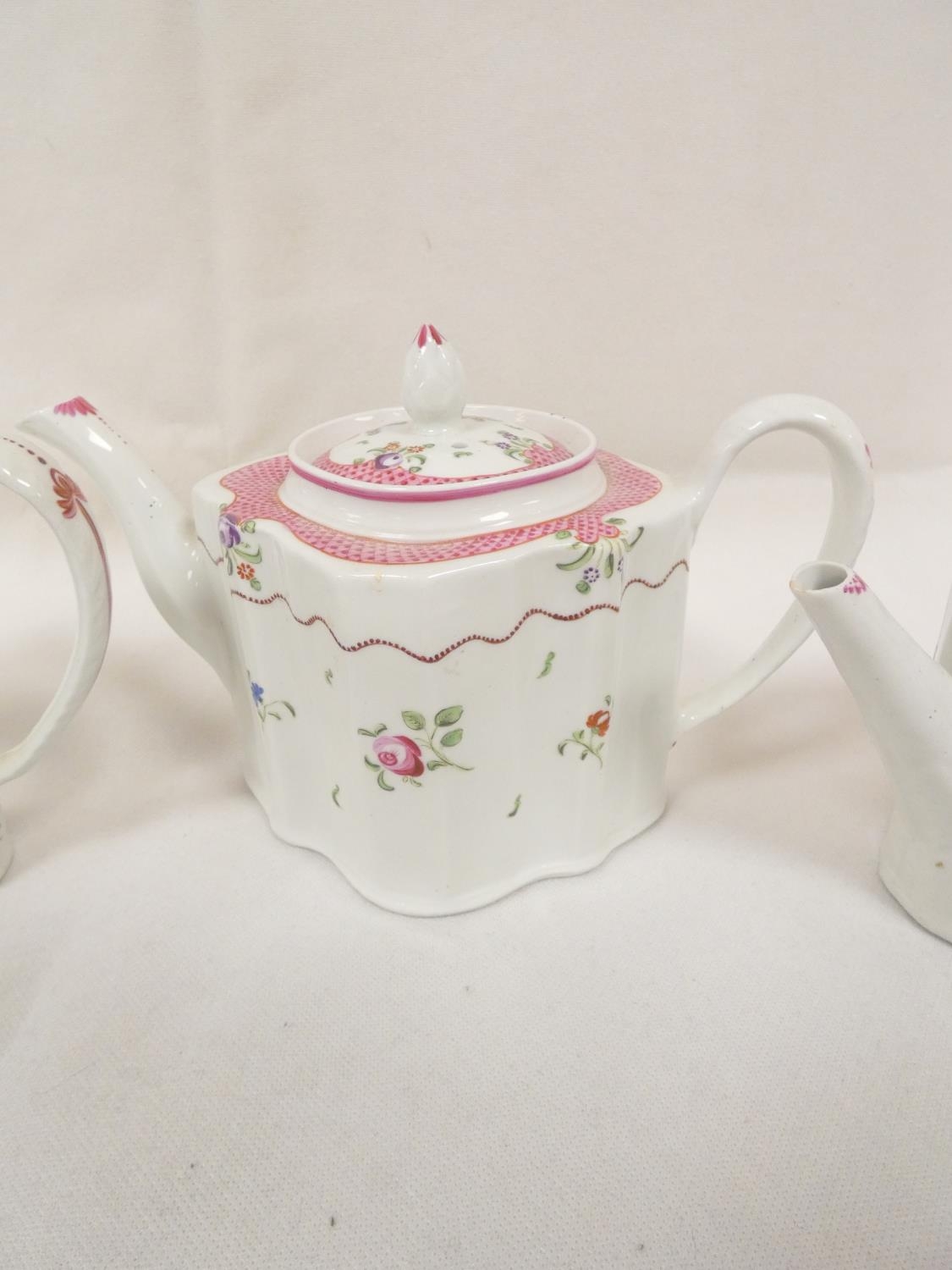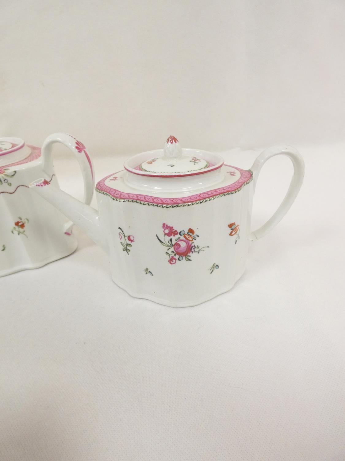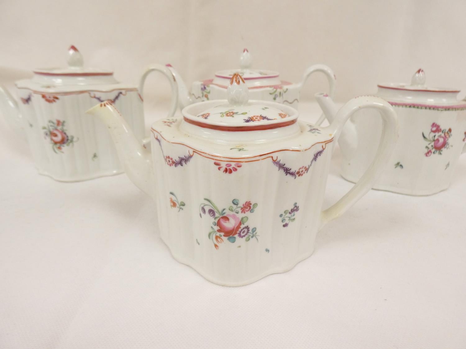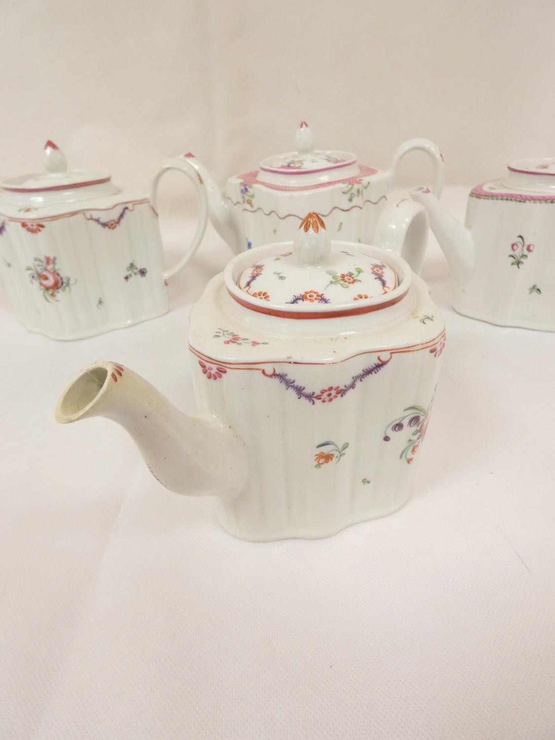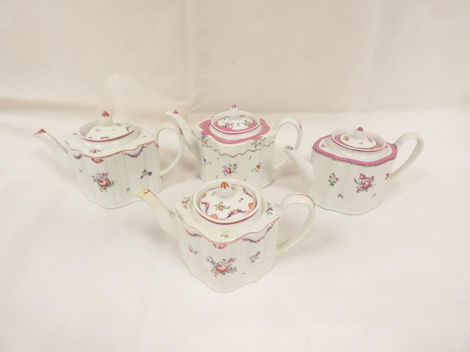New Hall graduated near pair of reeded silver shape teapots, curved spouts, pattern 139, swags and floral sprays, 16cm and 14cm high, c.1787/90; also two New Hall silver shape teapots, pattern 173, floral sprays and pink borders, one with rosette feet and straight spout. (4).