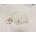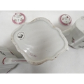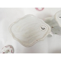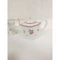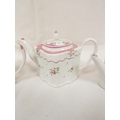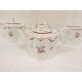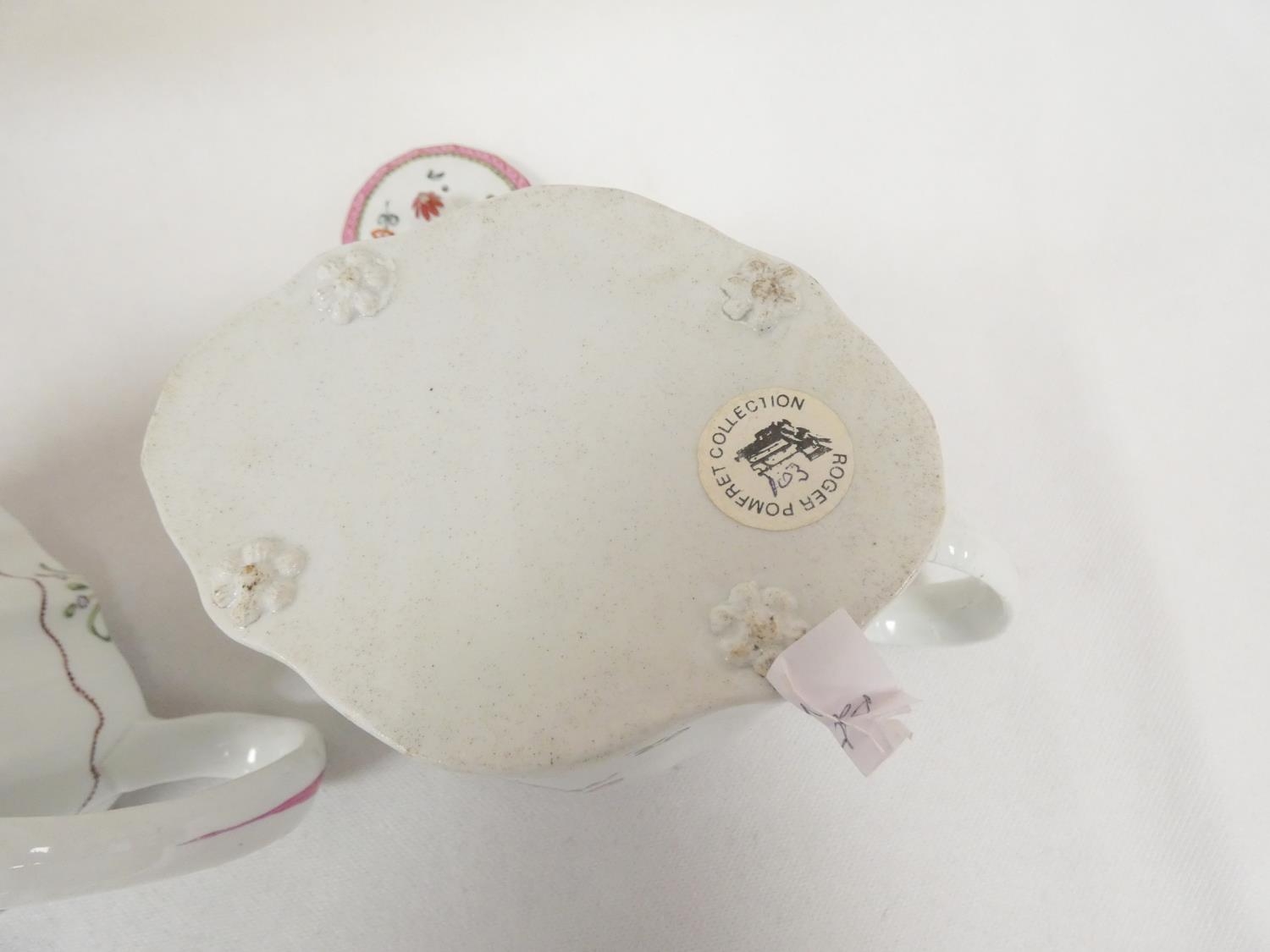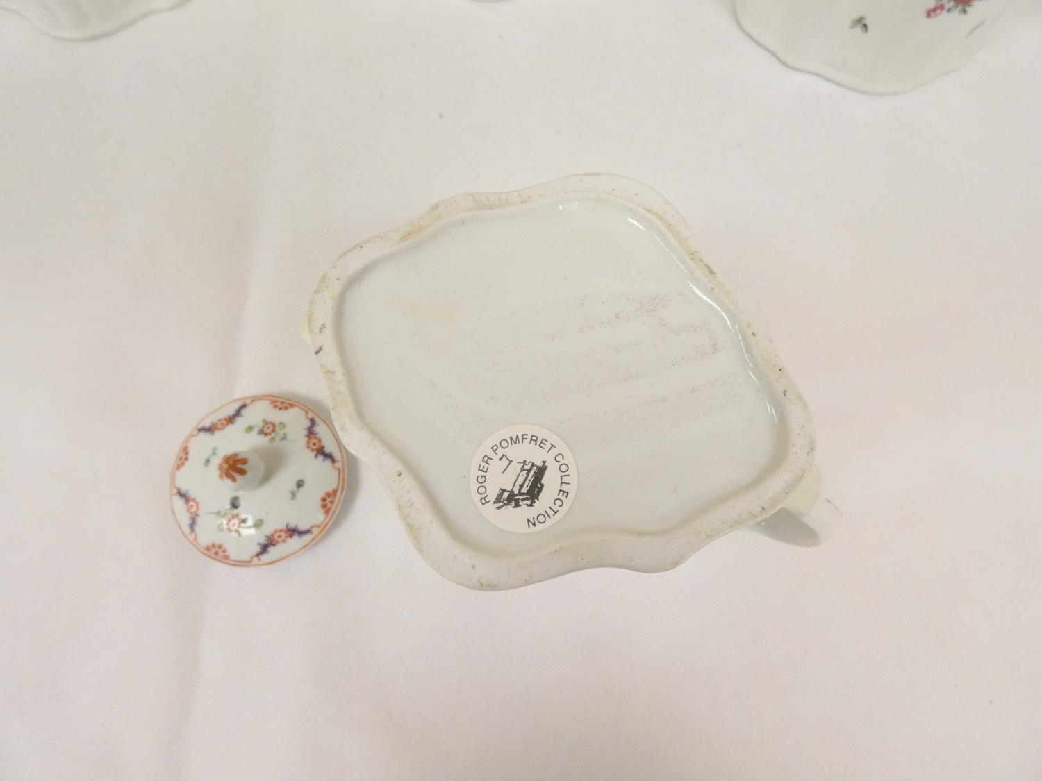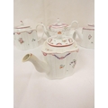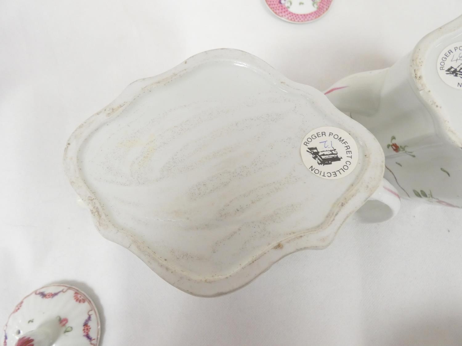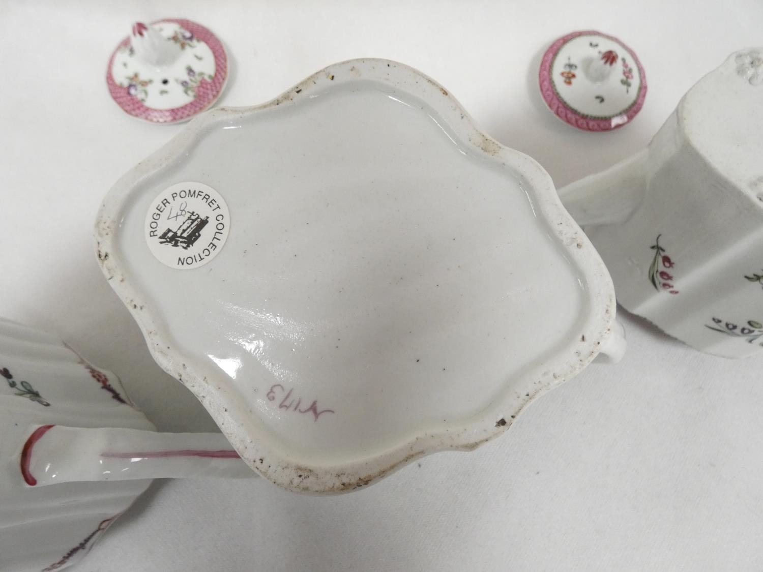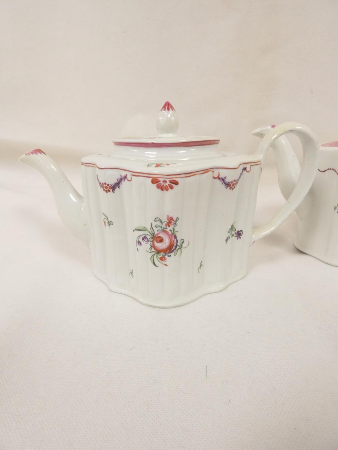 New Hall graduated near pair of reeded silver shape teapots, curved spouts, pattern 139, swags and floral sprays, 16cm and 14cm high, c.1787/90; also two New Hall silver shape teapots, pattern 173, floral sprays and pink borders, one with rosette feet and straight spout. (4).