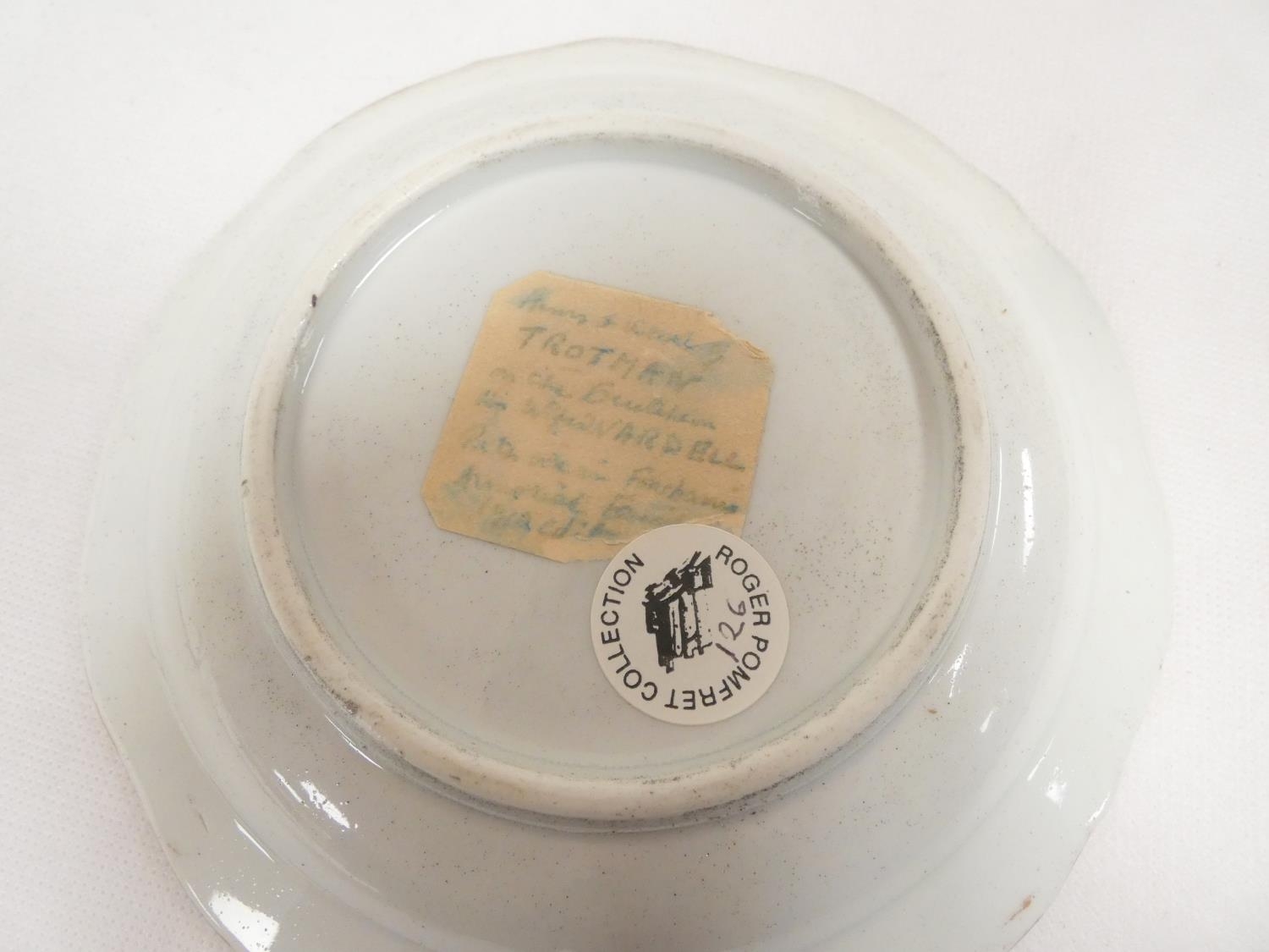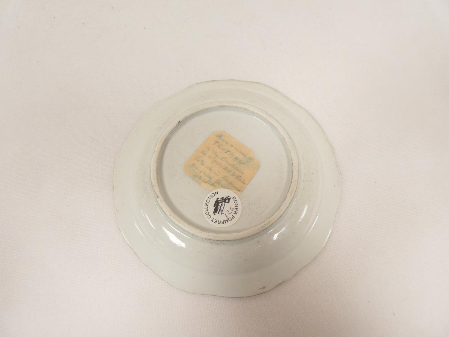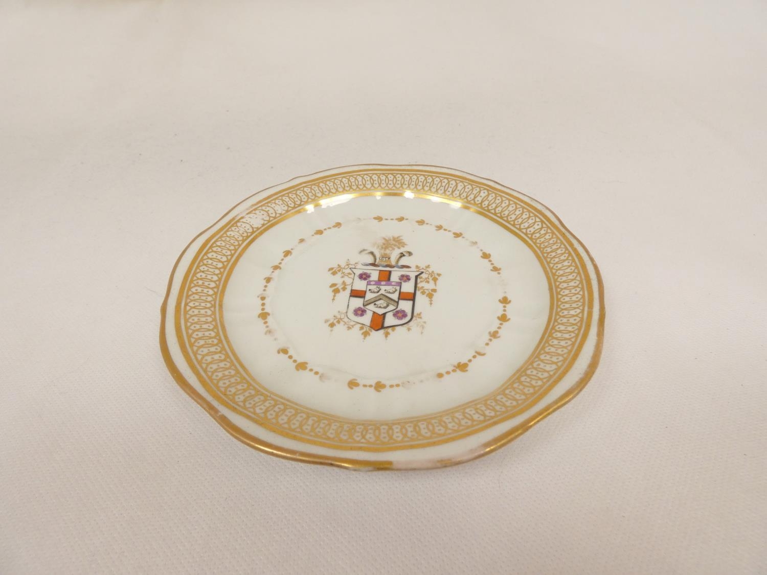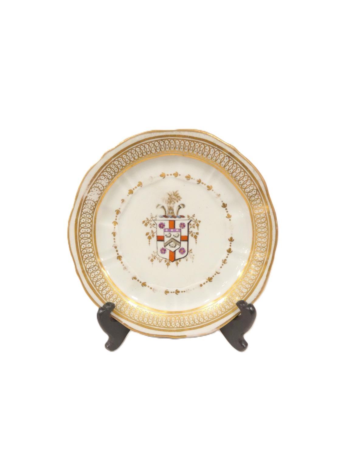 Very rare New Hall armorial stand or shallow dish, lobed rim and pinch and pleat moulding, central arms of Trotman with those of Wardell in pretense, gilt details and borders, 16cm diameter, mid 1780's. See cup and saucer from the same service, Duke's, auctioneers,15th Feb. 2007, lot 235.