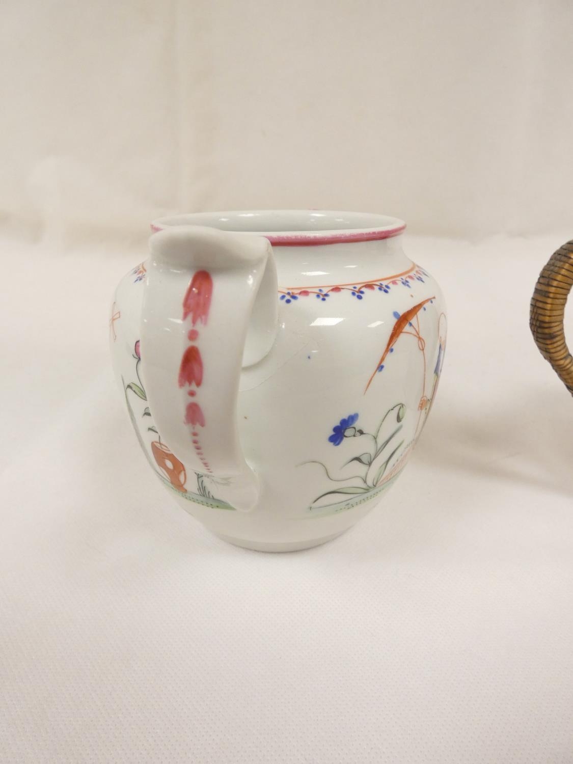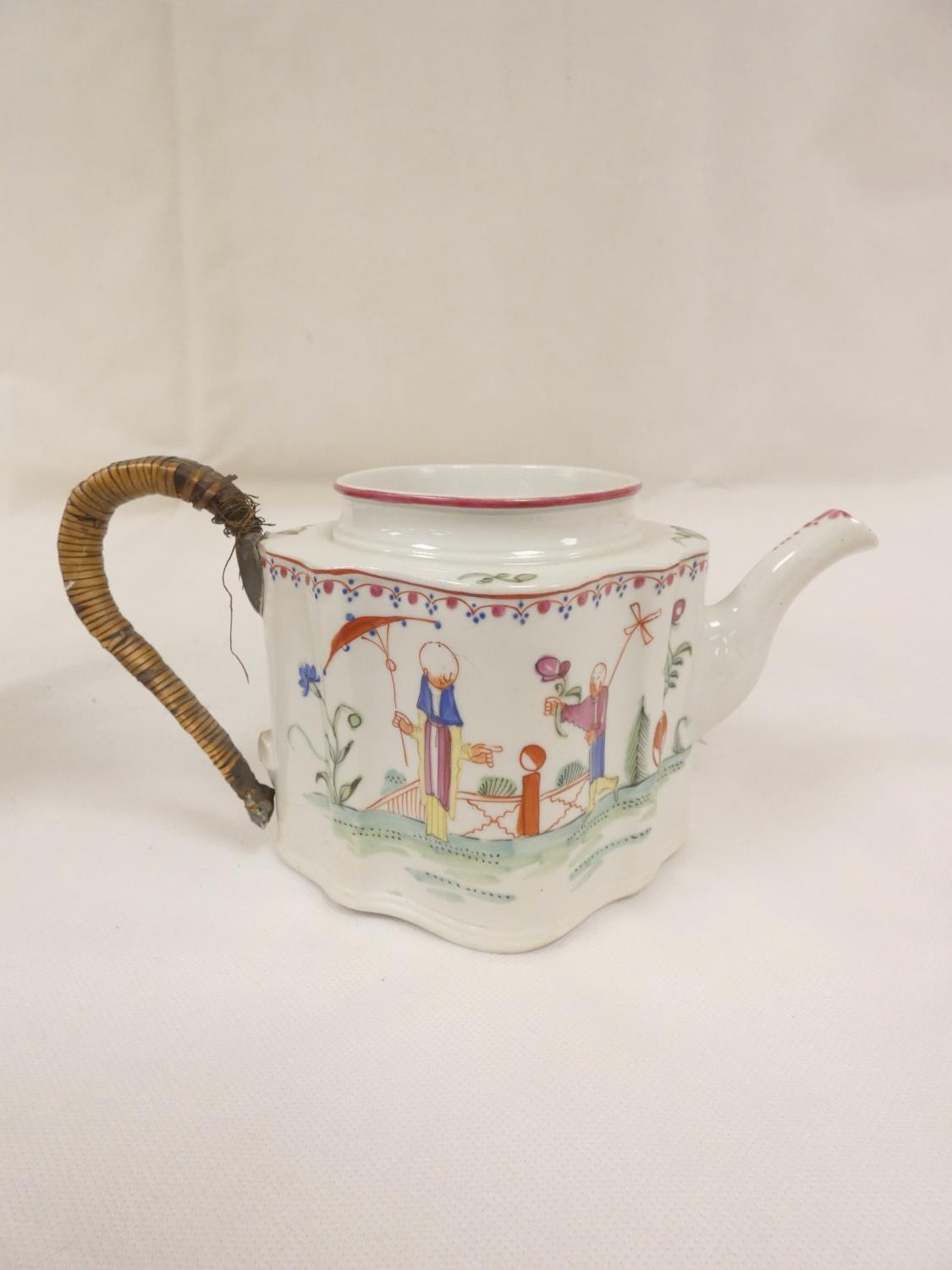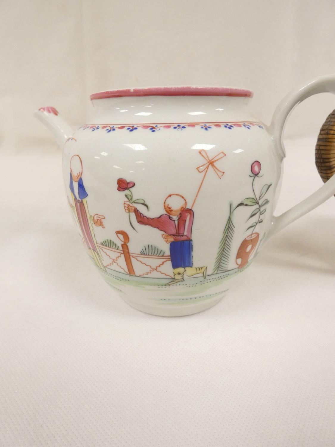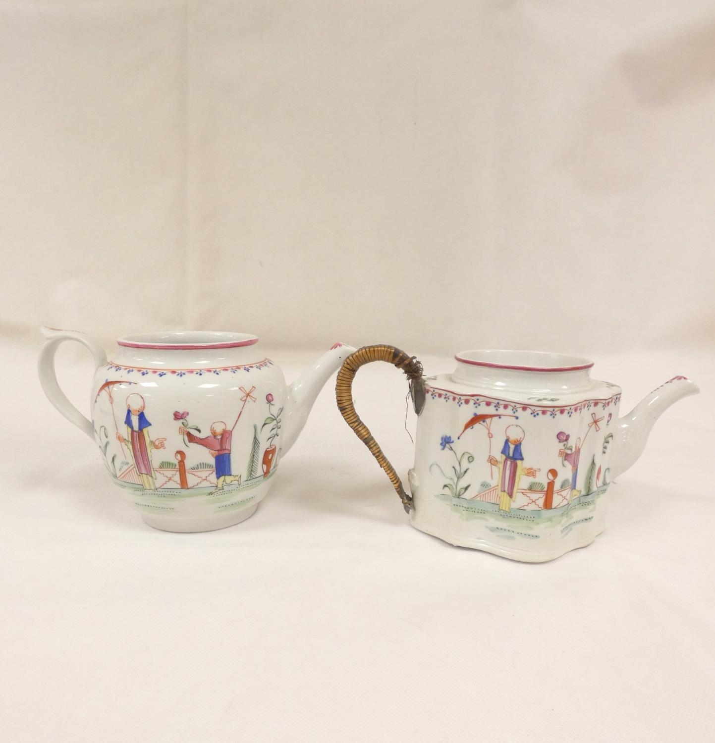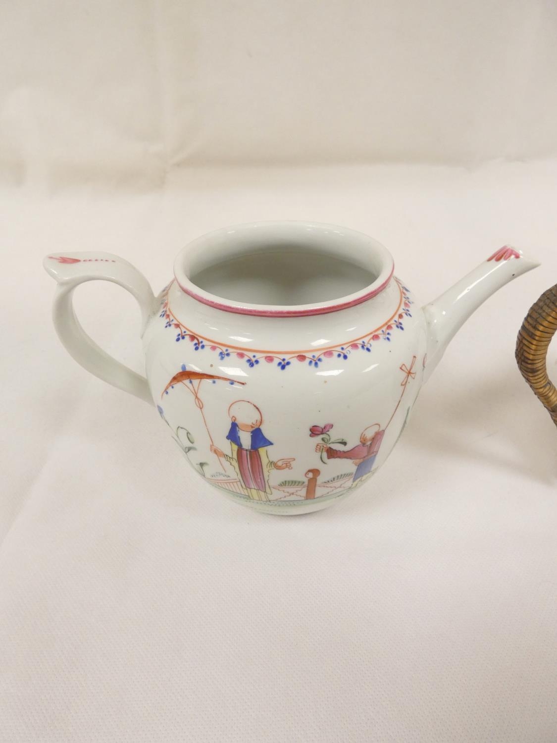 New Hall silver shape teapot of smaller size, very rare transitional version with rosette feet and curved spout with moulding, antique replacement wickerwork handle, pattern 20, Chinese figures with parasol and windmill, 12cm to the rim, c.1787/90; also New Hall teapot of spherical form in the same pattern. (2).