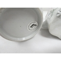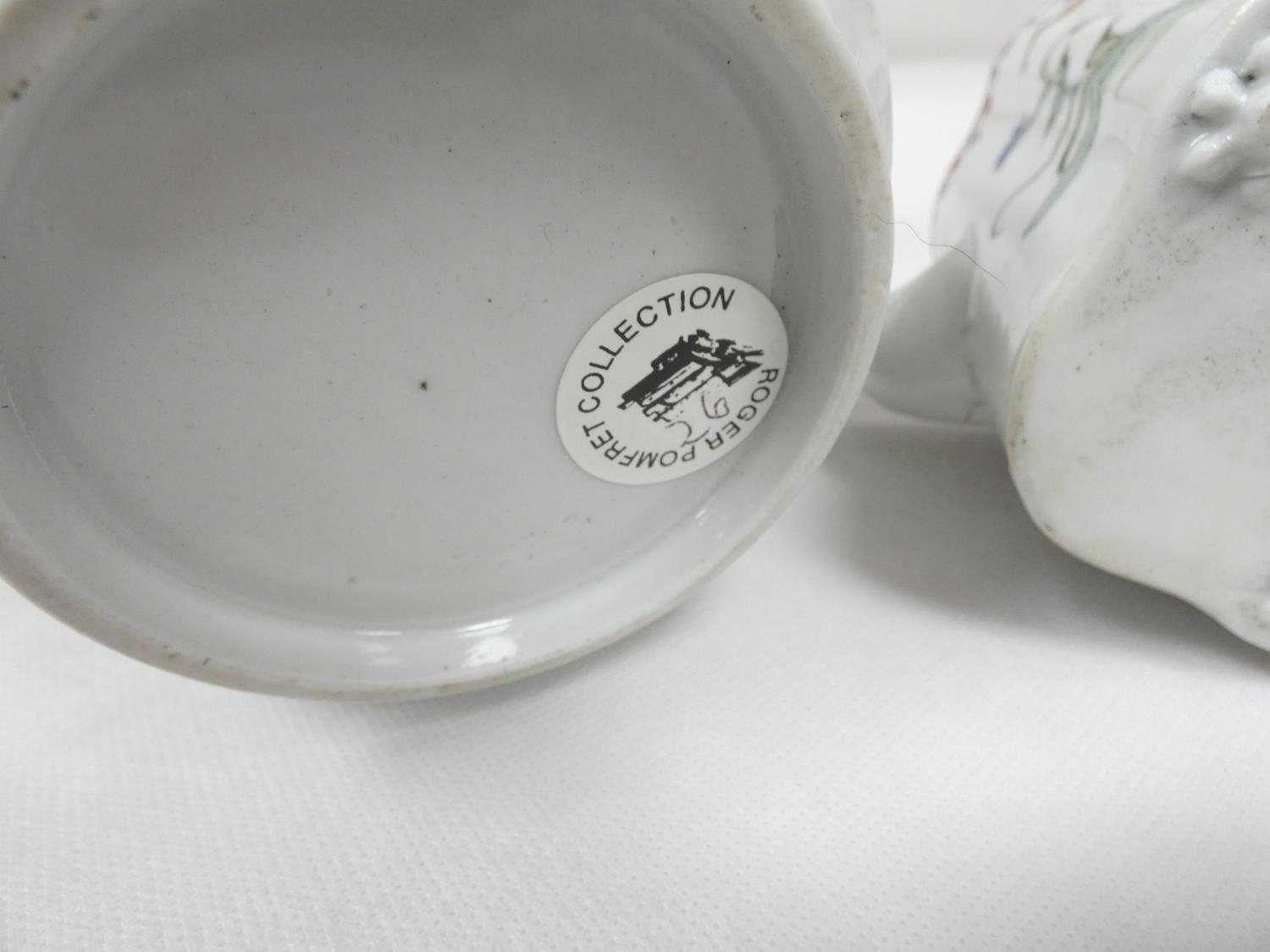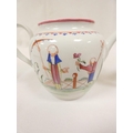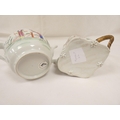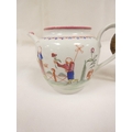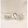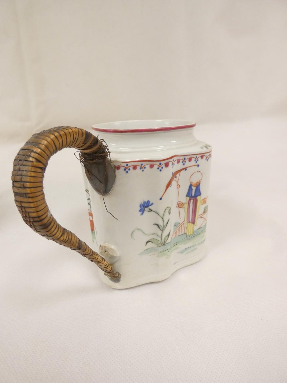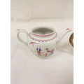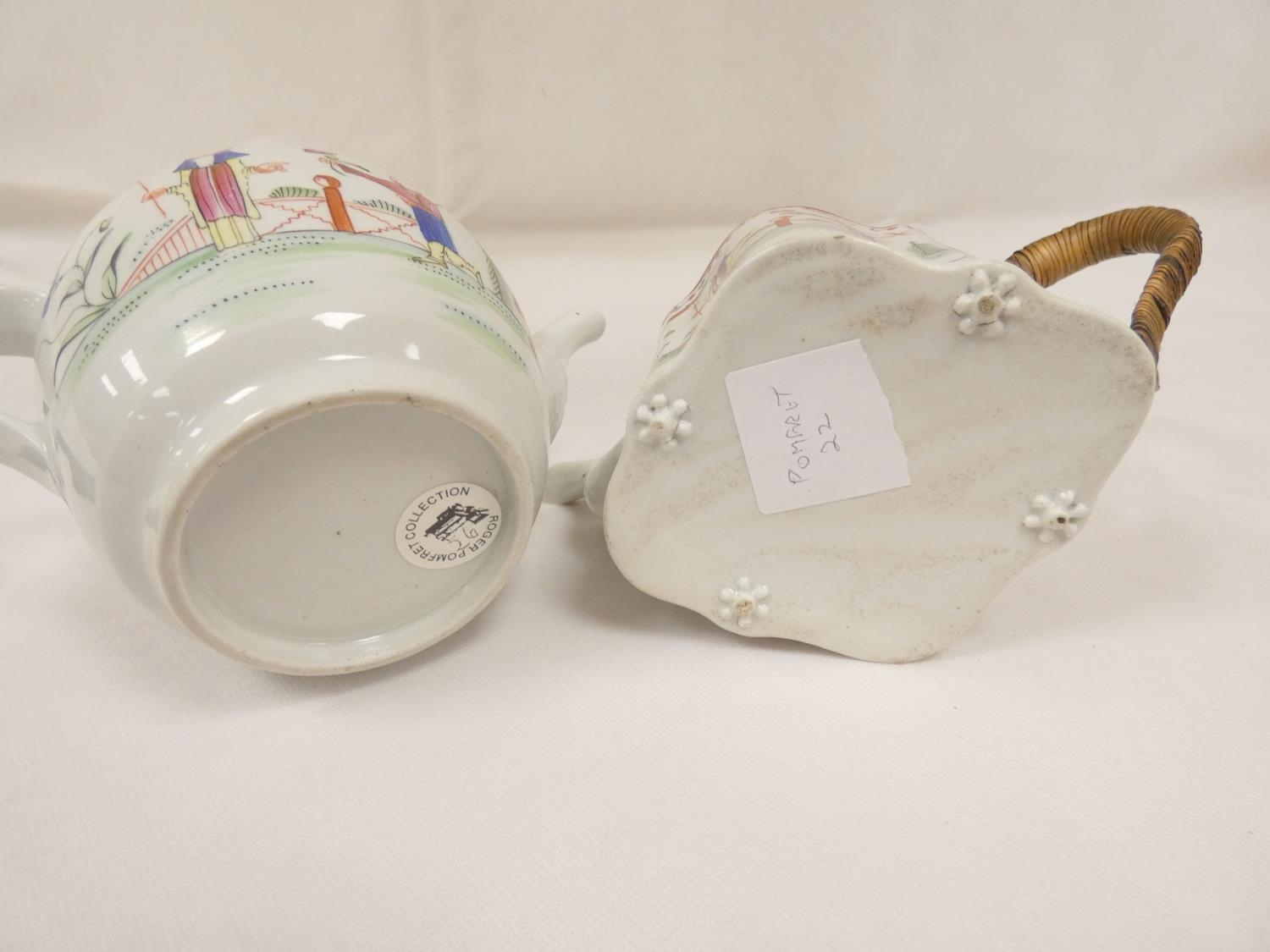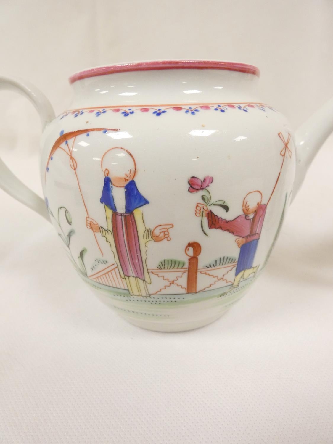 New Hall silver shape teapot of smaller size, very rare transitional version with rosette feet and curved spout with moulding, antique replacement wickerwork handle, pattern 20, Chinese figures with parasol and windmill, 12cm to the rim, c.1787/90; also New Hall teapot of spherical form in the same pattern. (2).