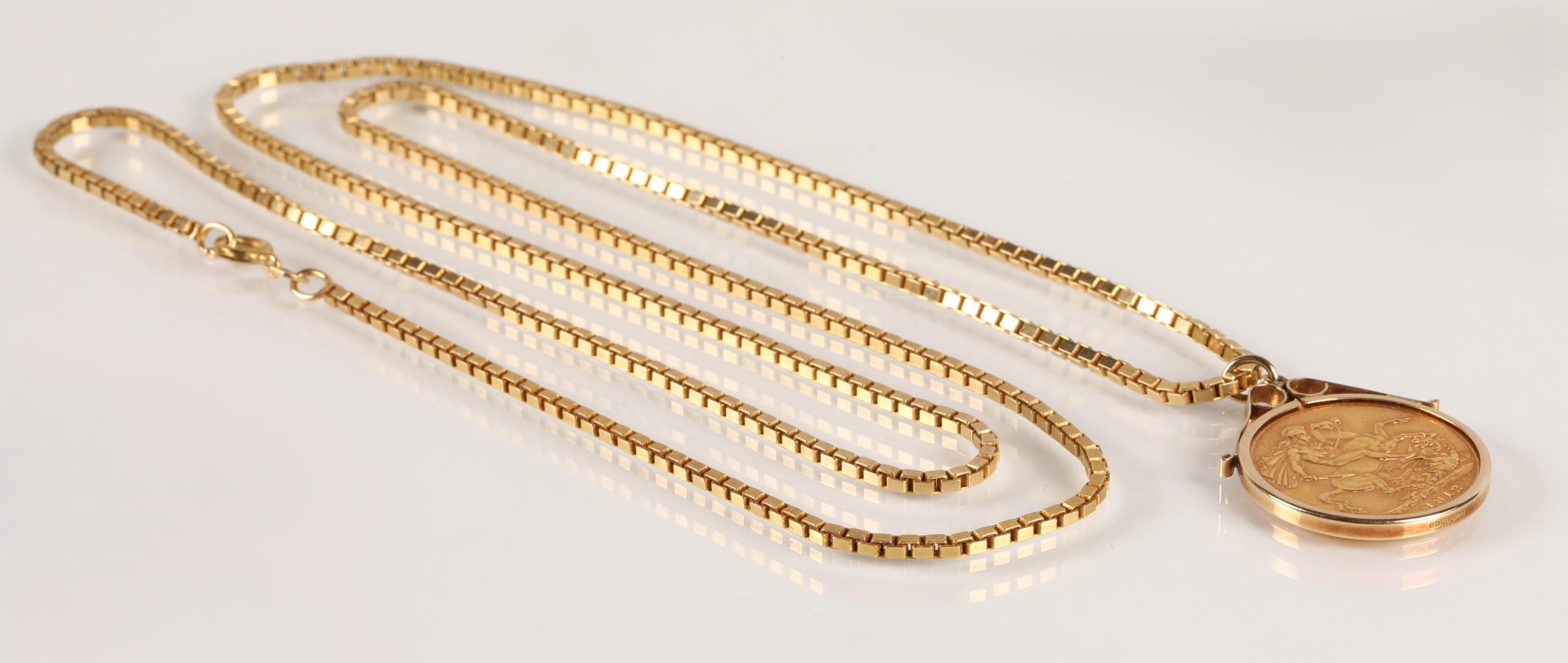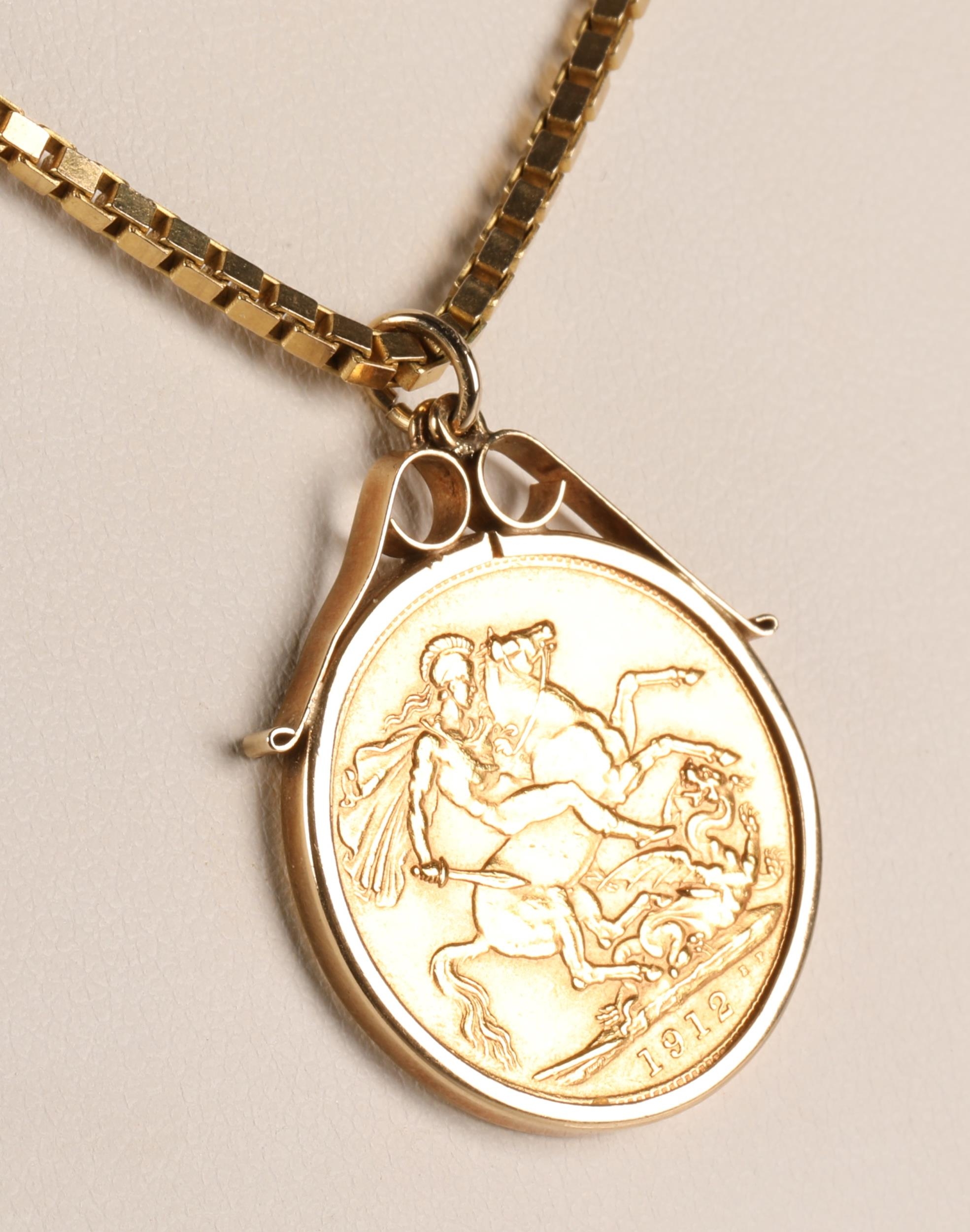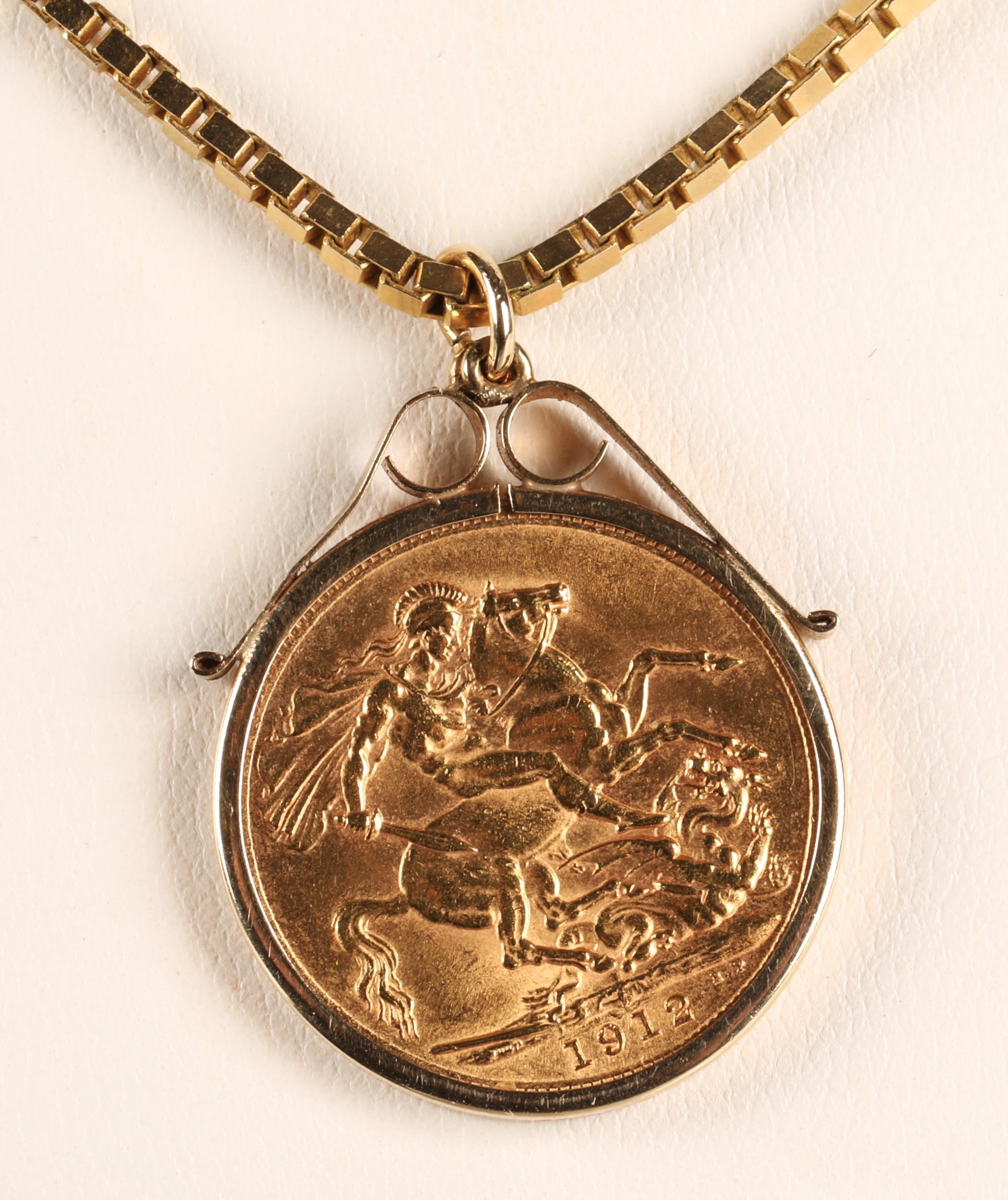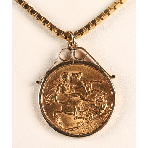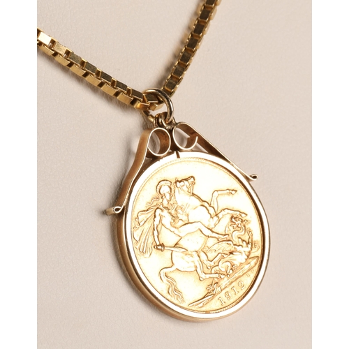 George V 1912 sovereign in a 9ct gold mount, on 9ct gold box chain. Gross weight 24.8g