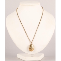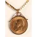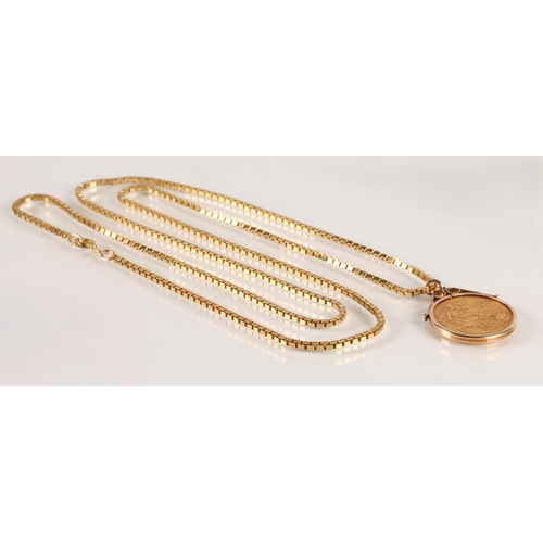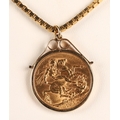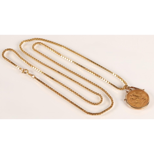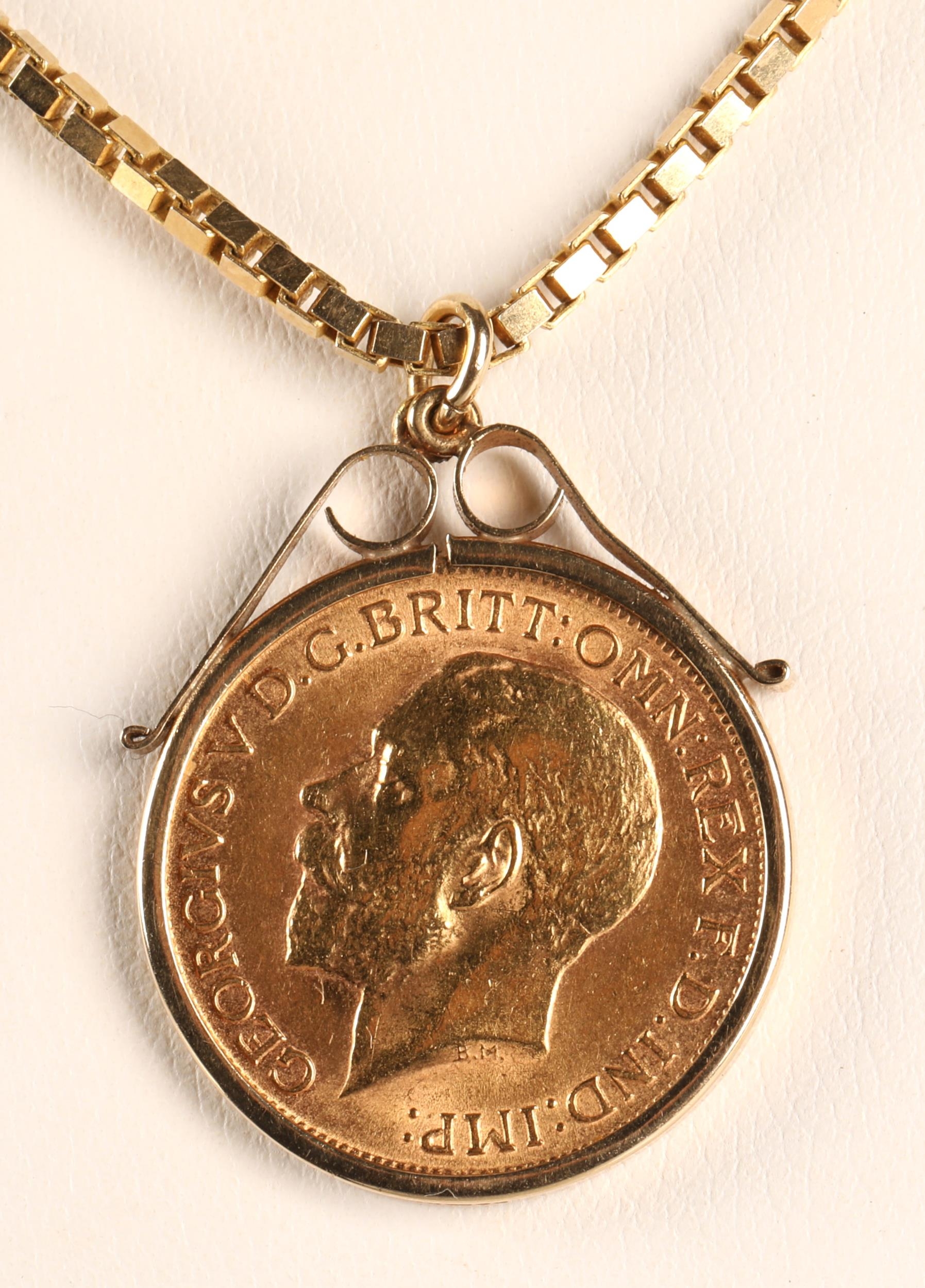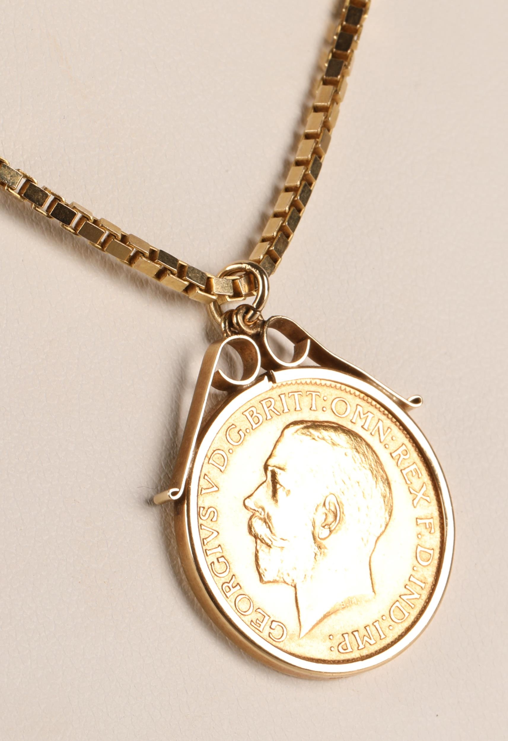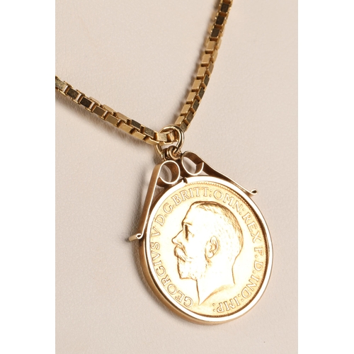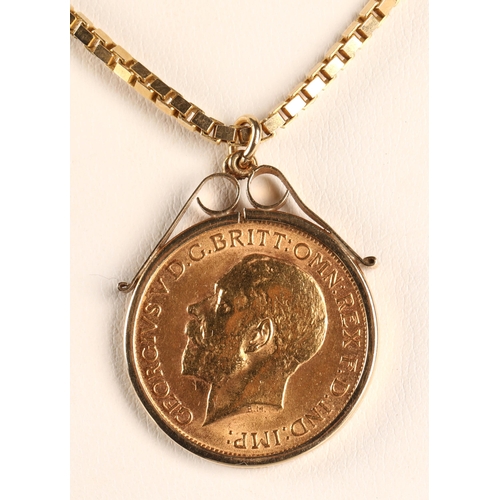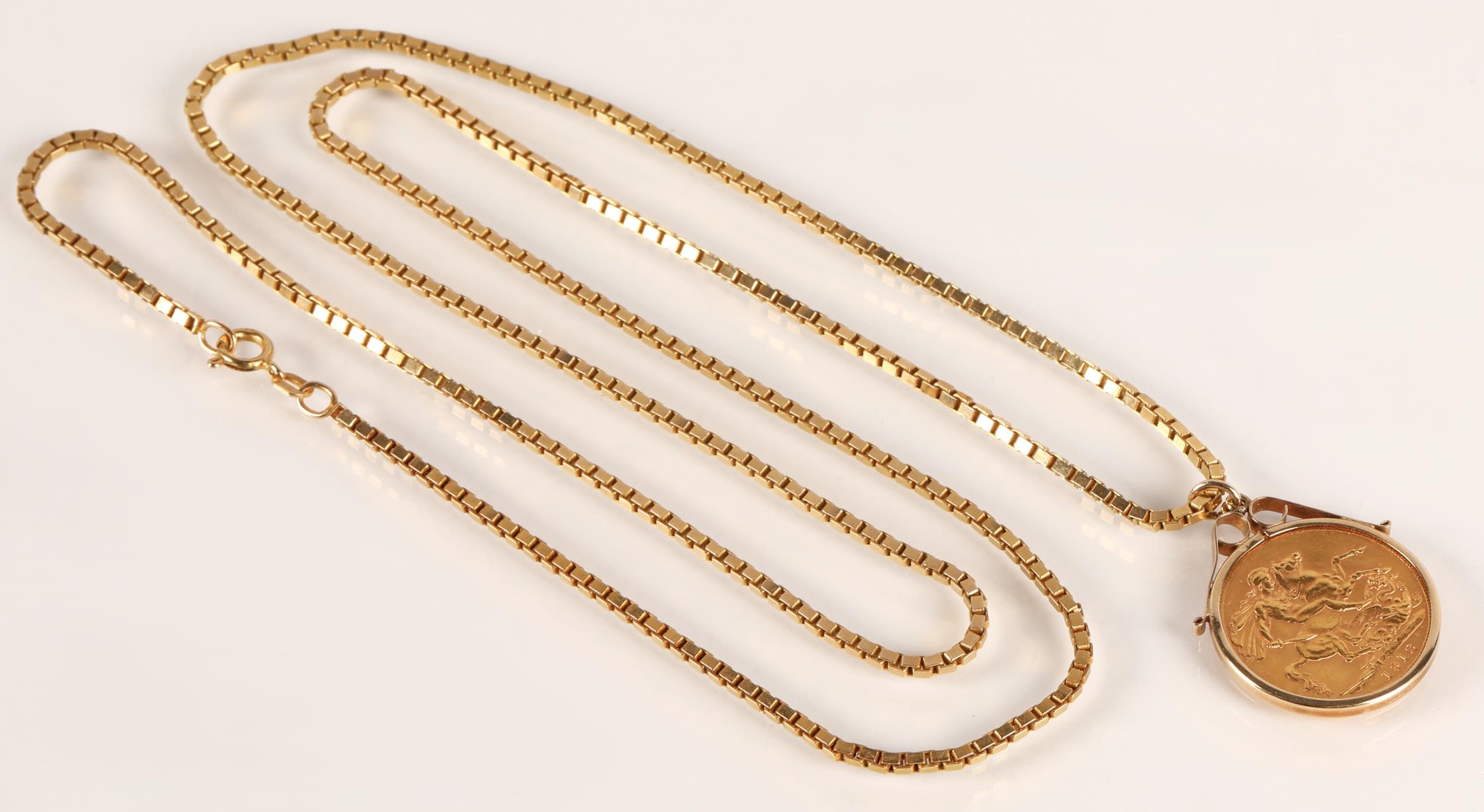 George V 1912 sovereign in a 9ct gold mount, on 9ct gold box chain. Gross weight 24.8g