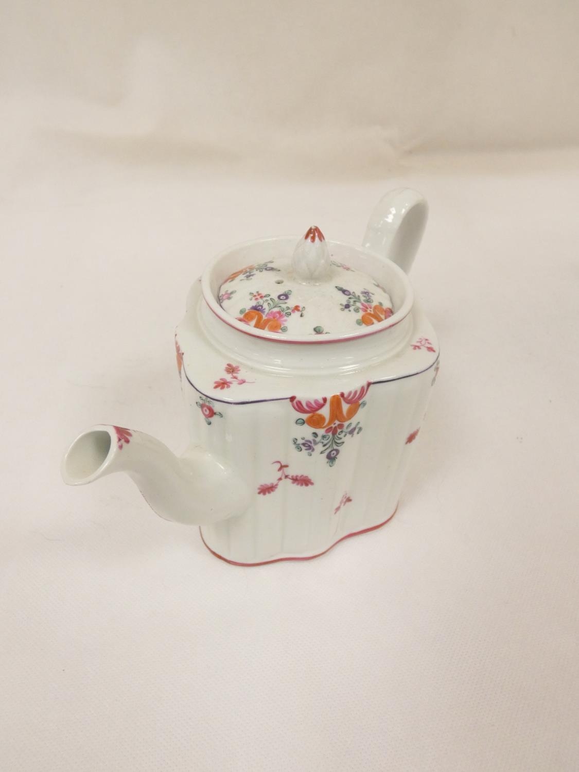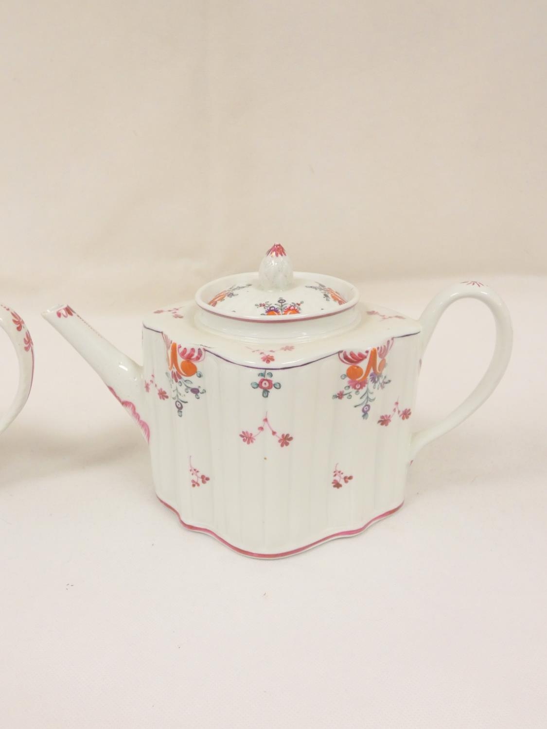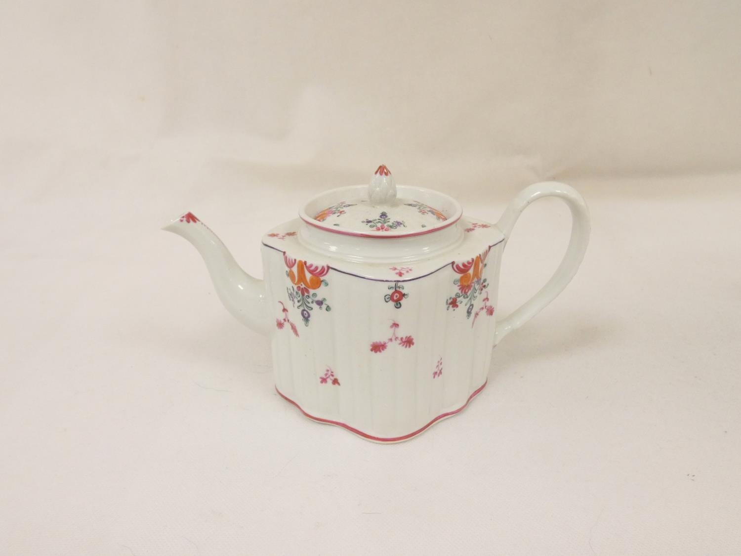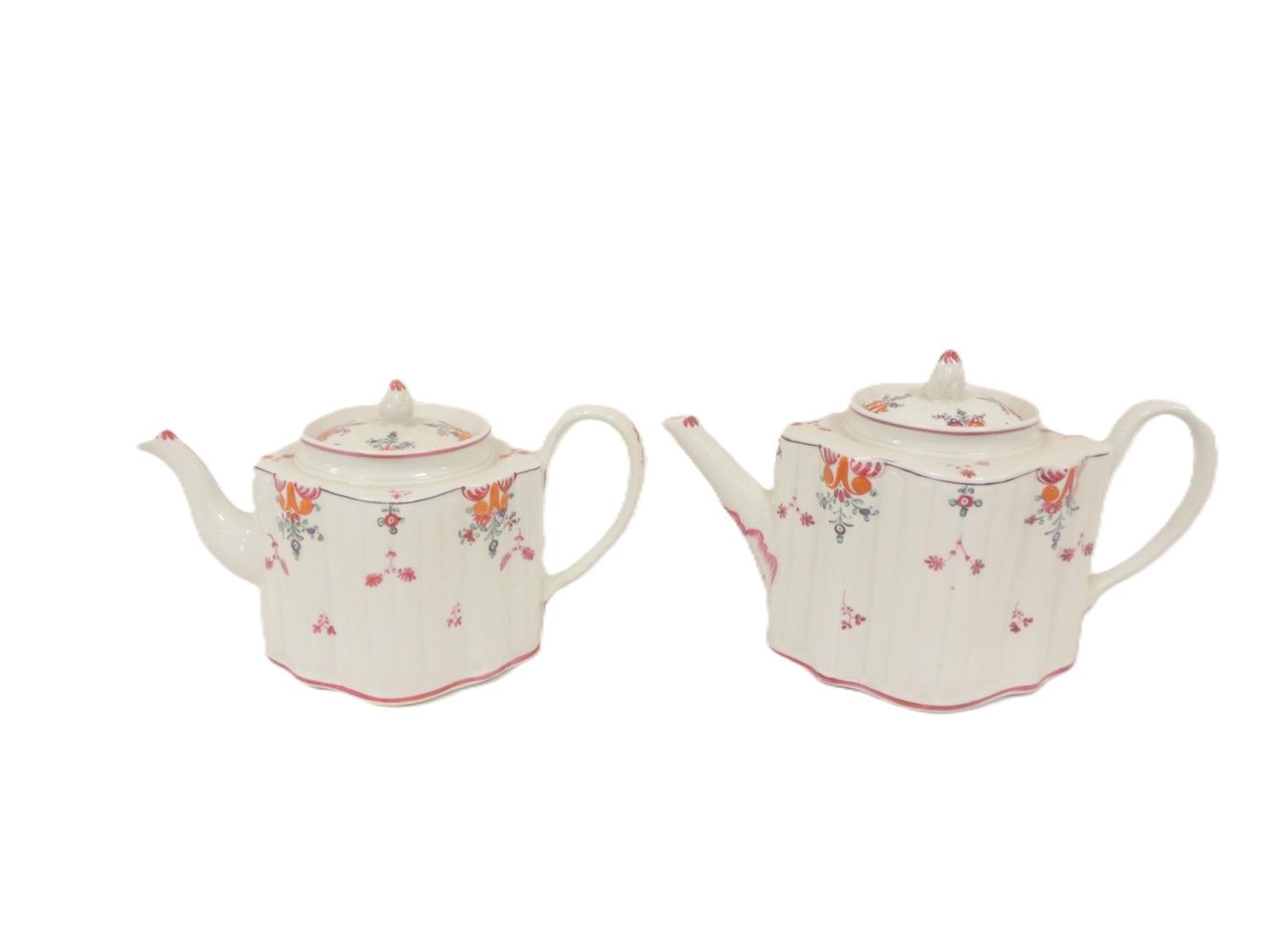 Graduated near pair of New Hall teapots, each decorated with floral sprays and iron-red leaves (pattern 121), of silver shape with herringbone handles and floral moulded feet, acorn finials, the larger with straight spout, the smaller with curved faceted spout. 14cm and 16cm high, c.1790's. (2).