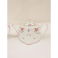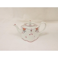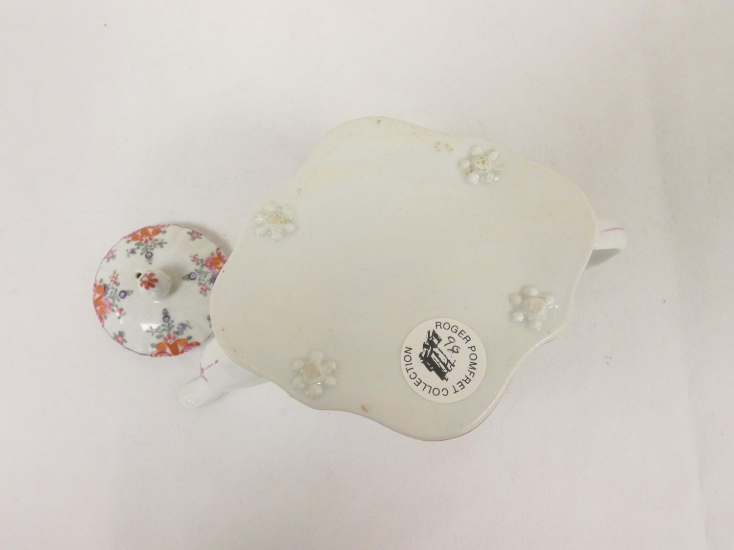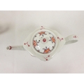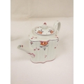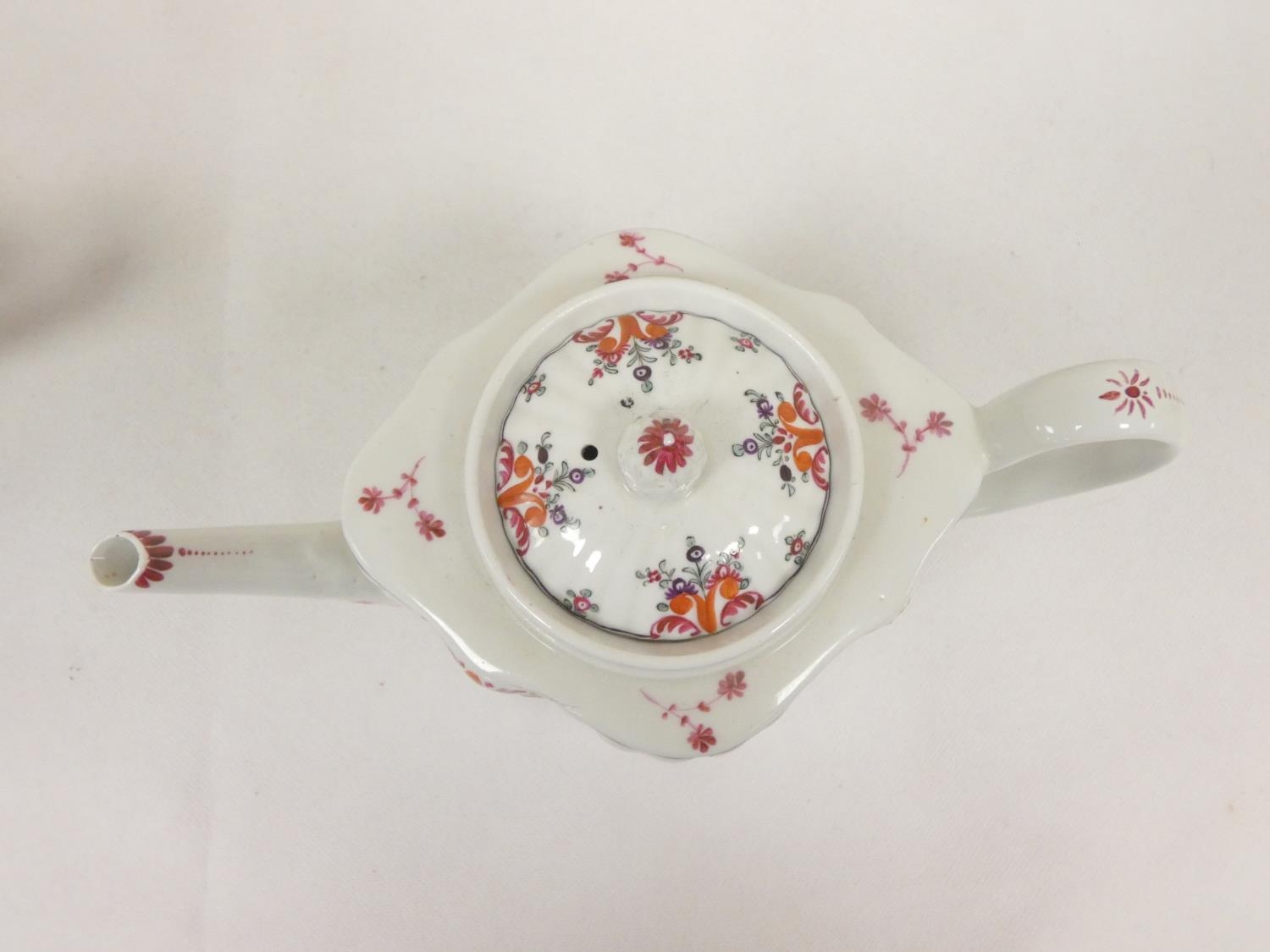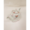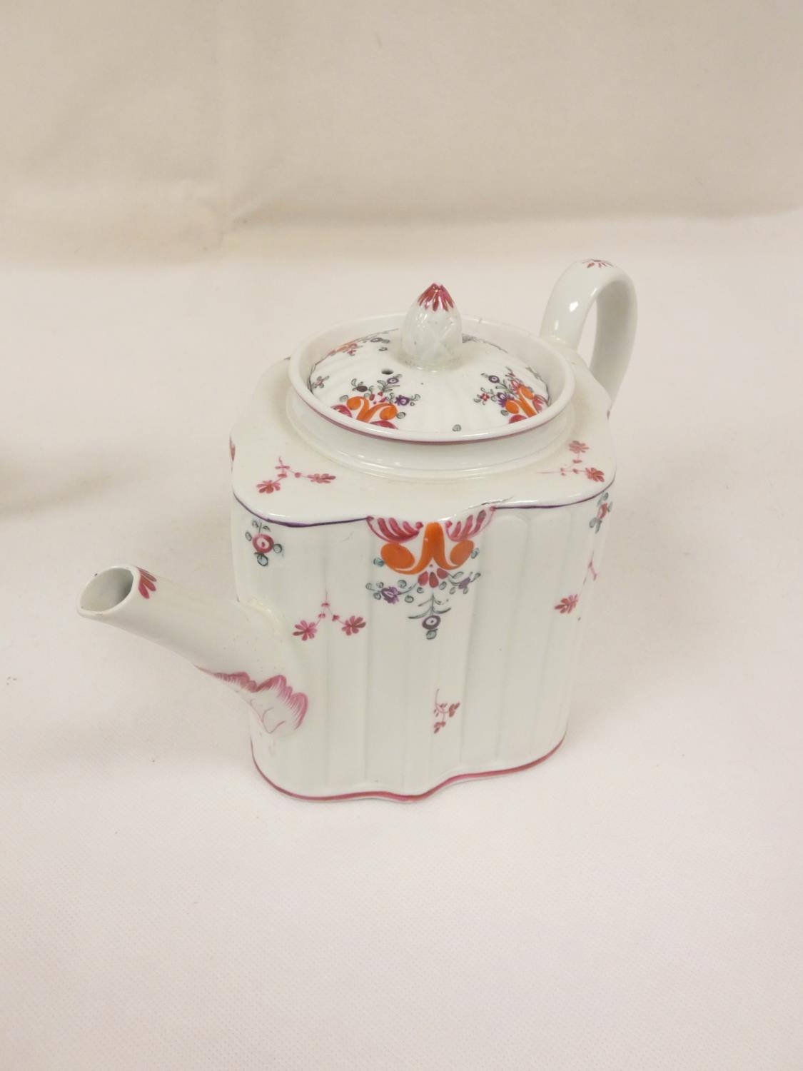 Graduated near pair of New Hall teapots, each decorated with floral sprays and iron-red leaves (pattern 121), of silver shape with herringbone handles and floral moulded feet, acorn finials, the larger with straight spout, the smaller with curved faceted spout. 14cm and 16cm high, c.1790's. (2).