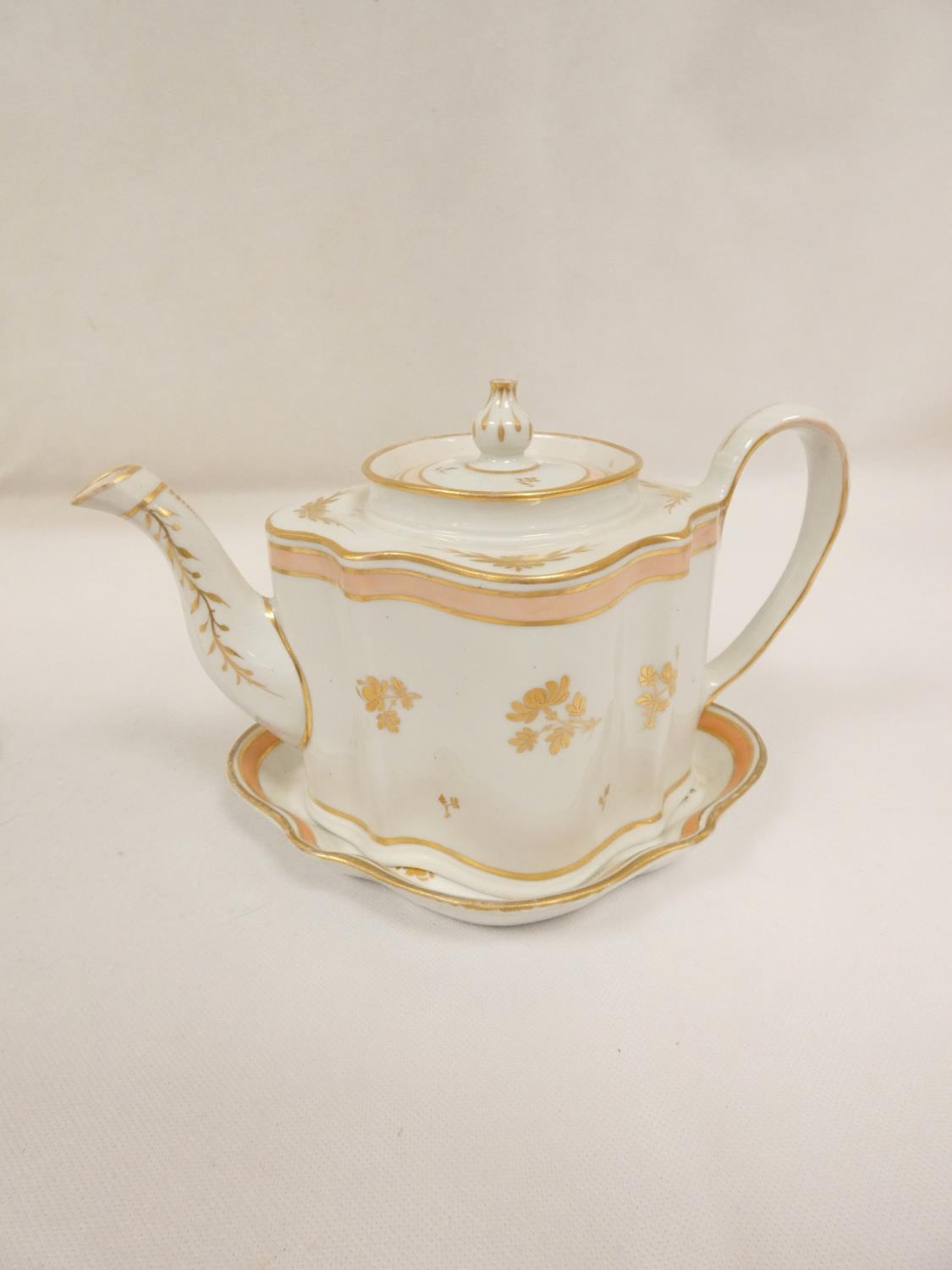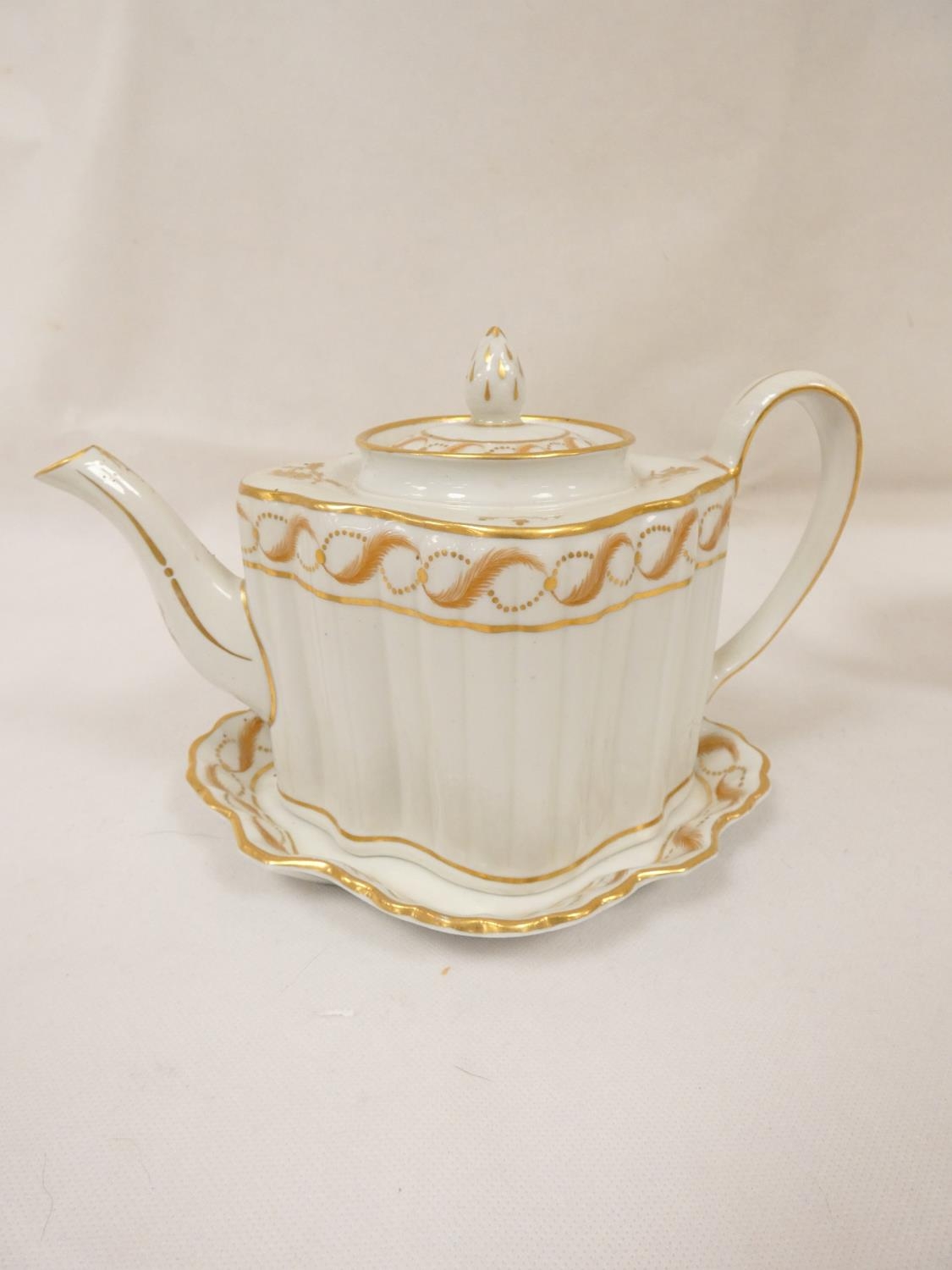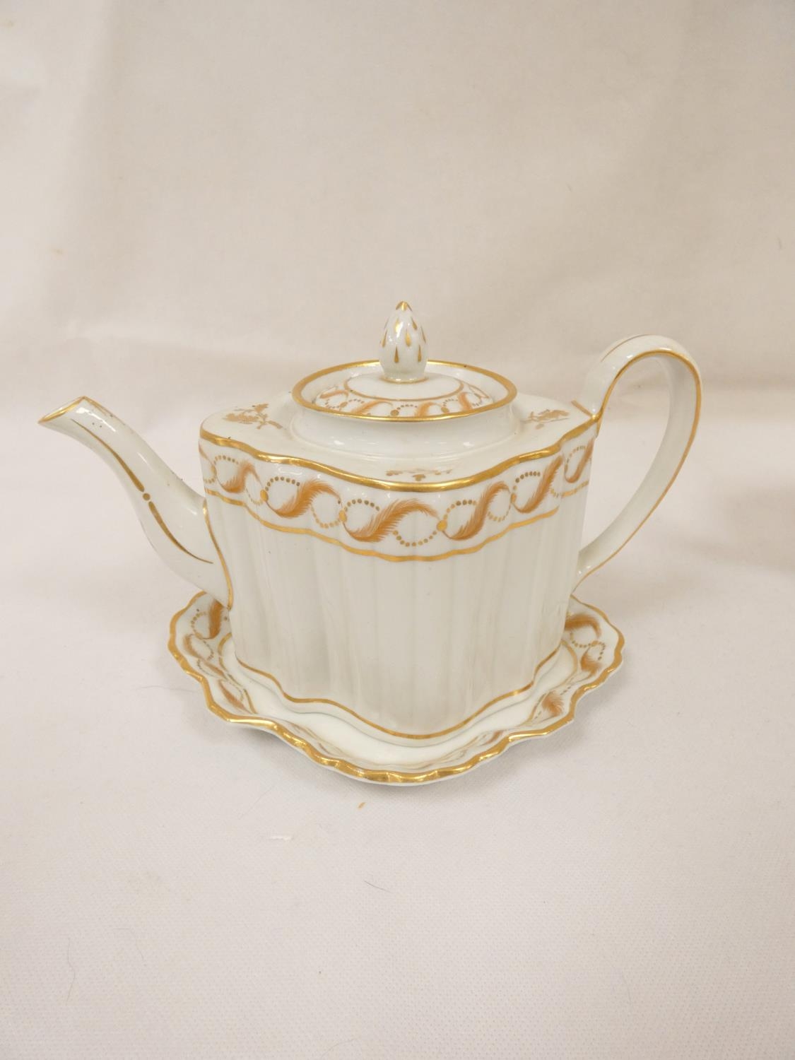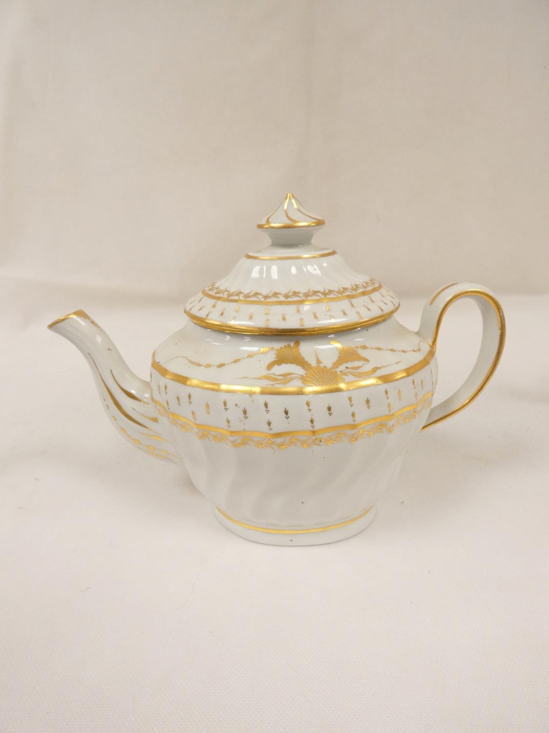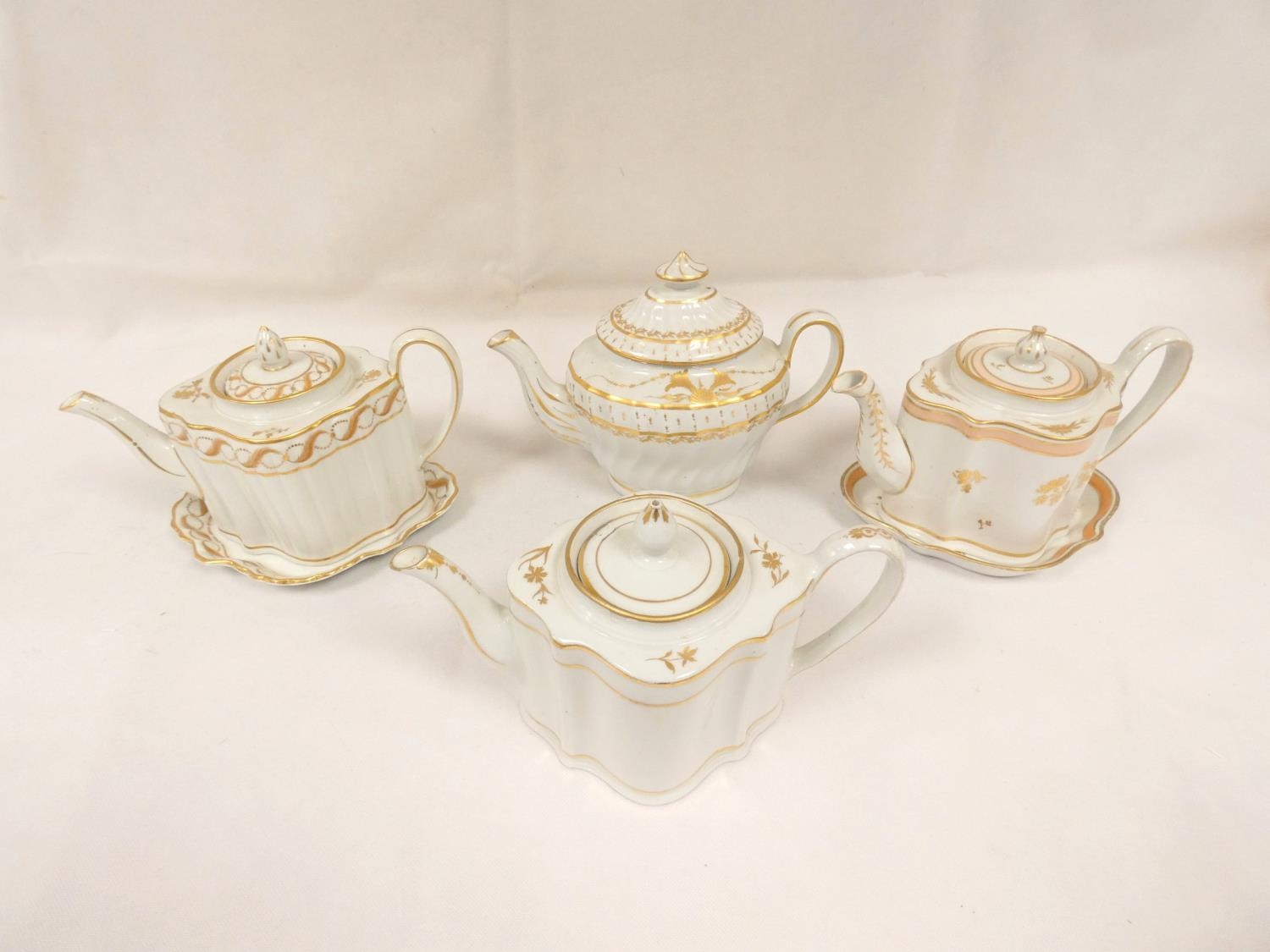 New Hall teapot of silver shape with reeded body and semi-wide loop handle, with matching stand. Pattern 142 with feather and dot scroll bands, 15cm high; also another New Hall silver shape teapot on stand, pattern 167 with gilt sprays and pink banding, c.1793/96; a gilt decorated New Hall teapot of middle period transitional silver shape and a New Hall teapot of oval waisted form with spiral fluting, gilt pattern 198. (4).
