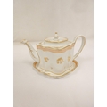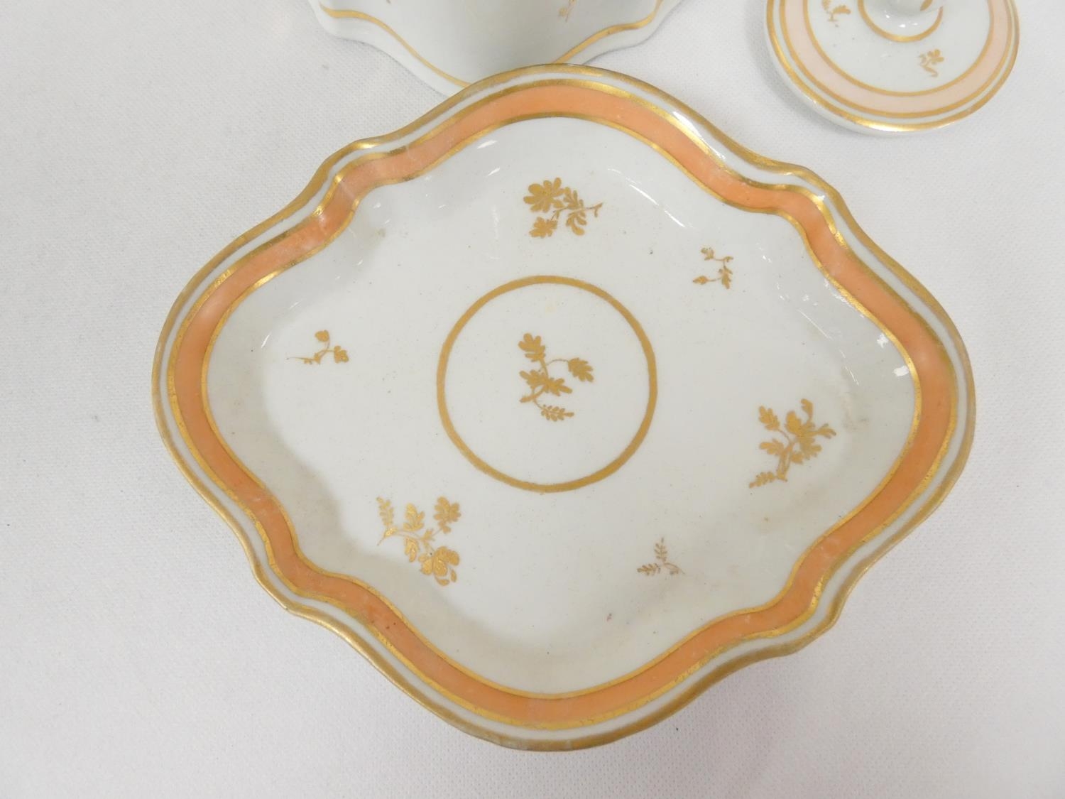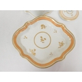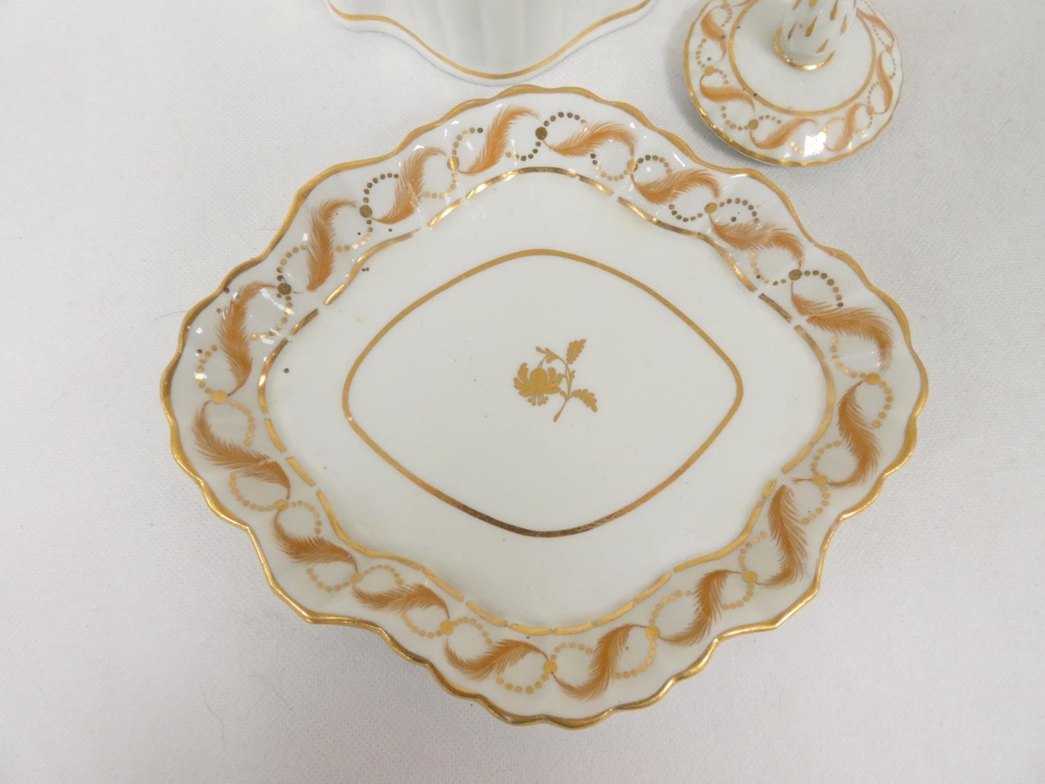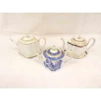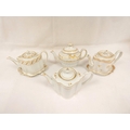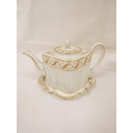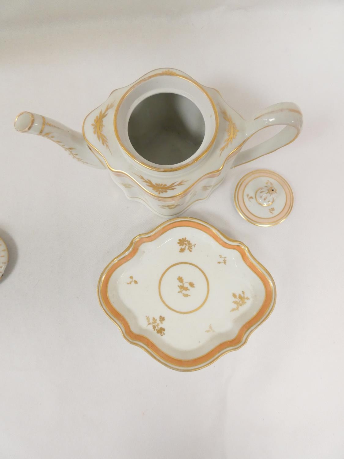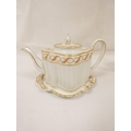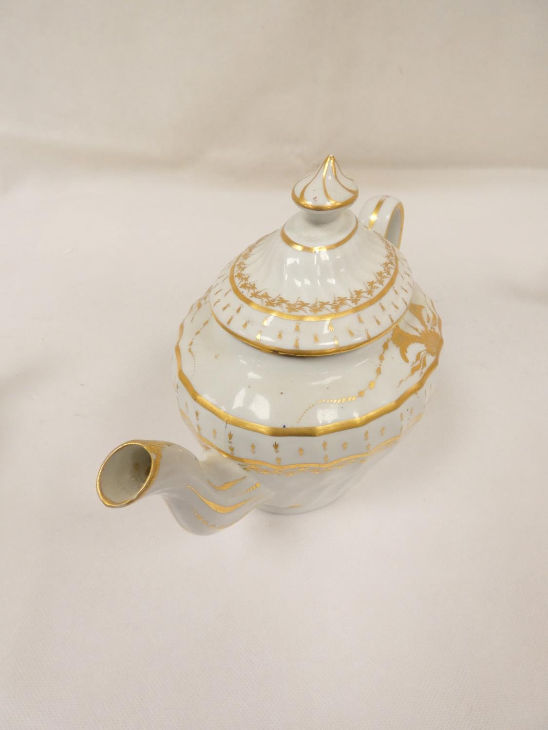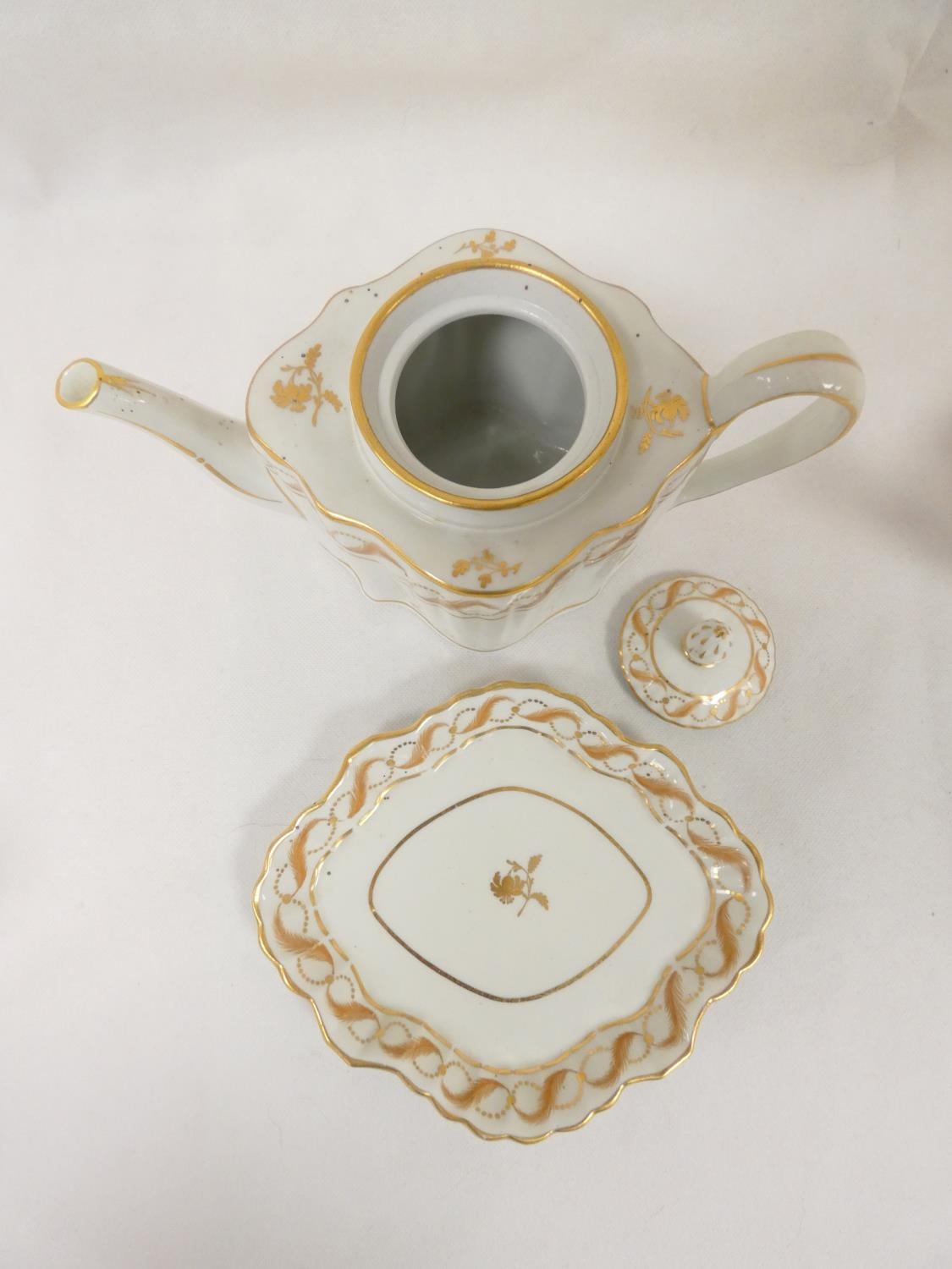 New Hall teapot of silver shape with reeded body and semi-wide loop handle, with matching stand. Pattern 142 with feather and dot scroll bands, 15cm high; also another New Hall silver shape teapot on stand, pattern 167 with gilt sprays and pink banding, c.1793/96; a gilt decorated New Hall teapot of middle period transitional silver shape and a New Hall teapot of oval waisted form with spiral fluting, gilt pattern 198. (4).