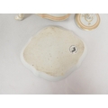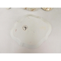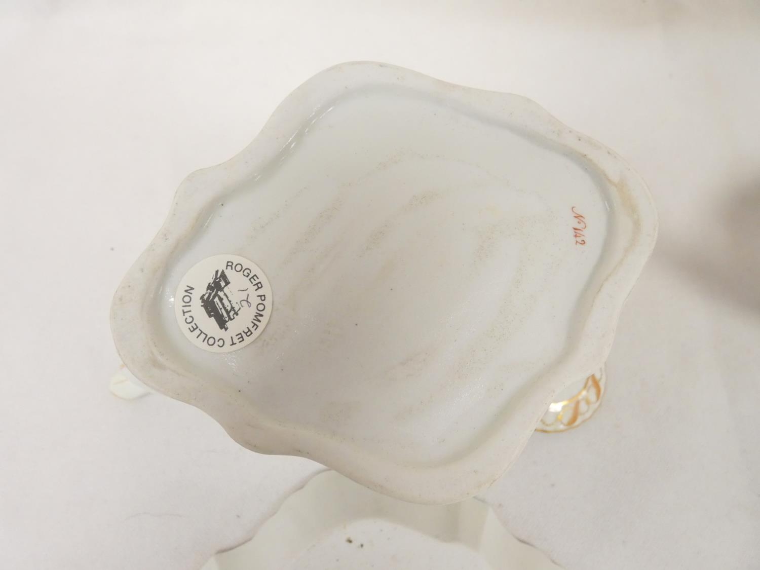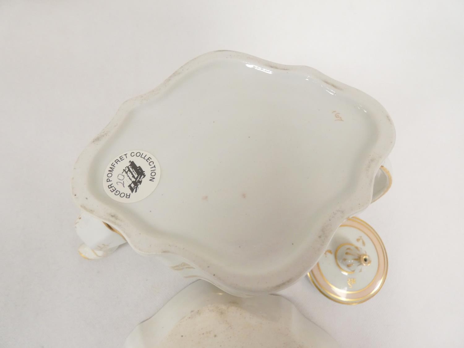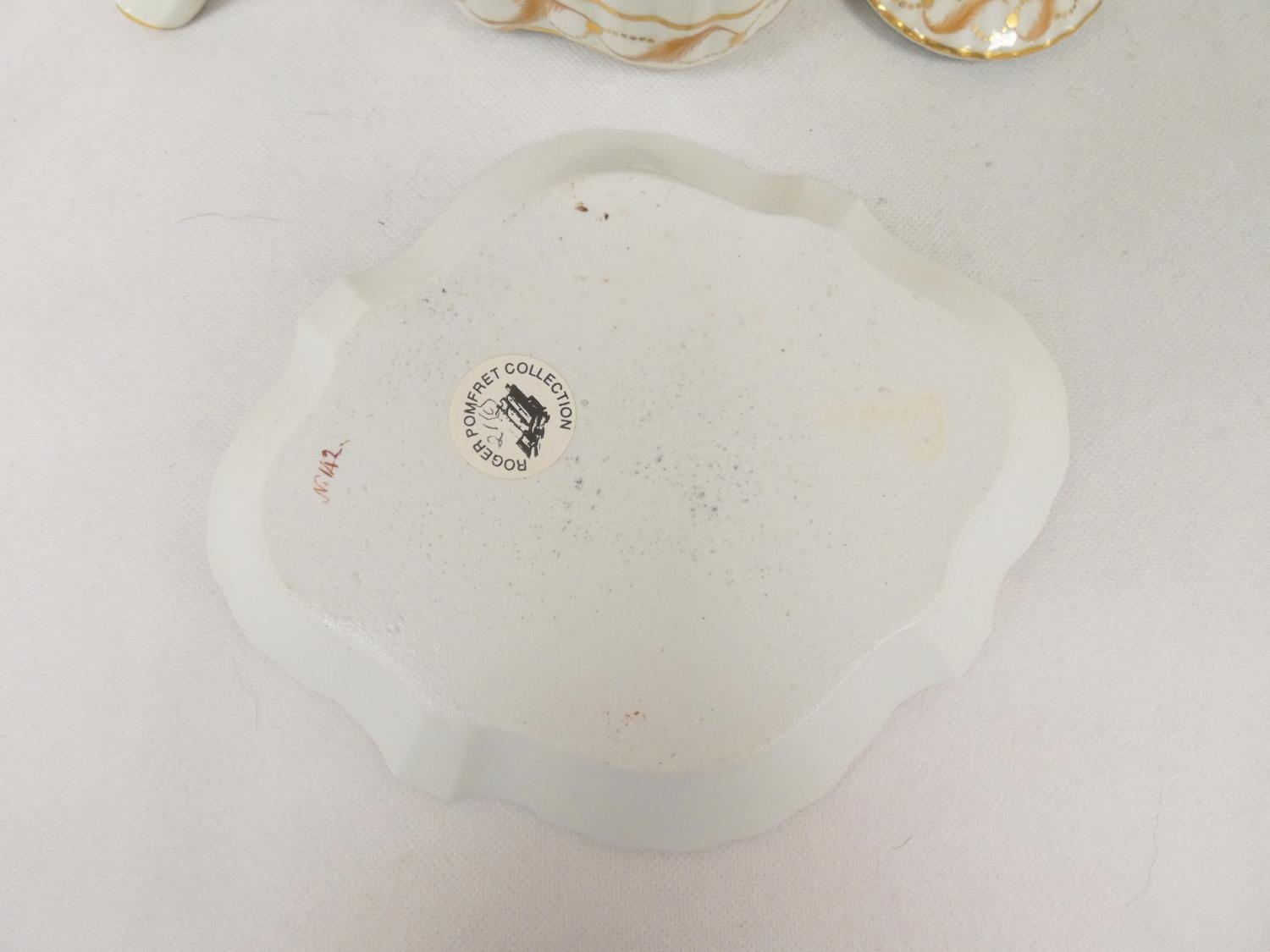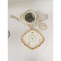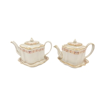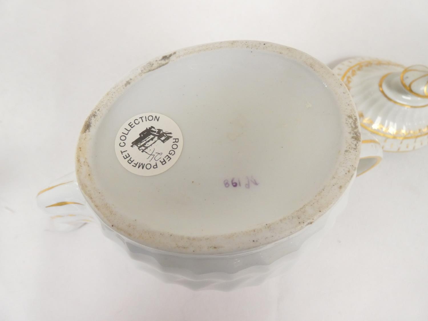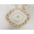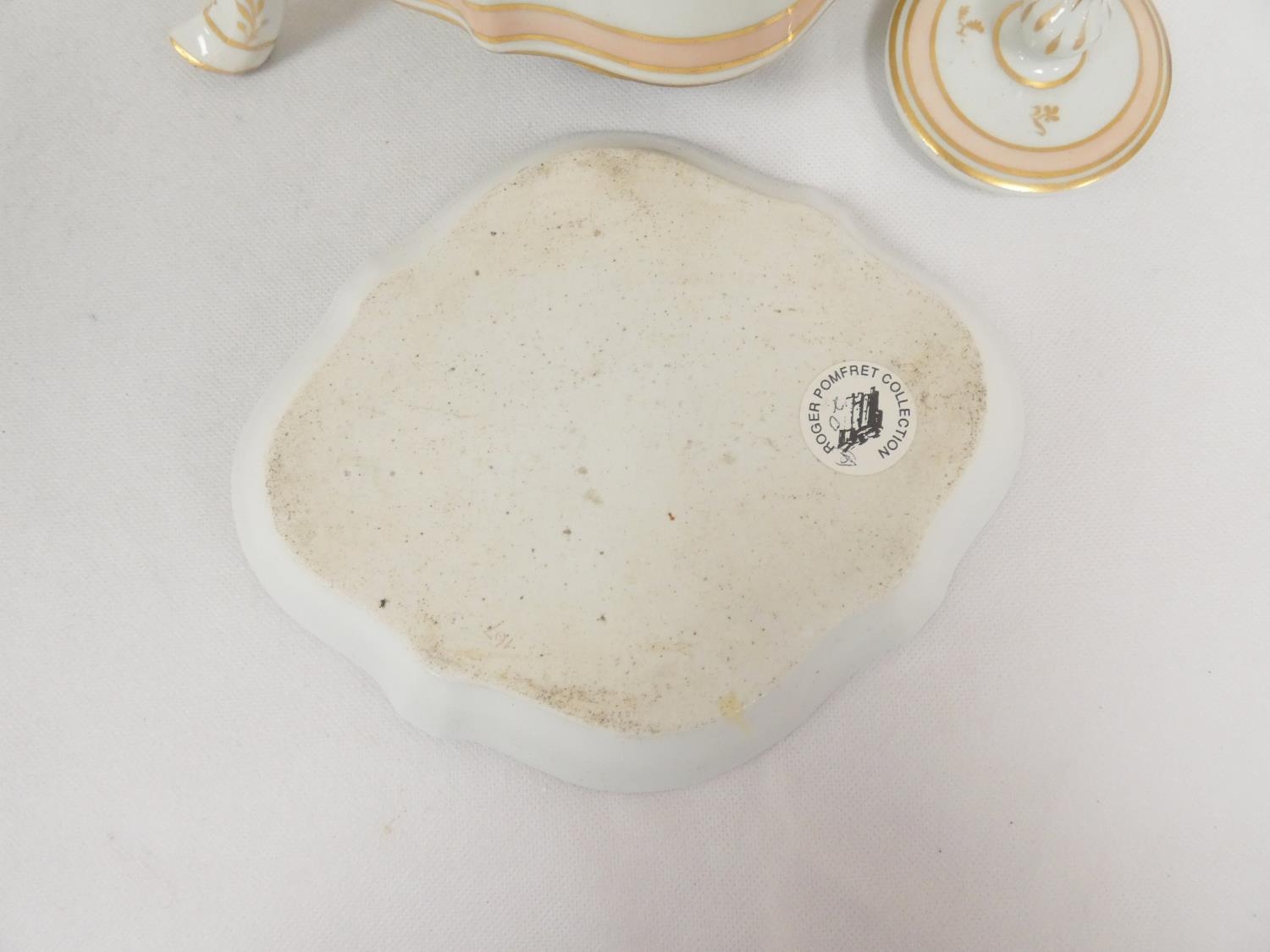 New Hall teapot of silver shape with reeded body and semi-wide loop handle, with matching stand. Pattern 142 with feather and dot scroll bands, 15cm high; also another New Hall silver shape teapot on stand, pattern 167 with gilt sprays and pink banding, c.1793/96; a gilt decorated New Hall teapot of middle period transitional silver shape and a New Hall teapot of oval waisted form with spiral fluting, gilt pattern 198. (4).