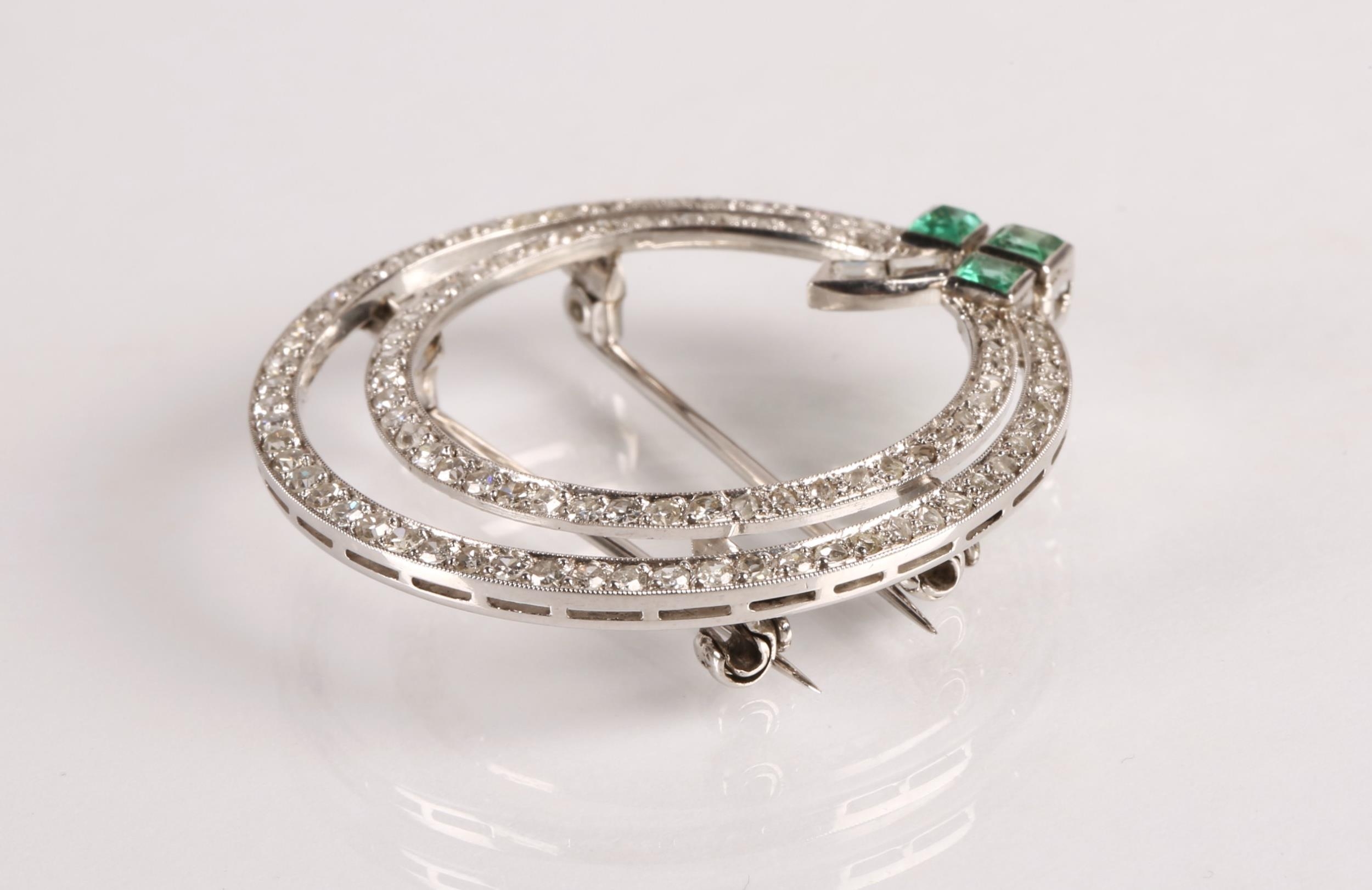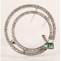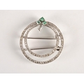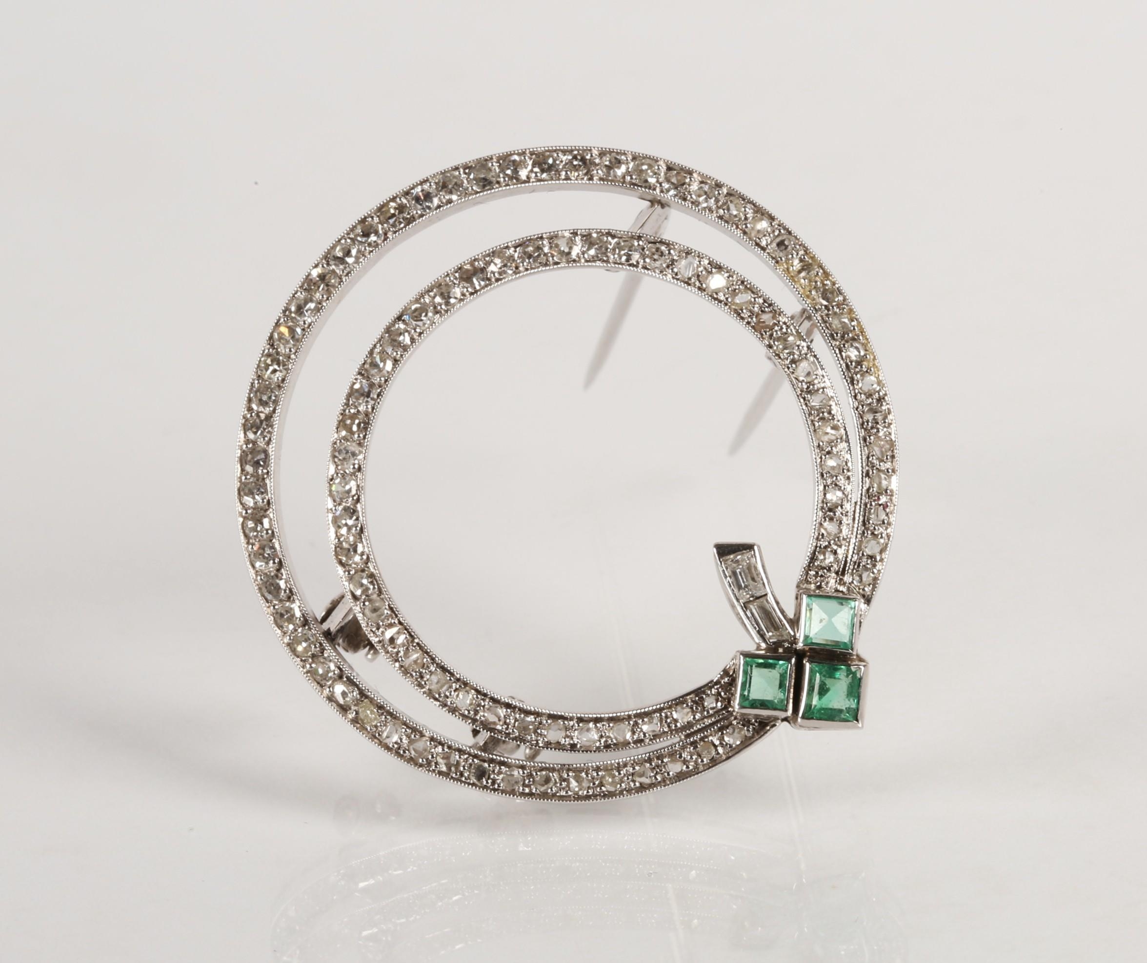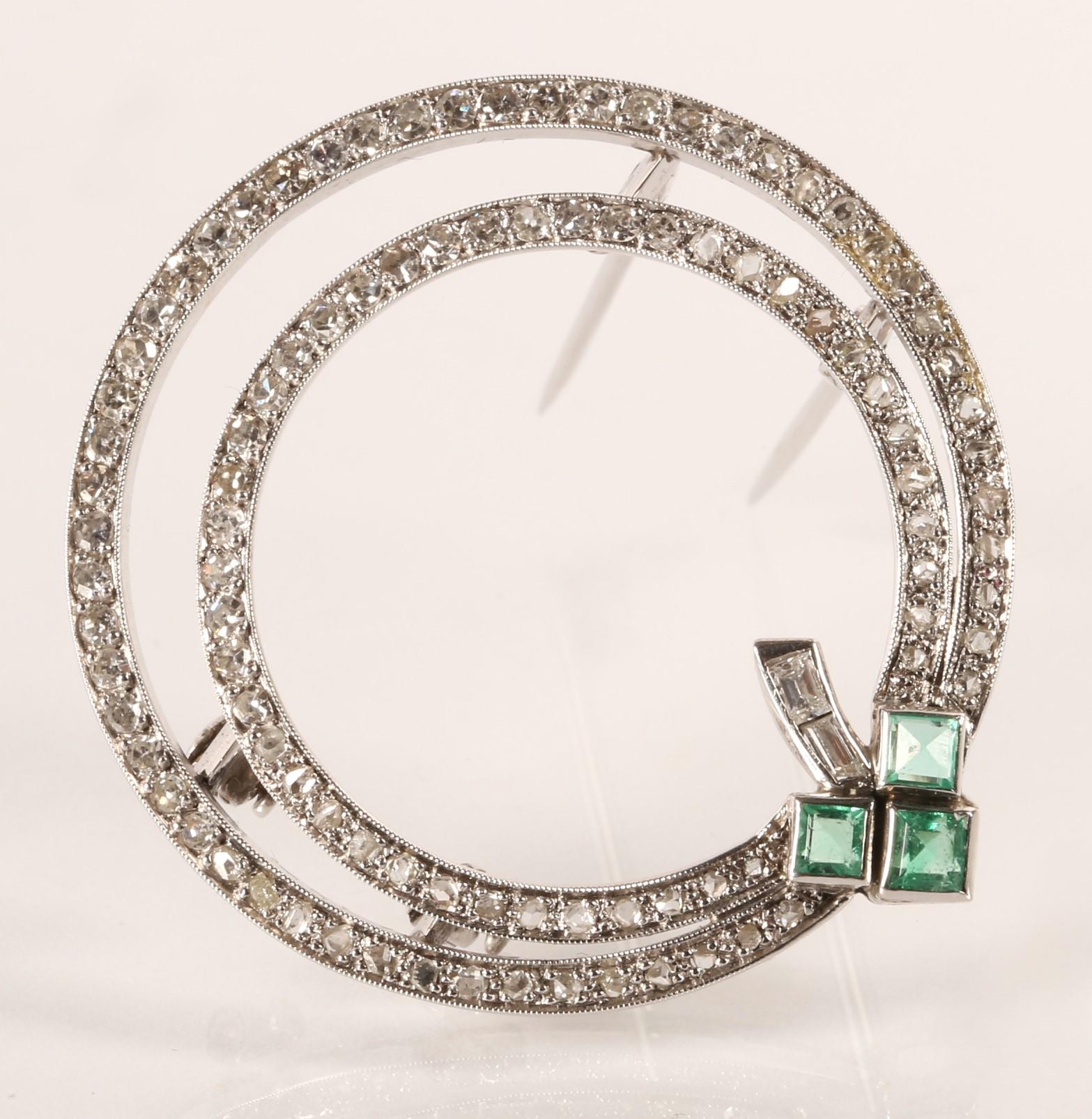 Attractive diamond and emerald concentric brooch, set with a trefoil cluster of emerald cut emeralds and multiple small brilliants, on unmarked white gold, with safety pin, 3.5cm diameter, gross weight 10.1 grams