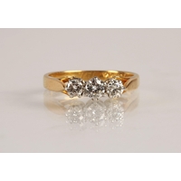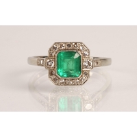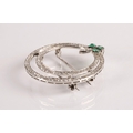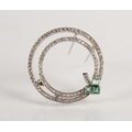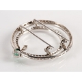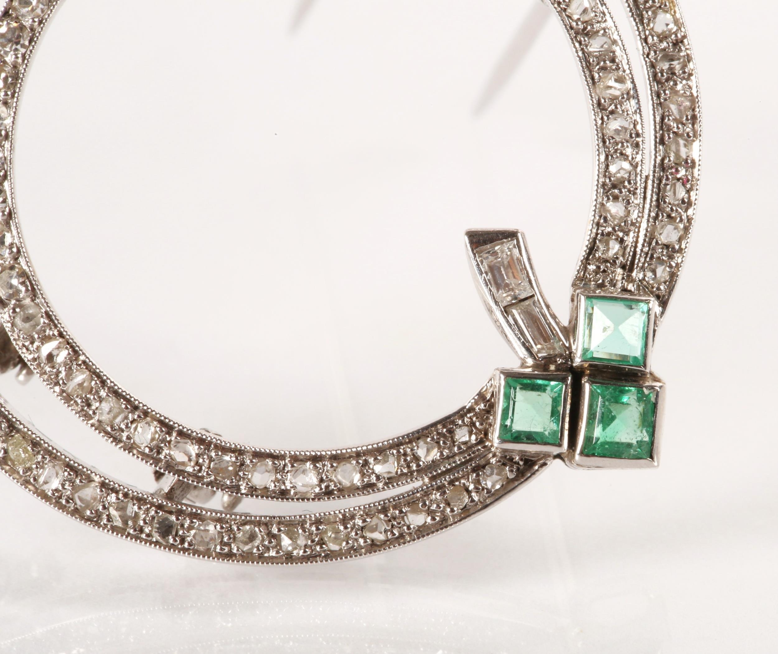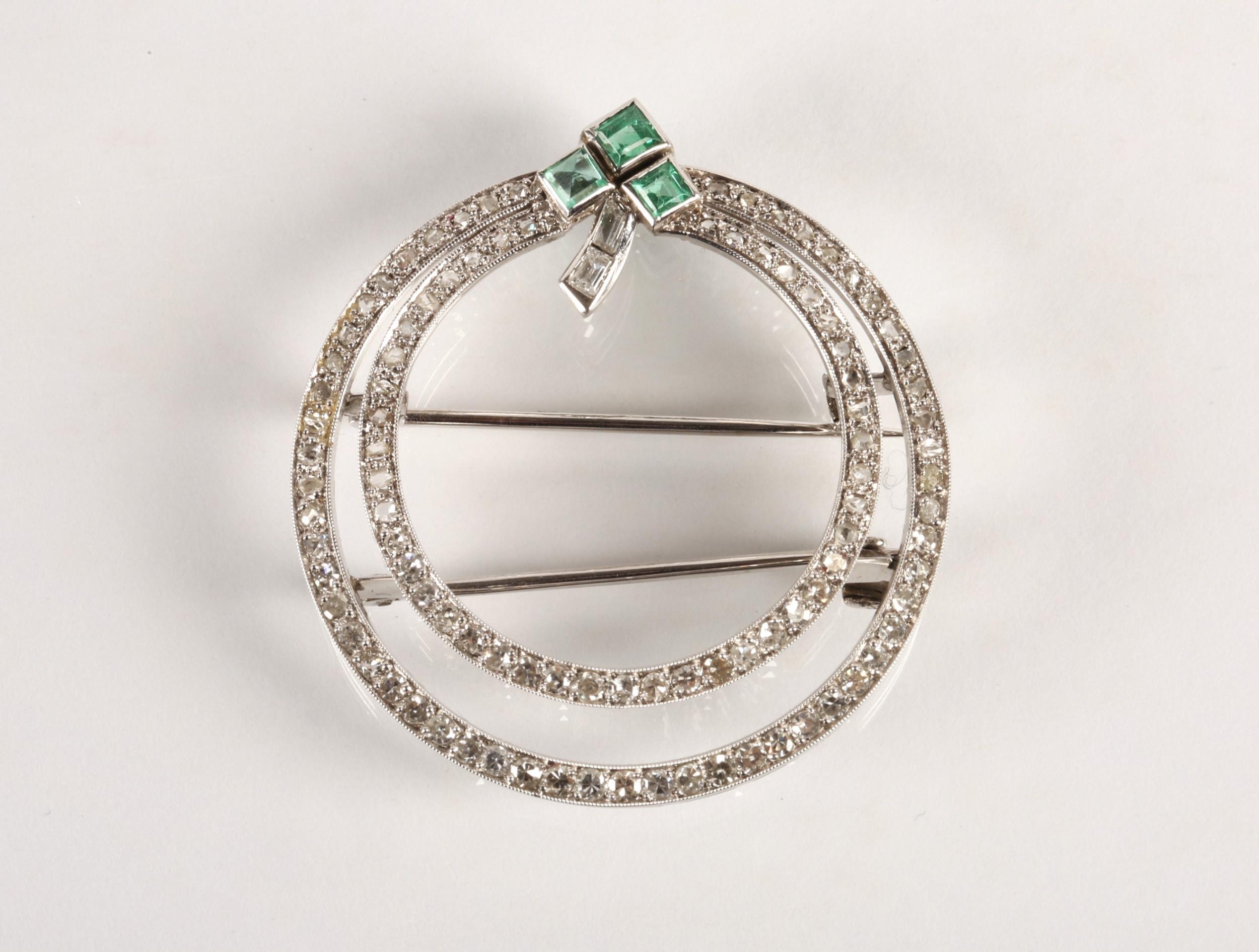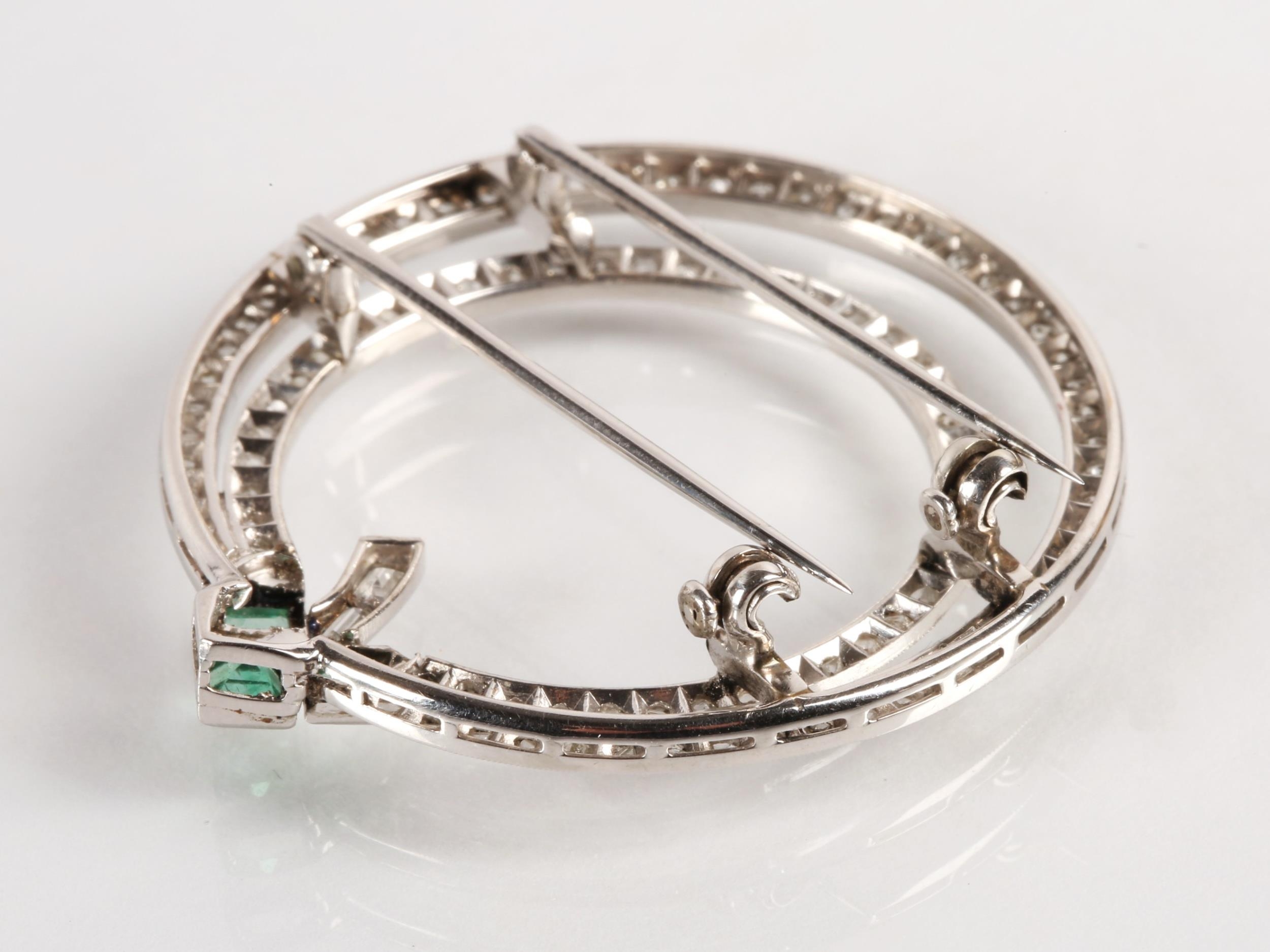 Attractive diamond and emerald concentric brooch, set with a trefoil cluster of emerald cut emeralds and multiple small brilliants, on unmarked white gold, with safety pin, 3.5cm diameter, gross weight 10.1 grams