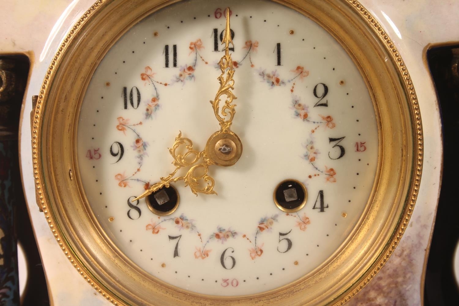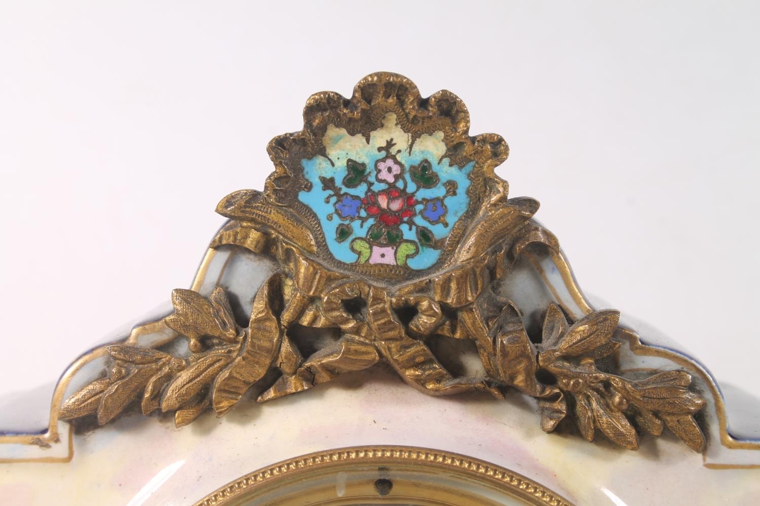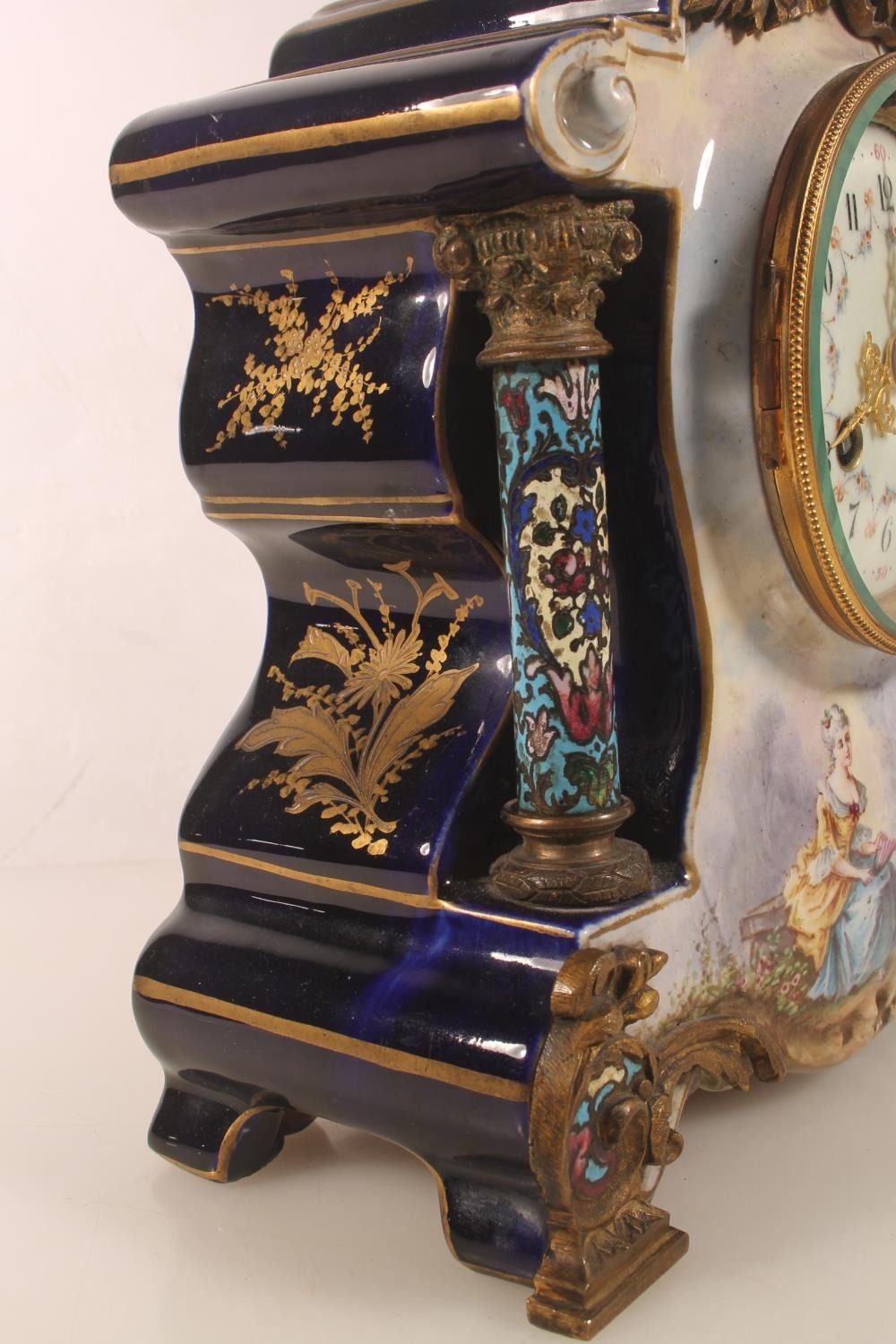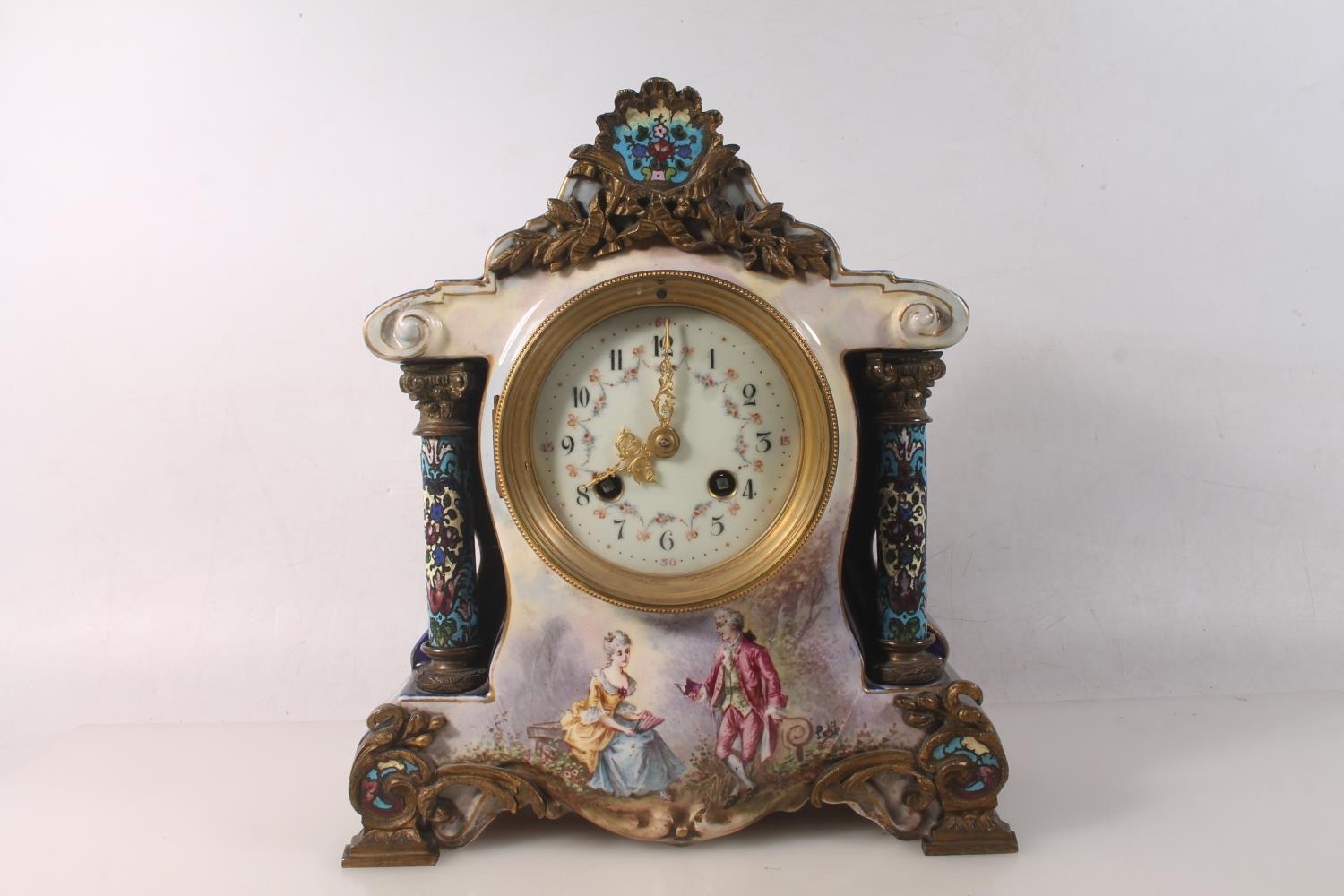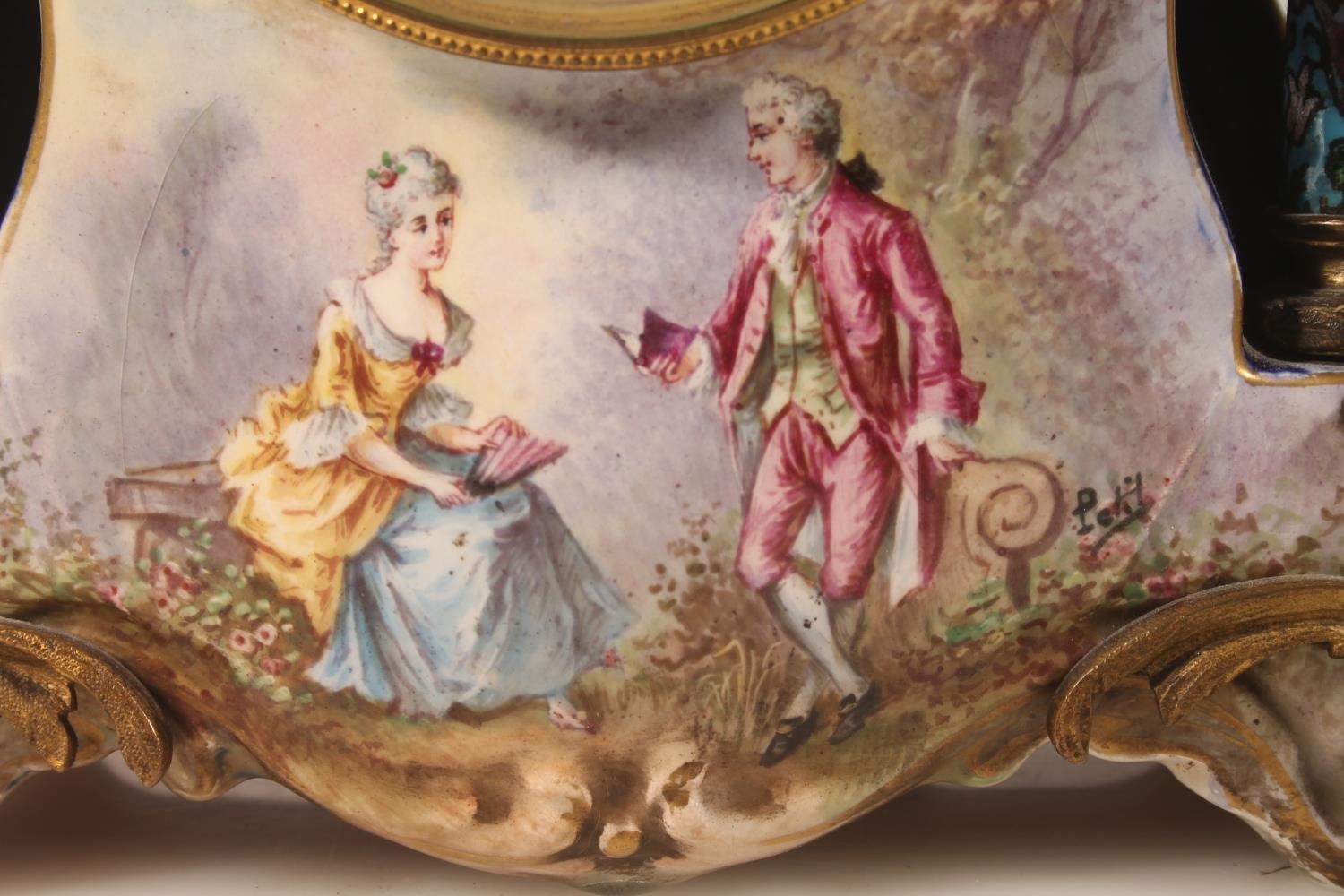 French porcelain mantel clock with hand-painted classical scene, signed Petit, the dial with garland of flowers flanked by champlevé enamel columns, the reverse marked made in France, the works unsigned, 26cm high.