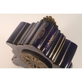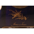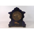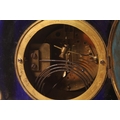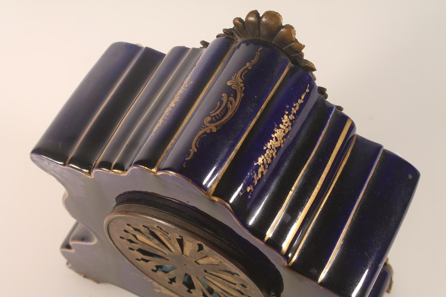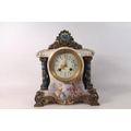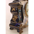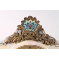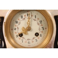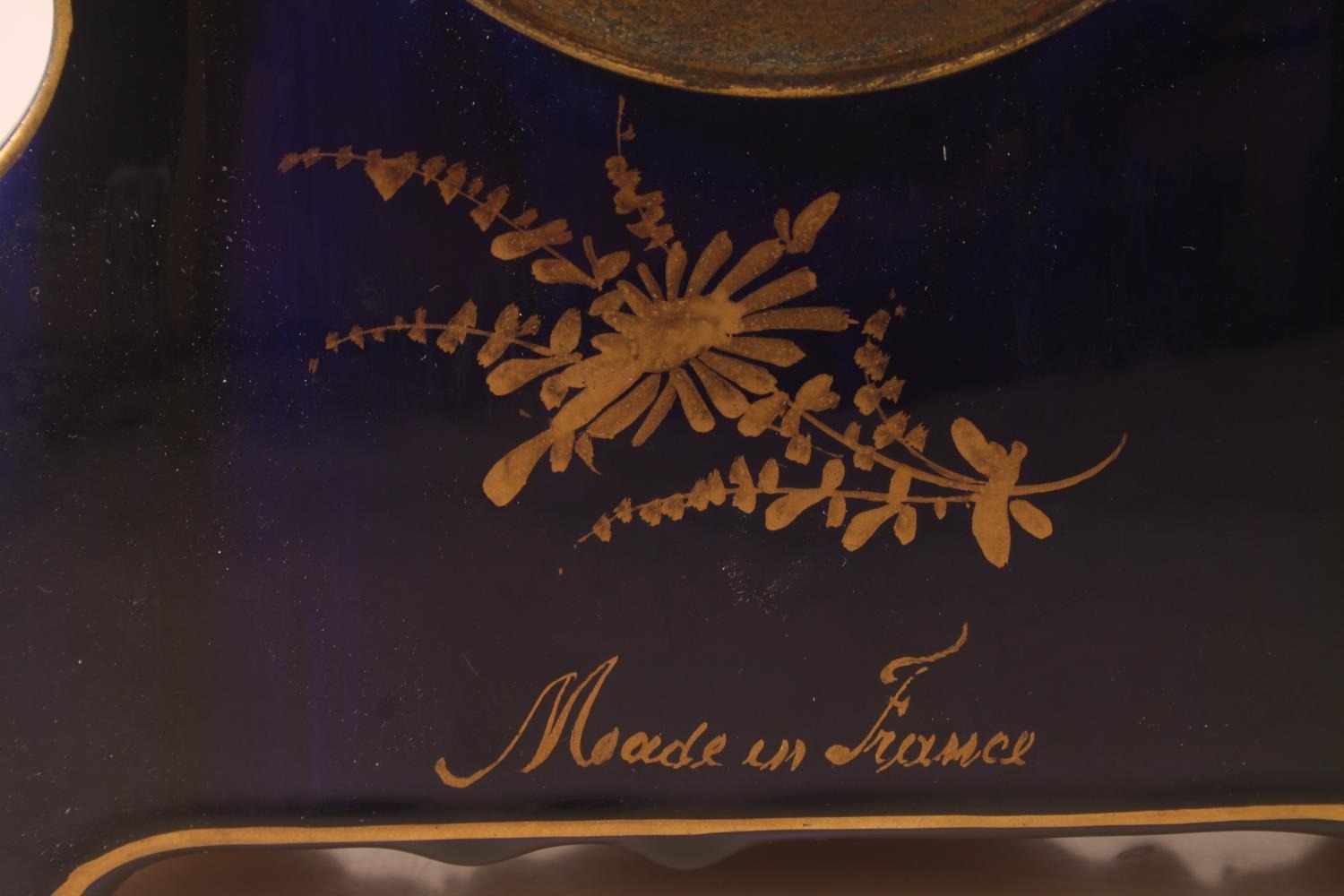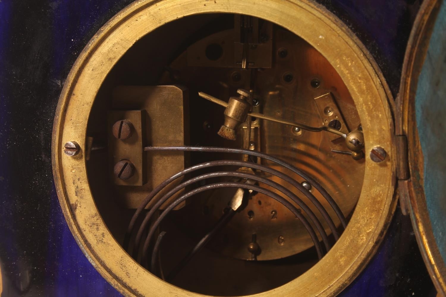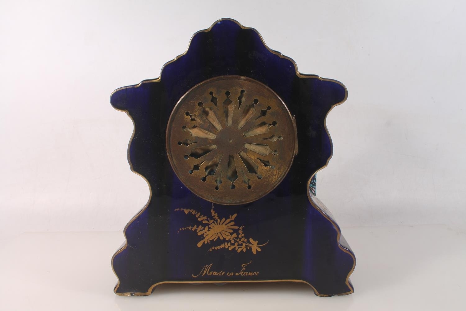 French porcelain mantel clock with hand-painted classical scene, signed Petit, the dial with garland of flowers flanked by champlevé enamel columns, the reverse marked made in France, the works unsigned, 26cm high.