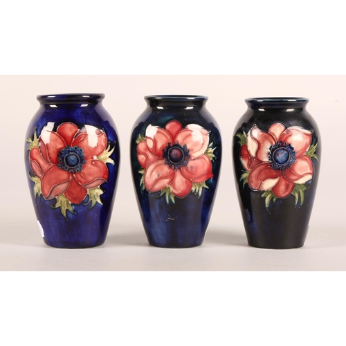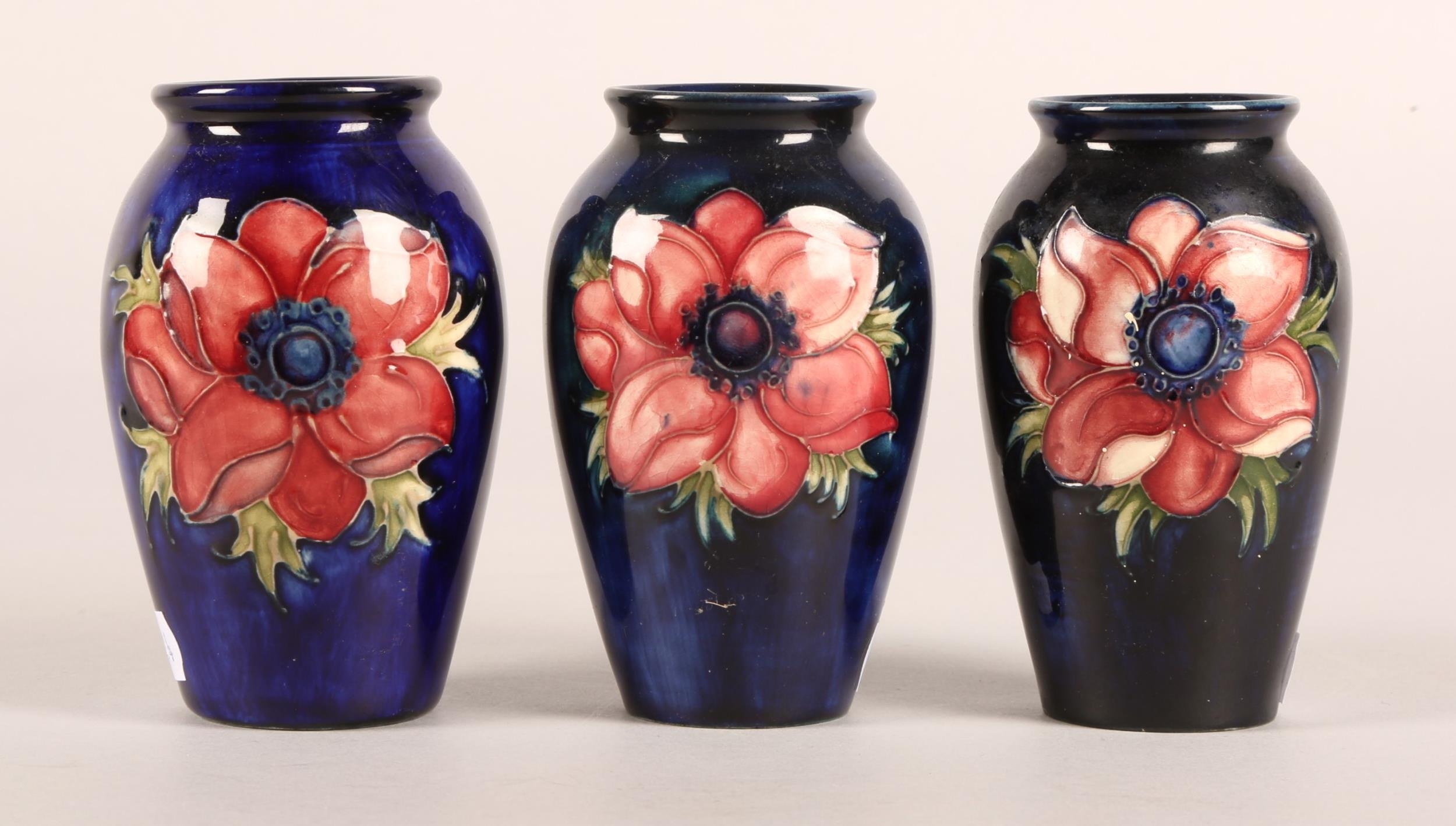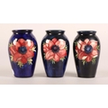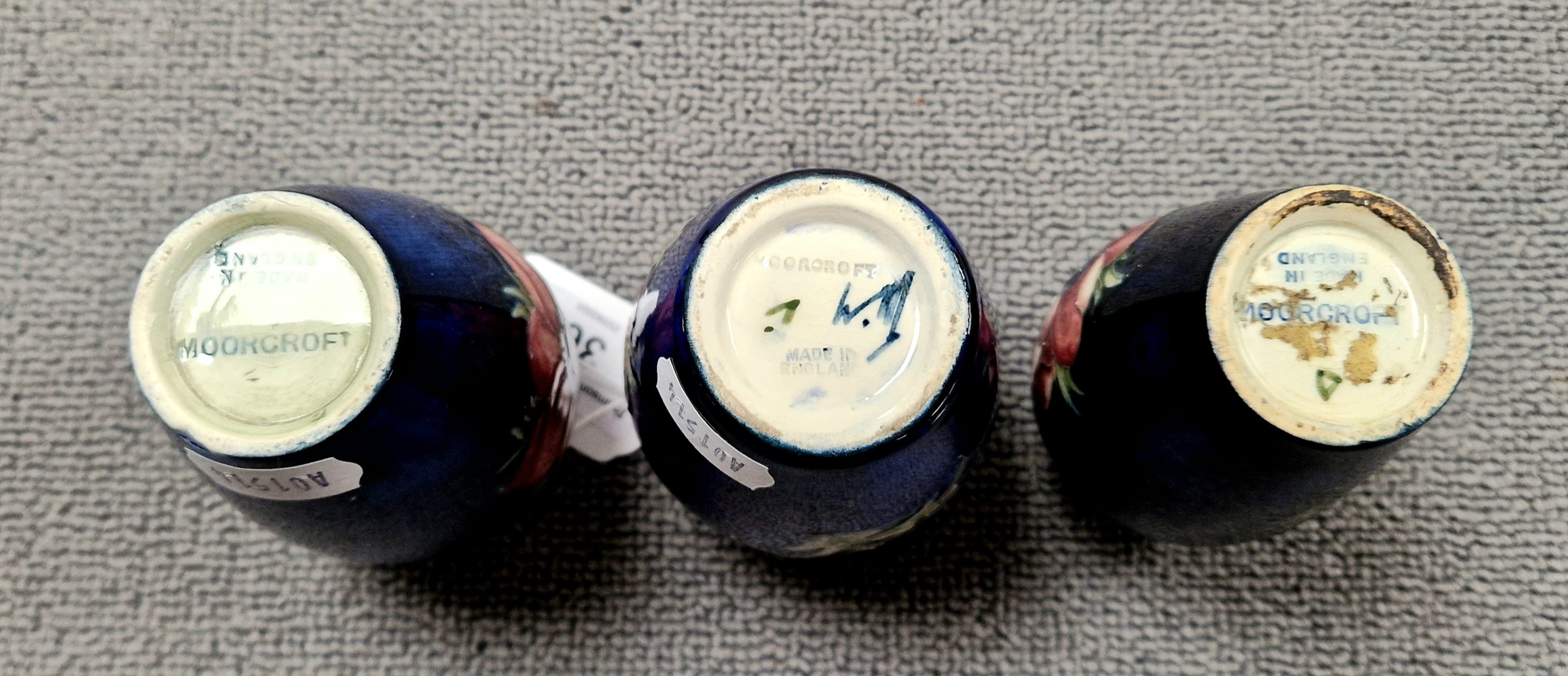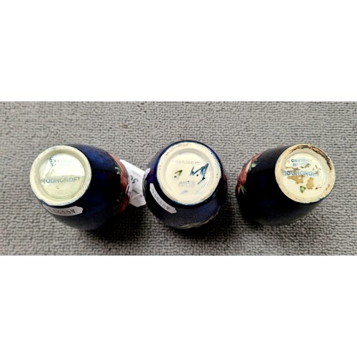 Three Moorcroft pottery tube lined spill vases to include hibiscus pattern, height approx. 10.5cm
