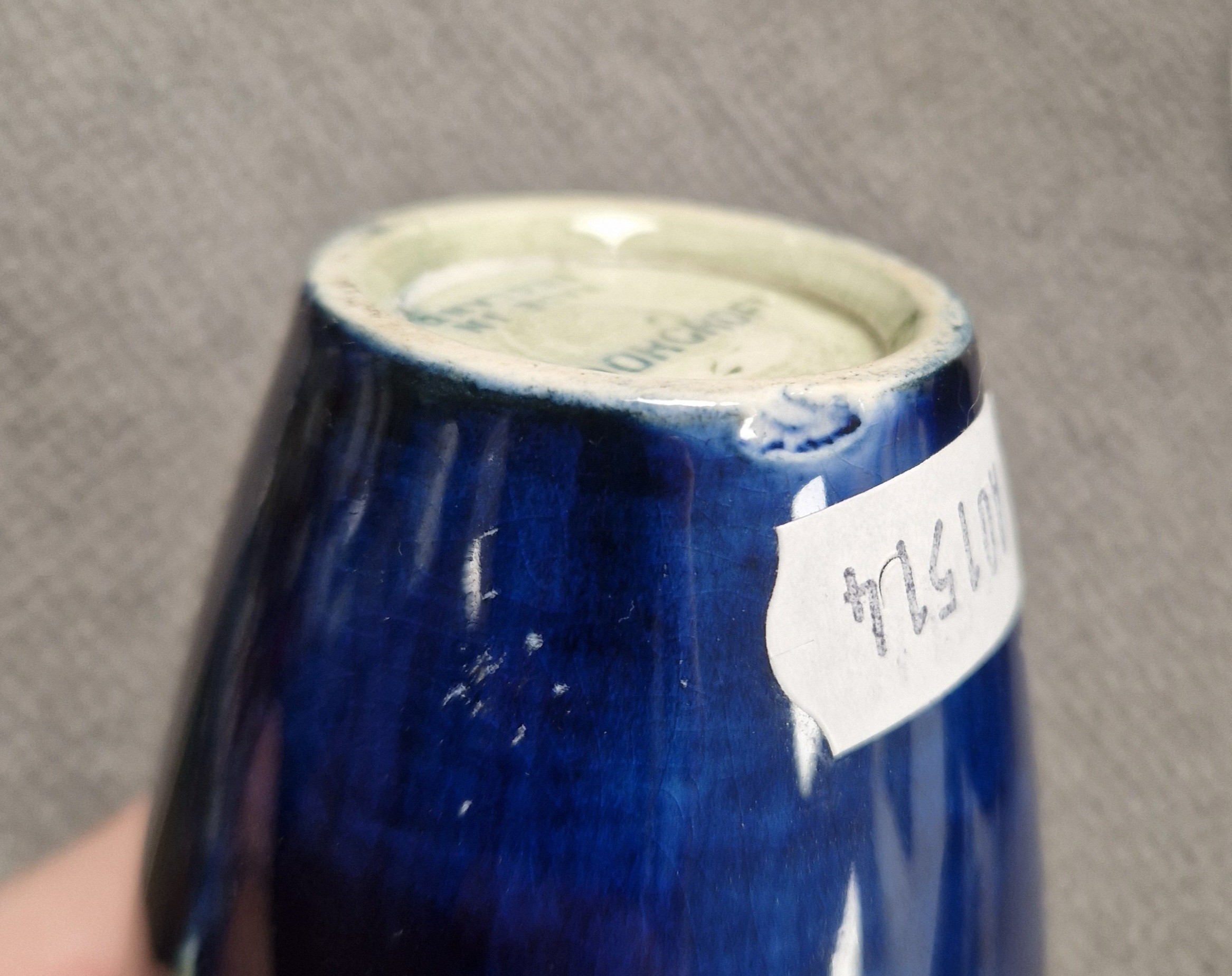 One with a nibble in the base rim but likely a manufacturing defect as it is under the blue glaze, otherwise good with some crazing