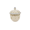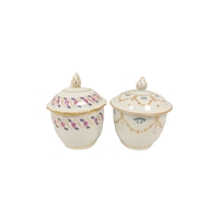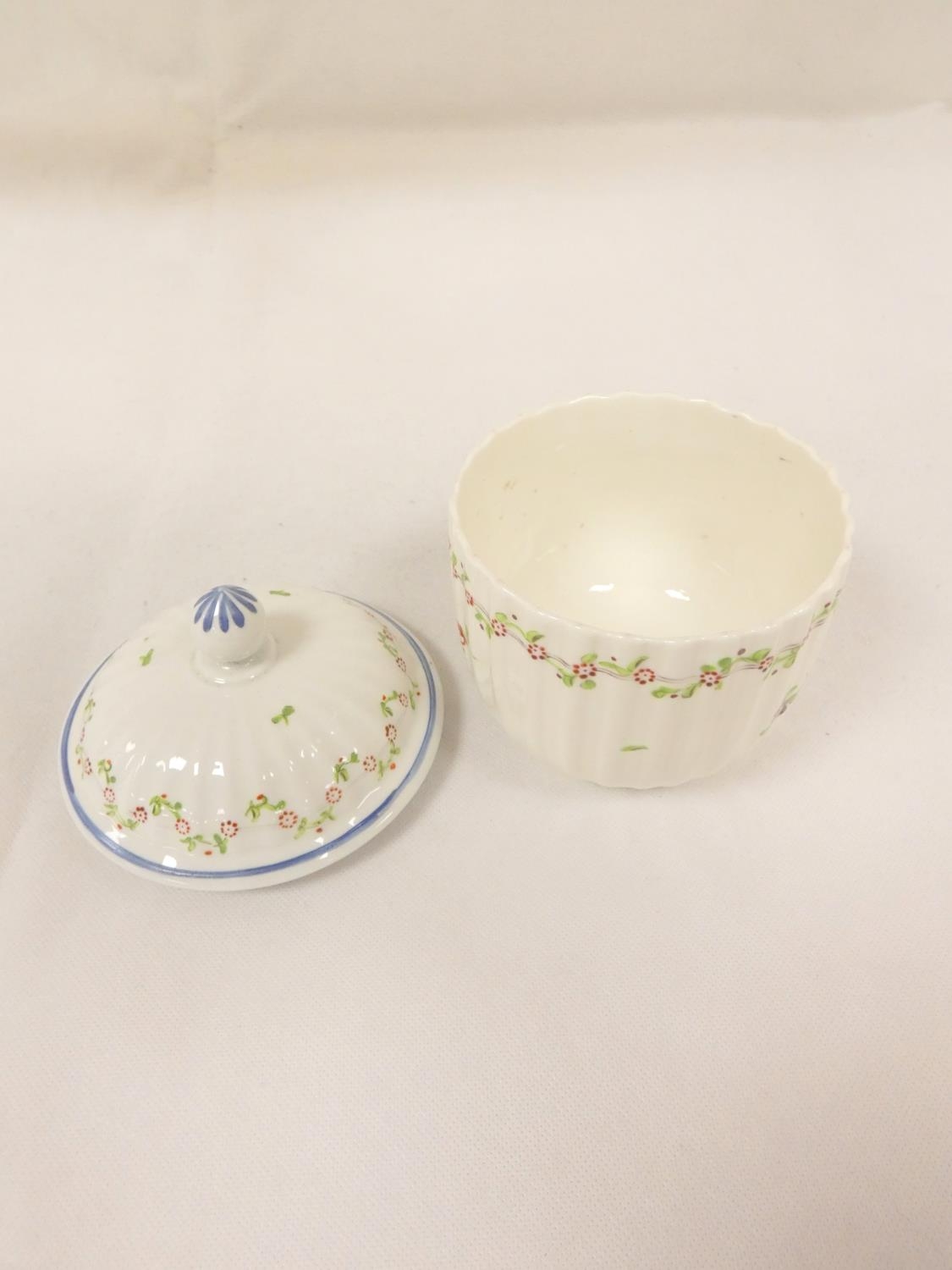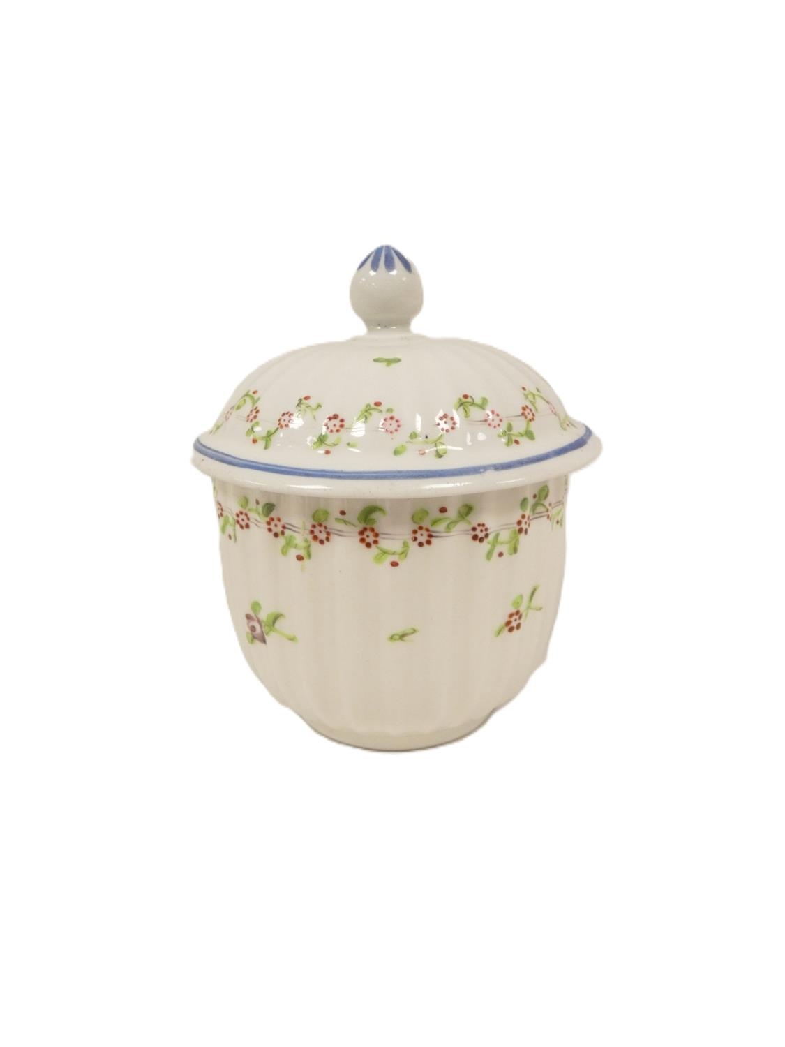Factory unknown, sugar box of reeded form in a version of New Hall pattern 191, trailing flowers and leaves and flowering sprays, 15cm high, c. late 1780's. An interesting "problem" piece, further research may be repaid.