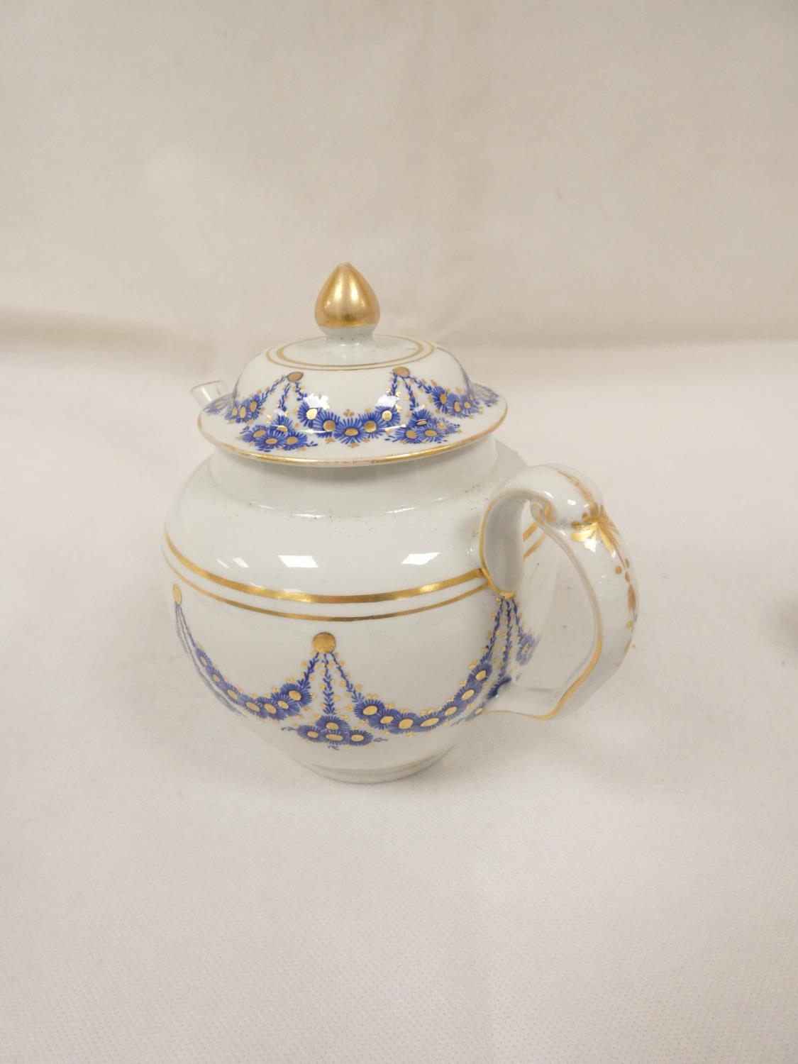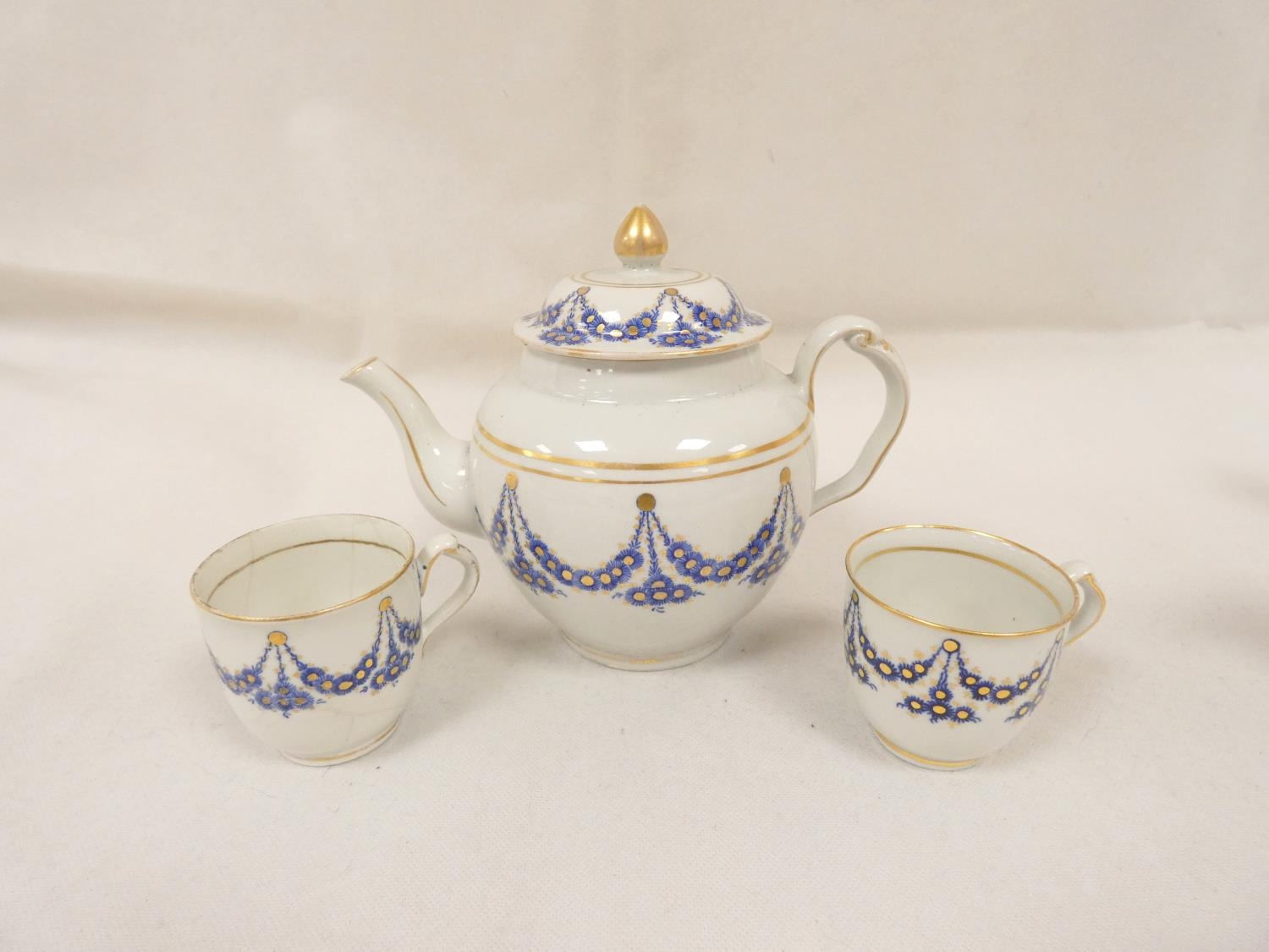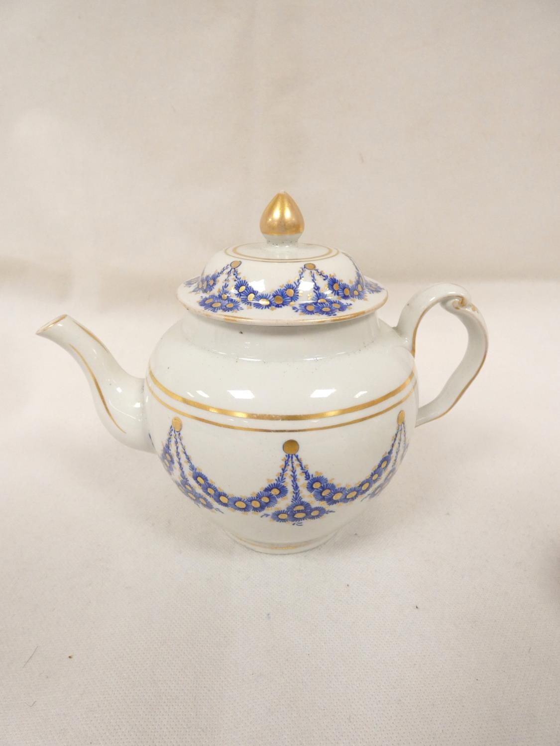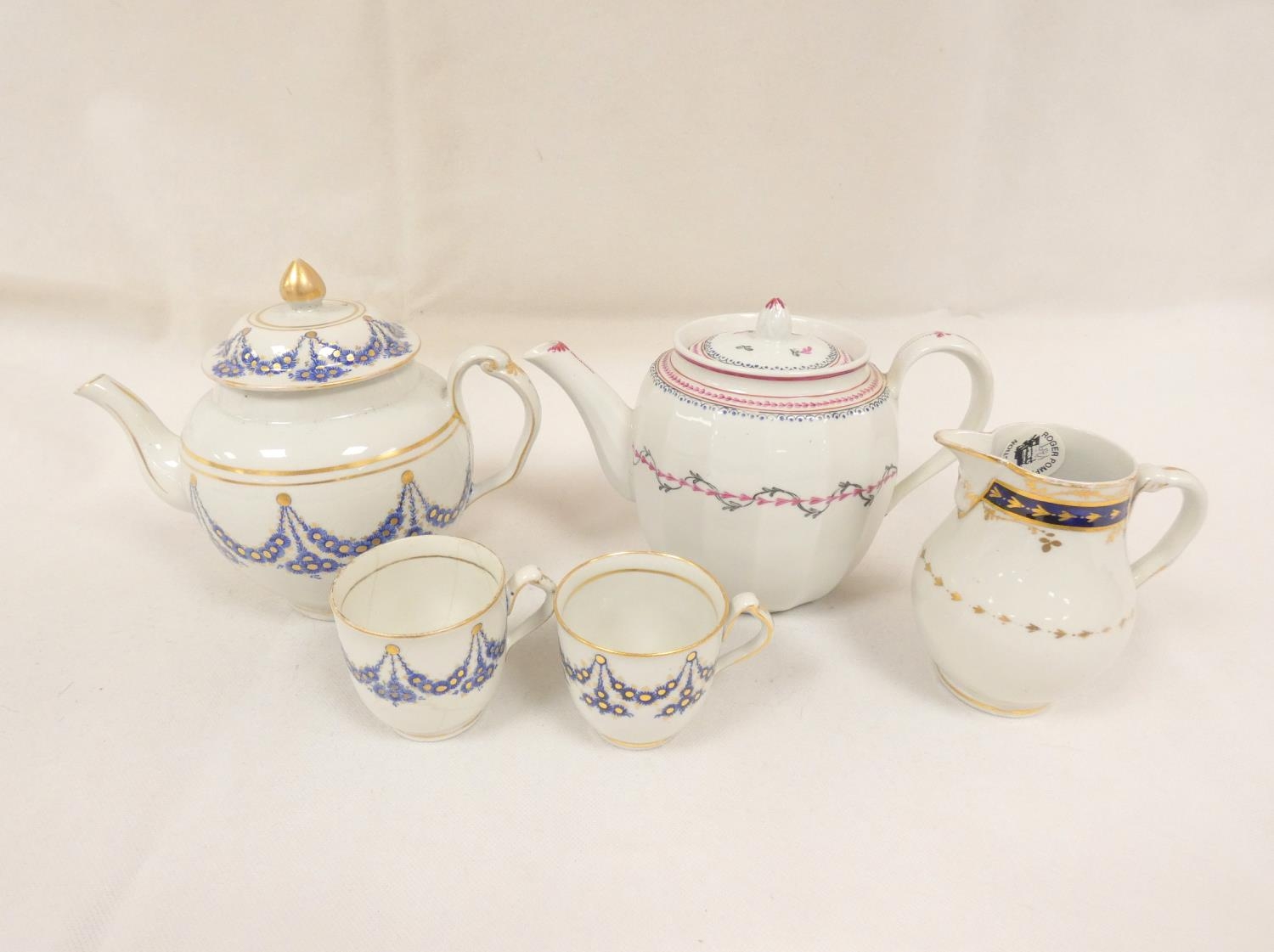 New Hall teapot of spherical form with clip handle, pattern U23, blue and gilt swags, impact damage to one side, 17cm high; also two clip handled coffee cups to match (one a.f.); New Hall clip handled baluster milk jug in blue and gilt, Preller collection, and New Hall teapot of faceted barrel form, pattern 122, hairline crack, ex Witherick collection. (5).