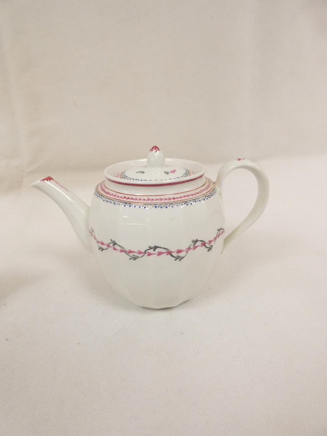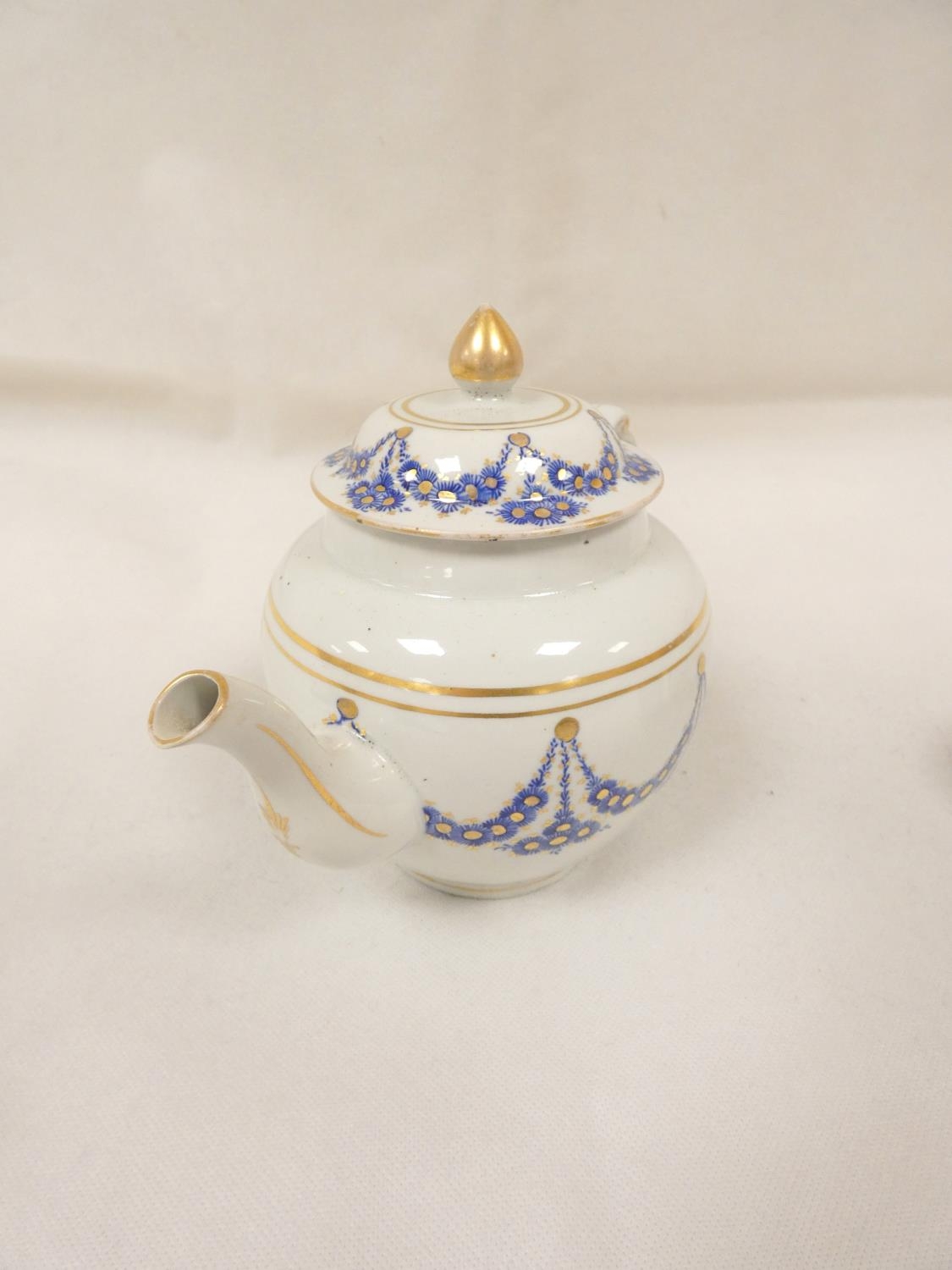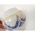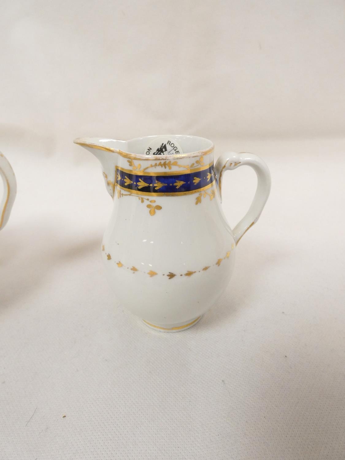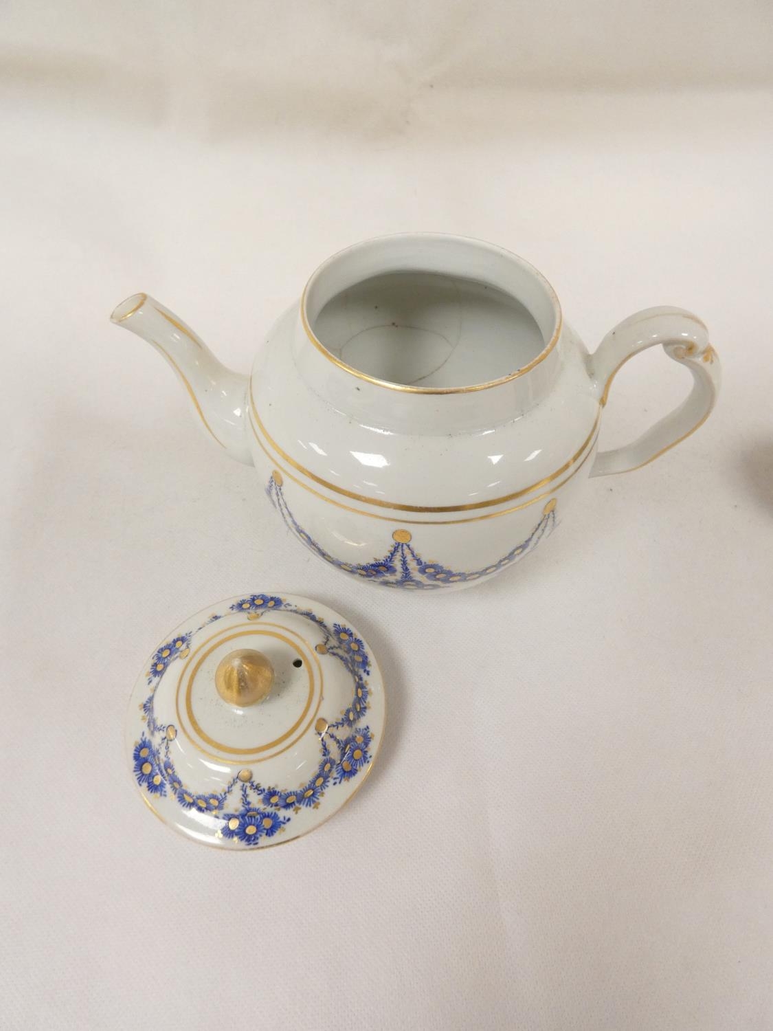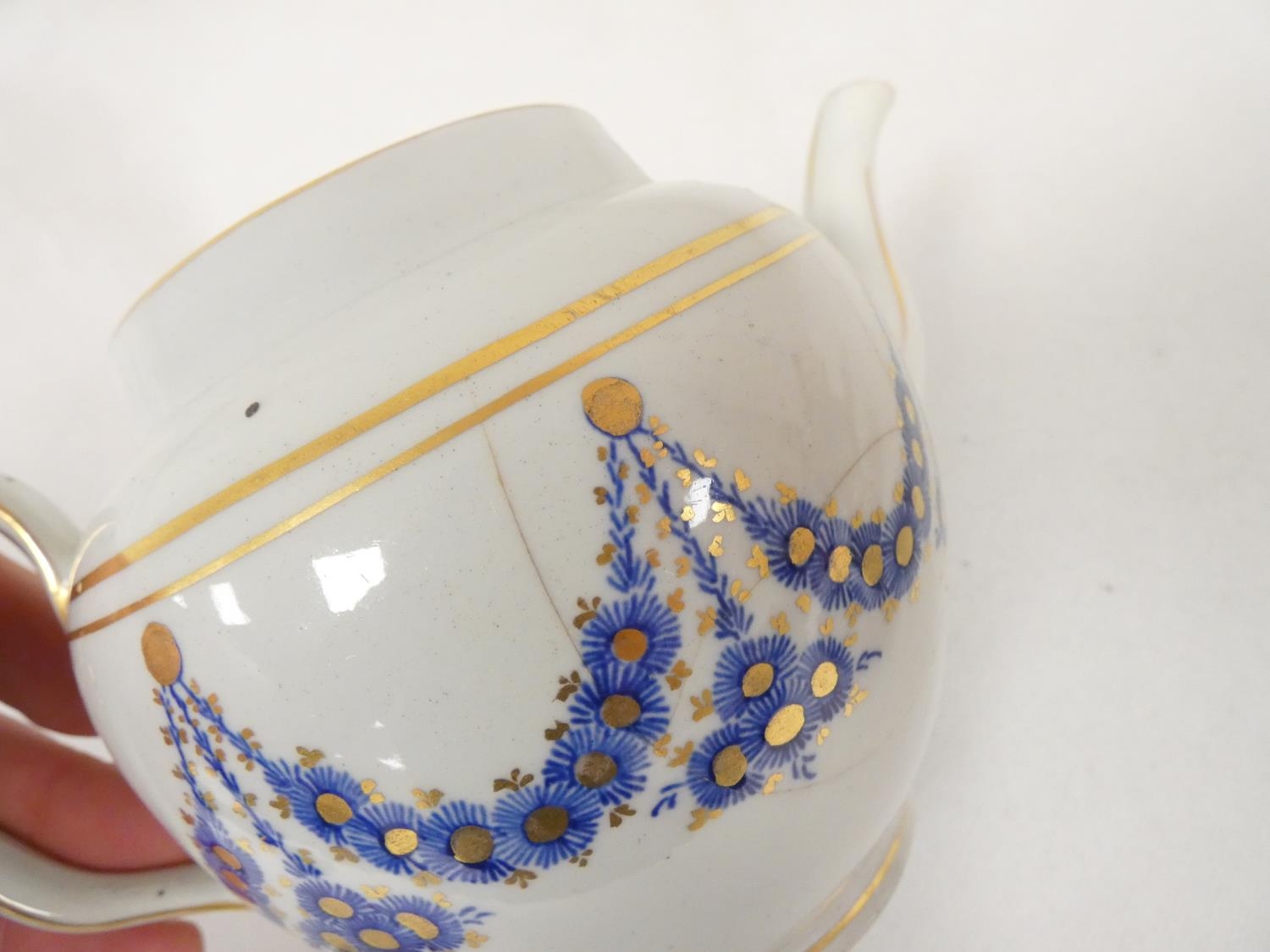 New Hall teapot of spherical form with clip handle, pattern U23, blue and gilt swags, impact damage to one side, 17cm high; also two clip handled coffee cups to match (one a.f.); New Hall clip handled baluster milk jug in blue and gilt, Preller collection, and New Hall teapot of faceted barrel form, pattern 122, hairline crack, ex Witherick collection. (5).
