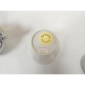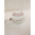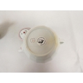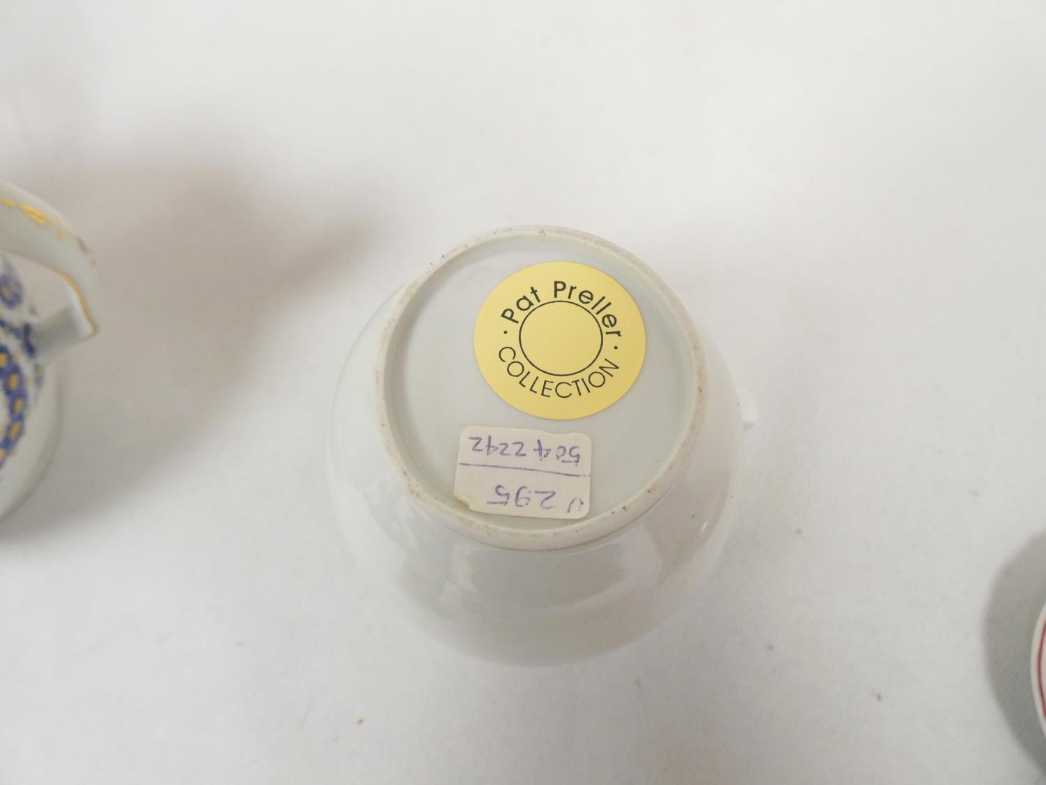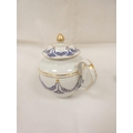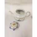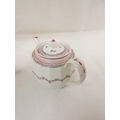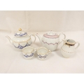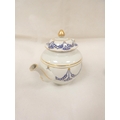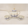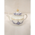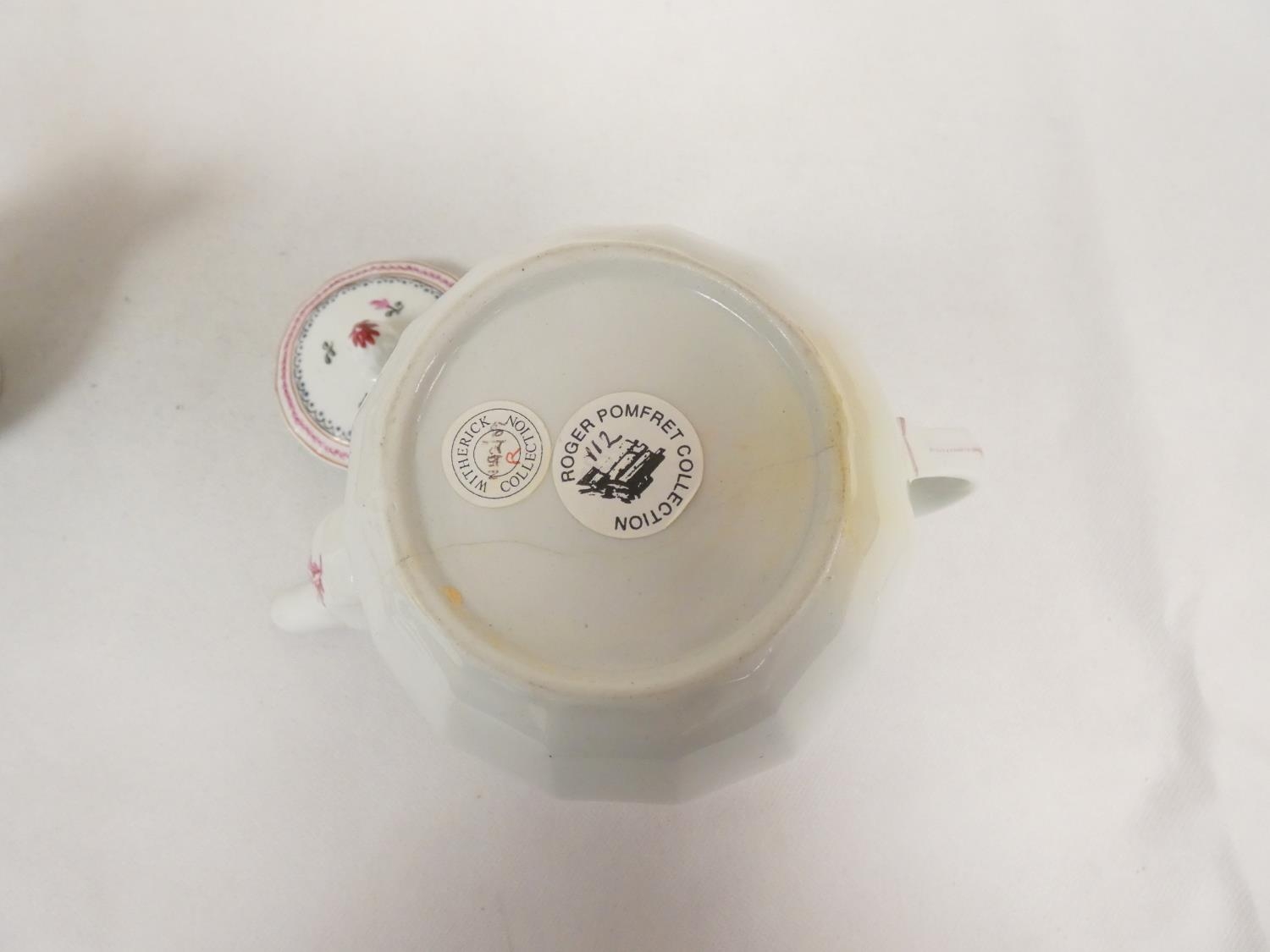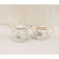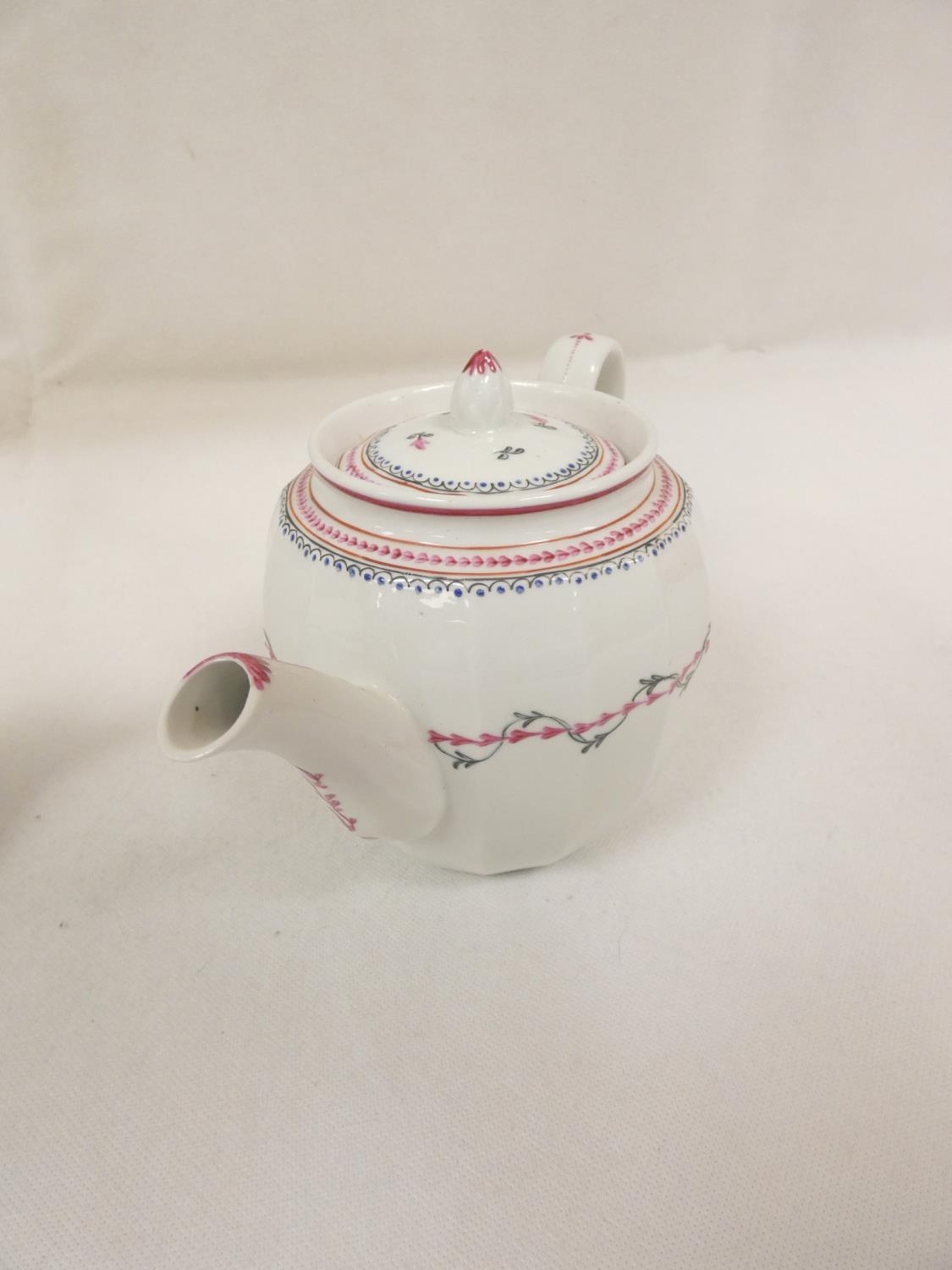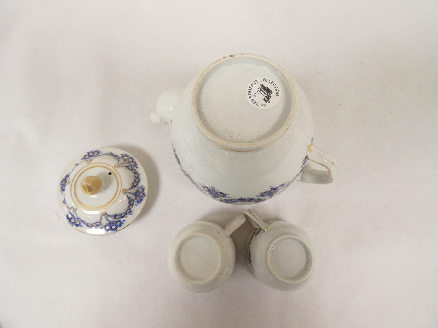 New Hall teapot of spherical form with clip handle, pattern U23, blue and gilt swags, impact damage to one side, 17cm high; also two clip handled coffee cups to match (one a.f.); New Hall clip handled baluster milk jug in blue and gilt, Preller collection, and New Hall teapot of faceted barrel form, pattern 122, hairline crack, ex Witherick collection. (5).