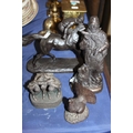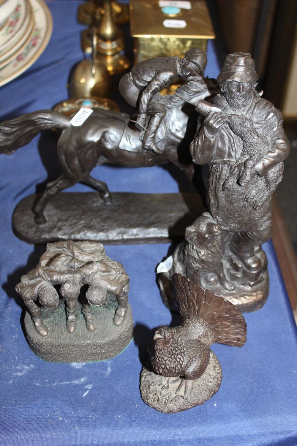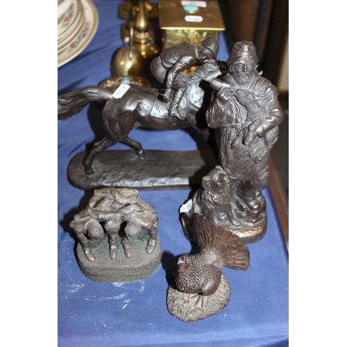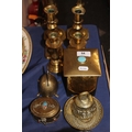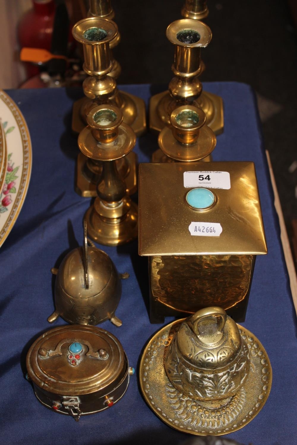 Arts & Crafts style brass tea caddy with Ruskin style roundel, a Tibetan brass beetle nut box set with faux coral and aquamarine stones, brass candlesticks, a resin model of a horse and jockey, and three others.