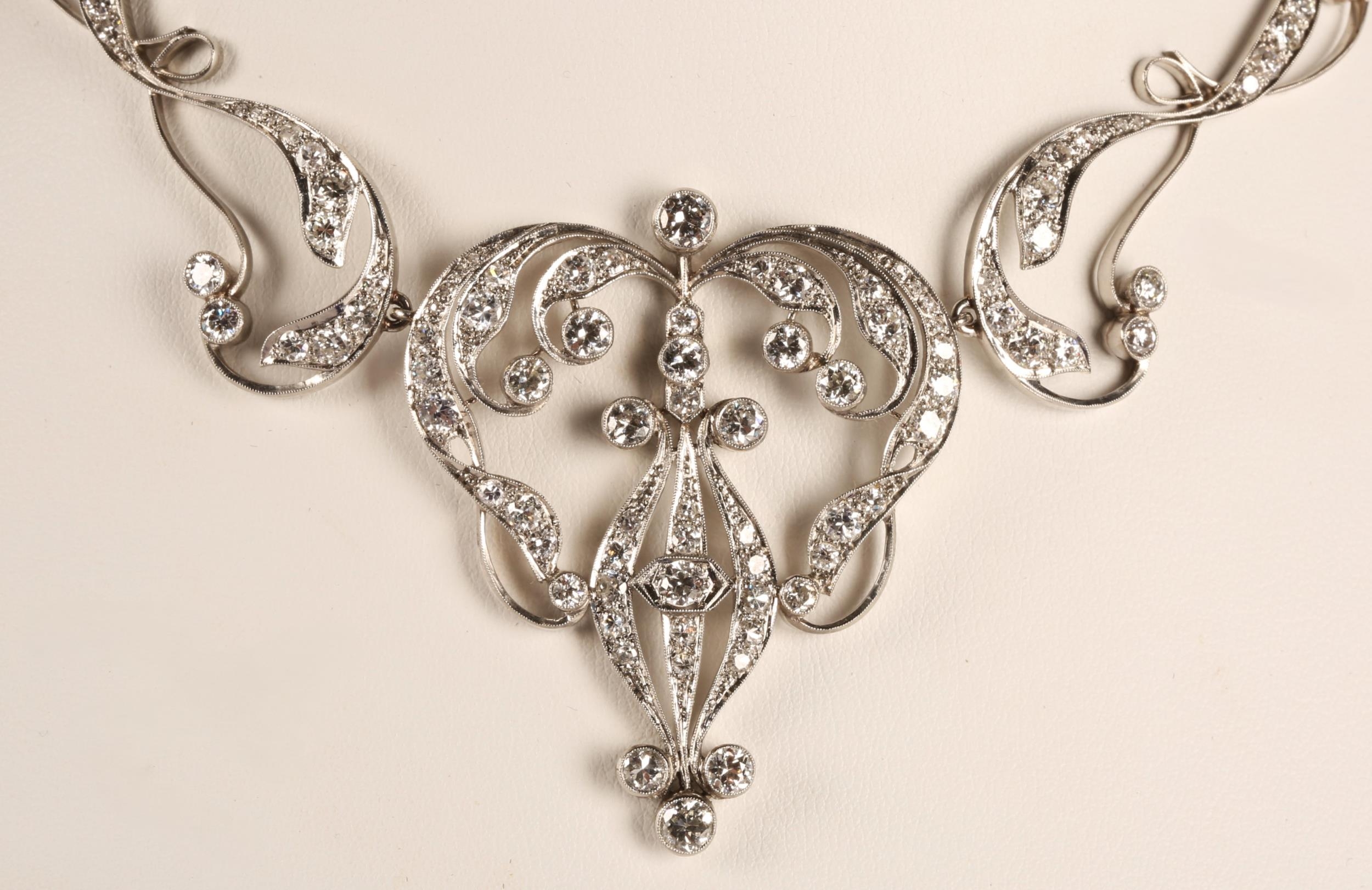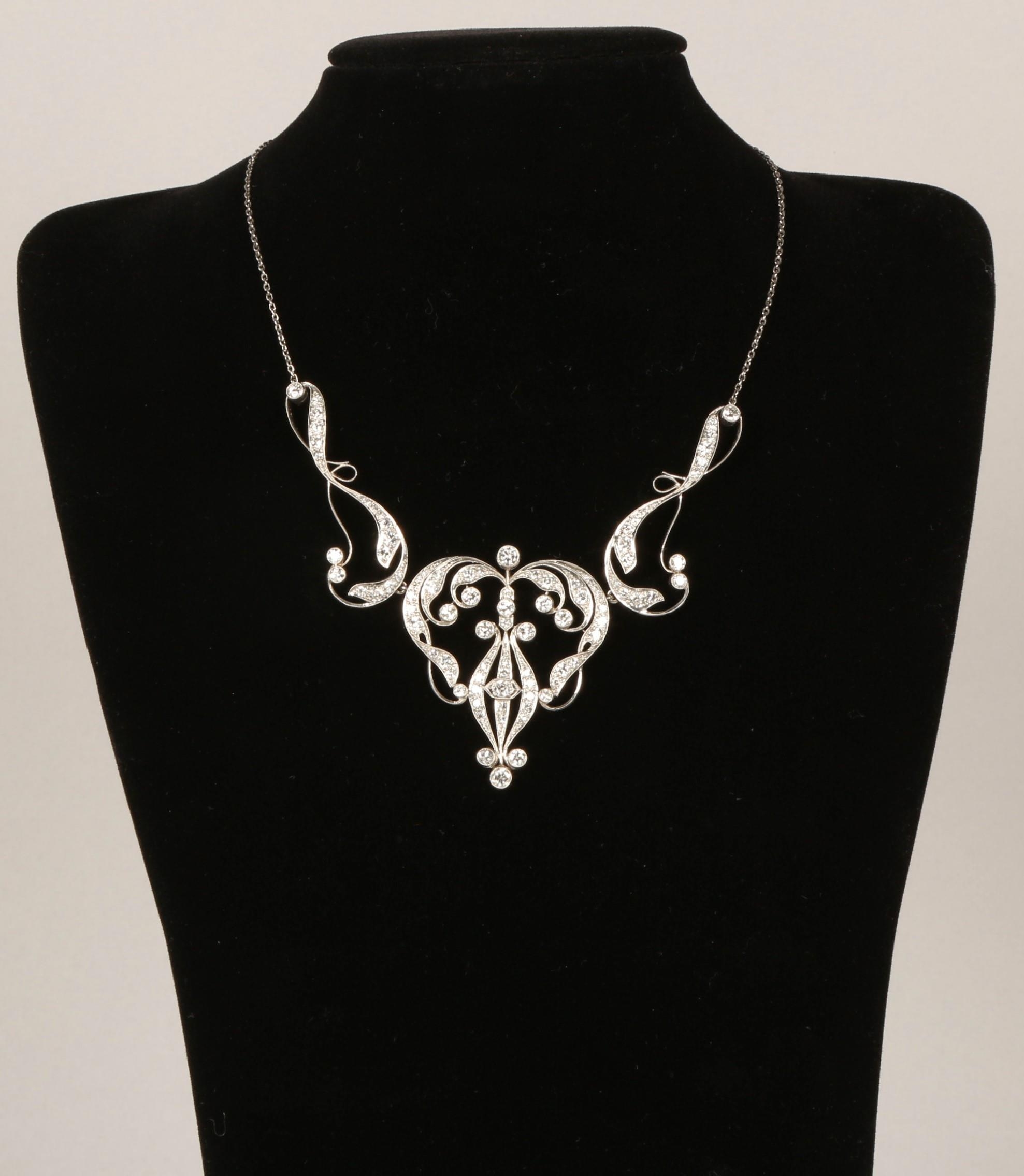 Art Nouveau ladies diamond encrusted necklace set on unmarked white metal possibly platinum, gross weight 22.3 grams