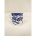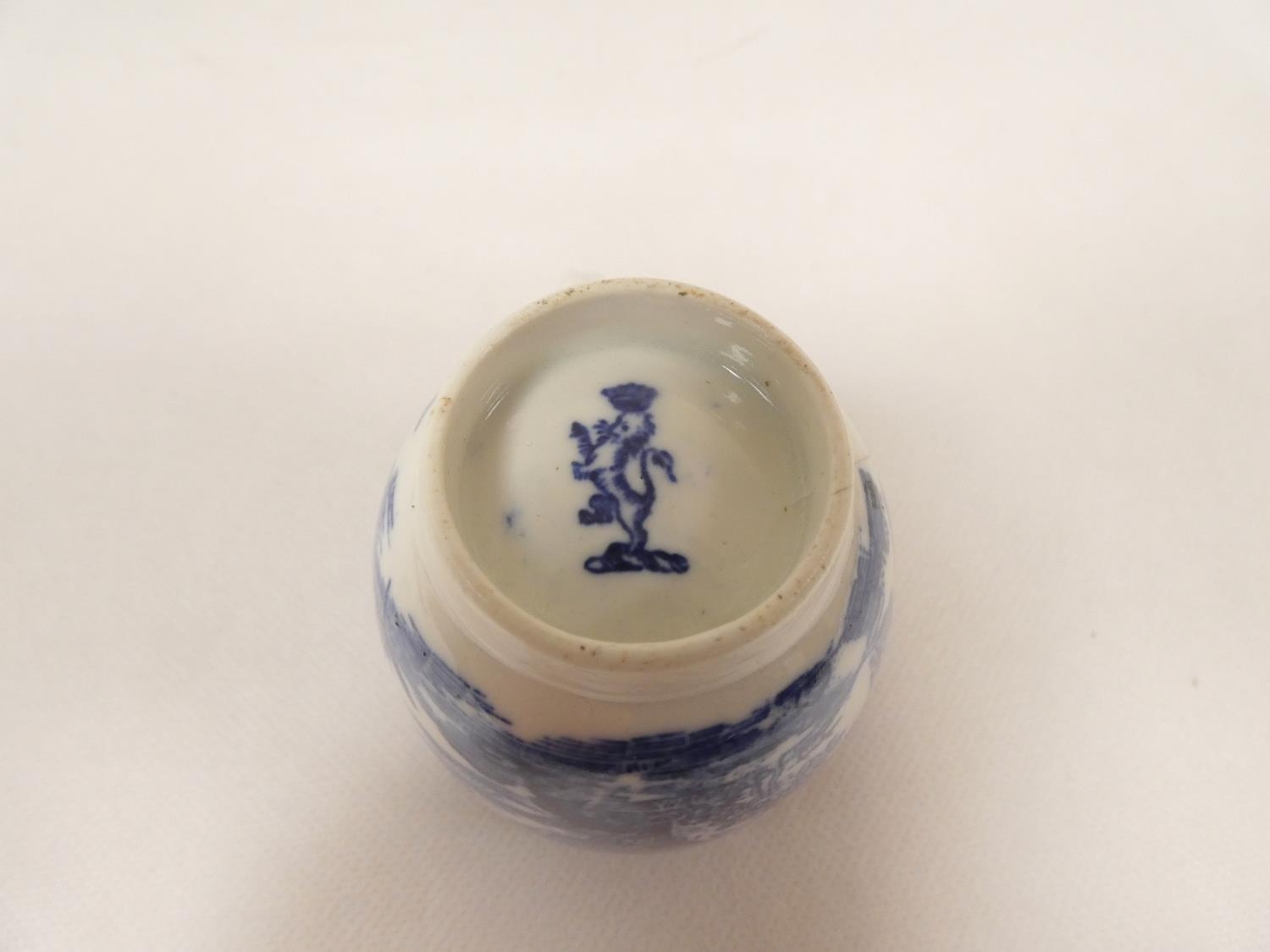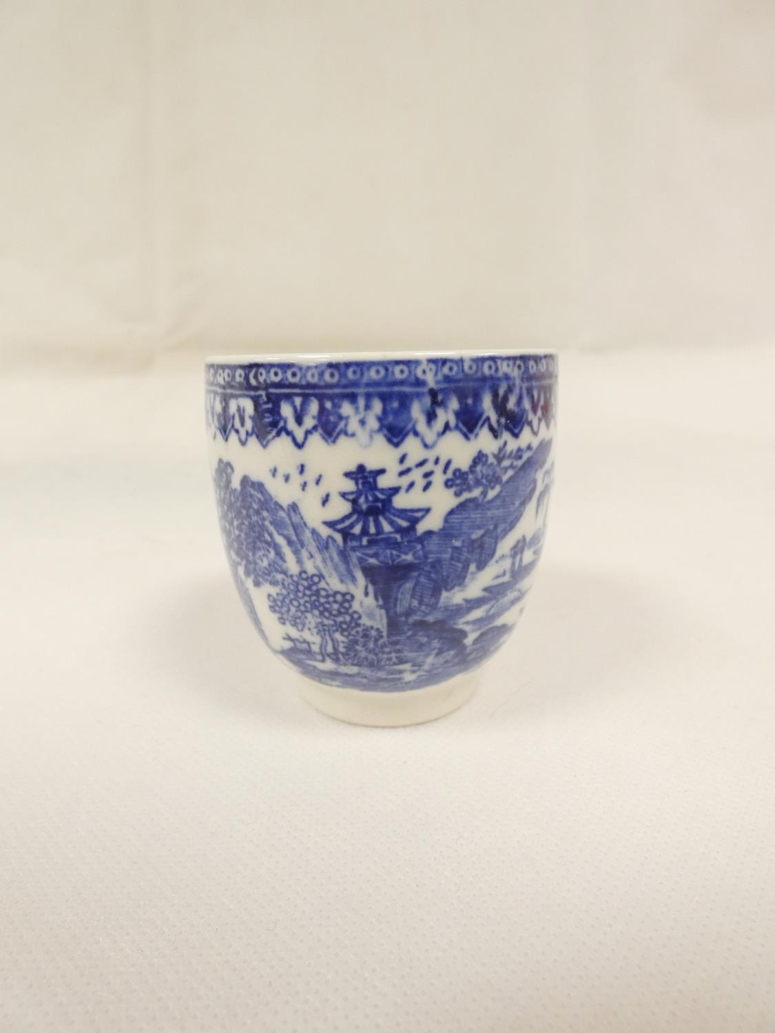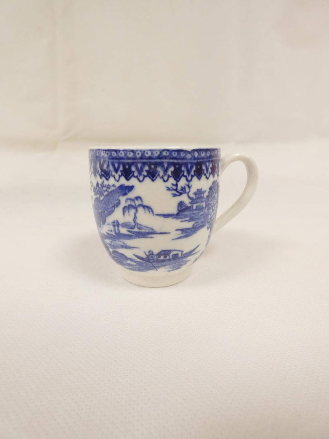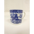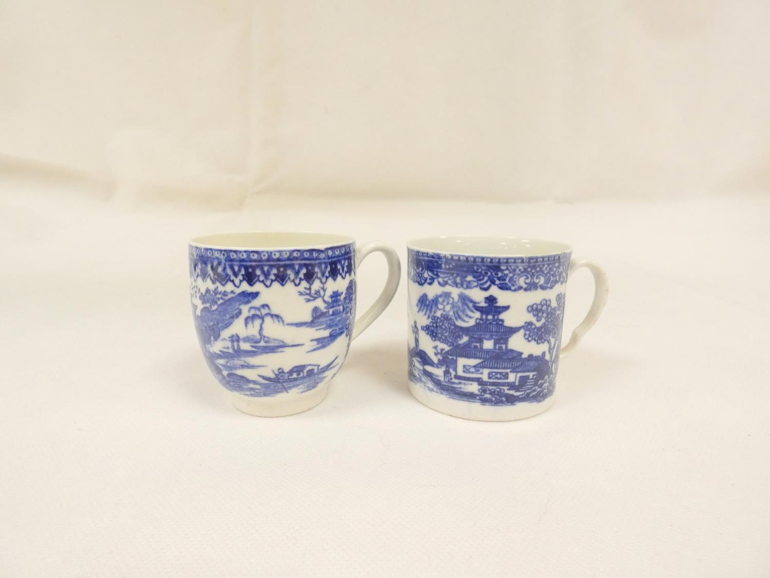 Attributed to Enoch Wood coffee can, kinked loop handle and blue printed with "Man on Bridge" pattern, lion rampant below coronet mark, 6cm high, 1785/88; also a similarly lion marked coffee cup, blue printed in dark rock "Gazebo" pattern. (2). For discussion re. these see NCS journals 1995 and later.