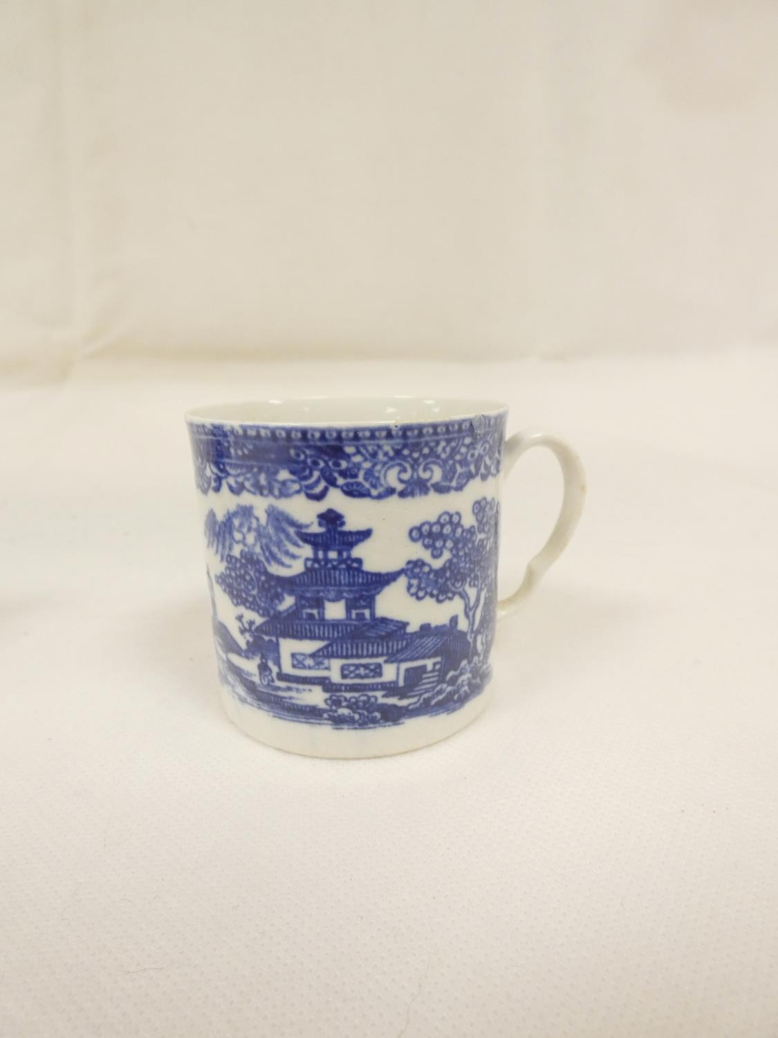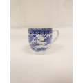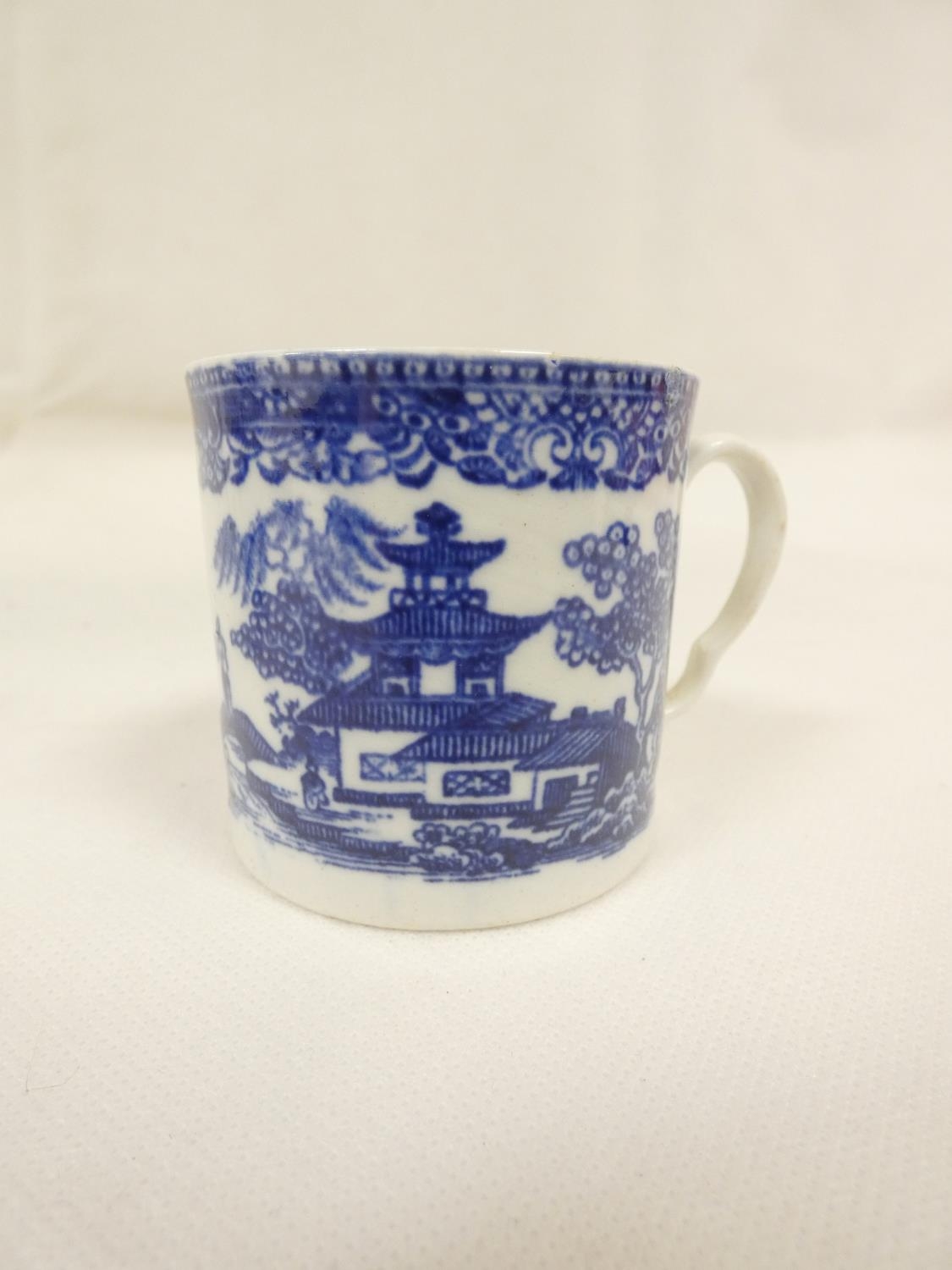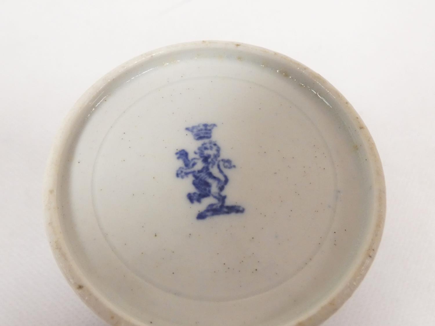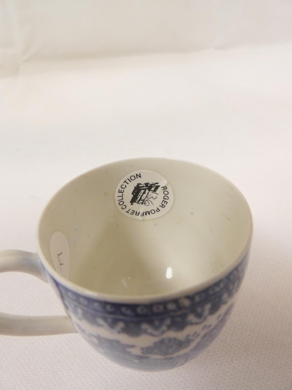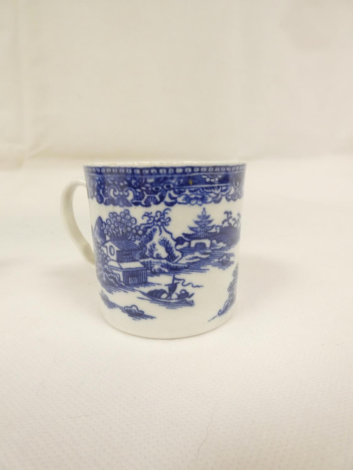 Attributed to Enoch Wood coffee can, kinked loop handle and blue printed with "Man on Bridge" pattern, lion rampant below coronet mark, 6cm high, 1785/88; also a similarly lion marked coffee cup, blue printed in dark rock "Gazebo" pattern. (2). For discussion re. these see NCS journals 1995 and later.
