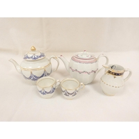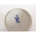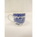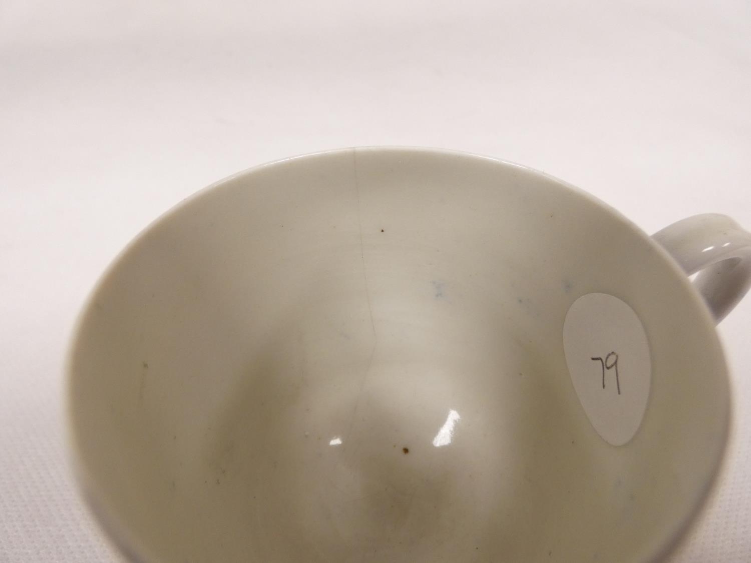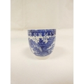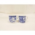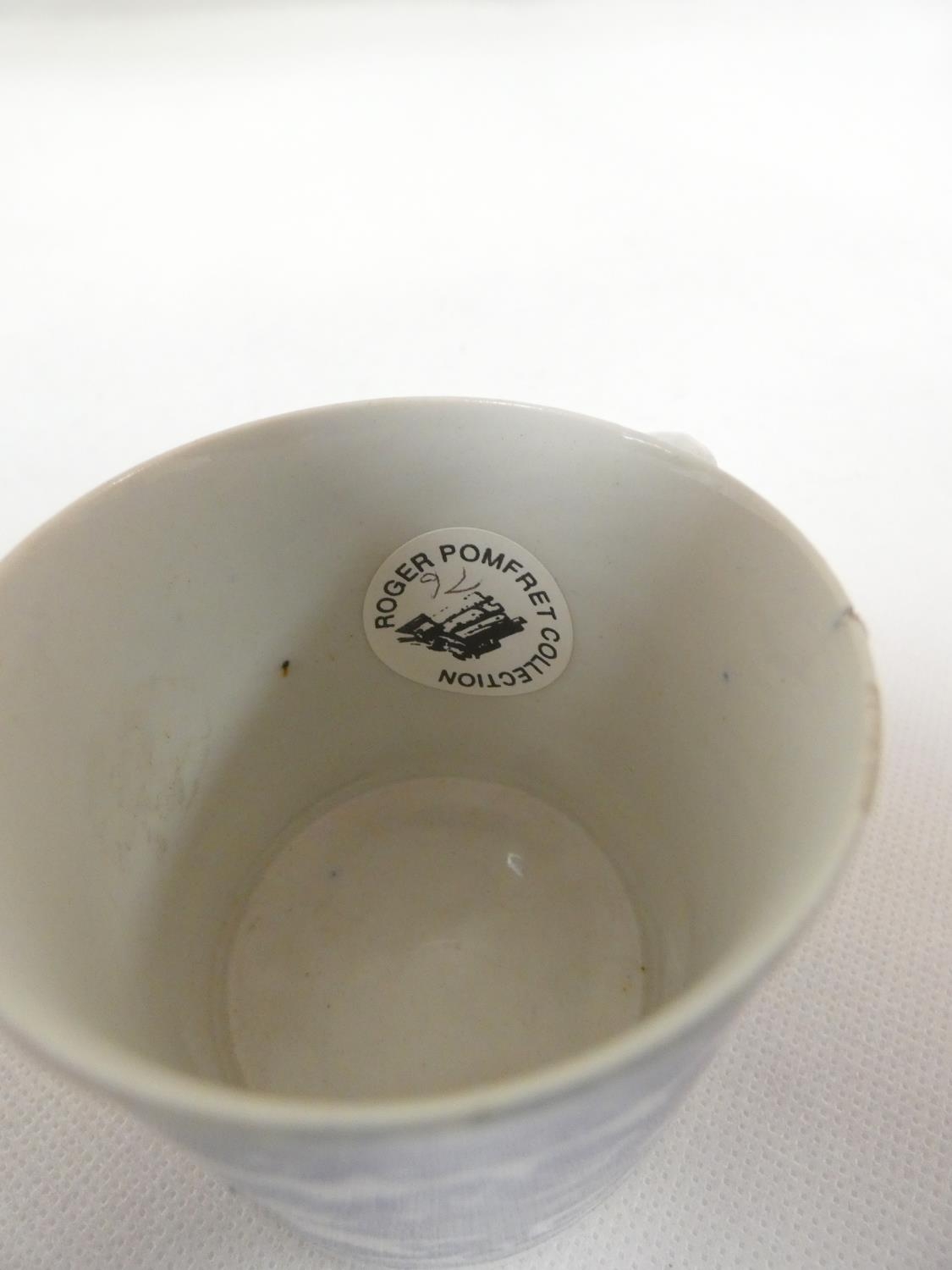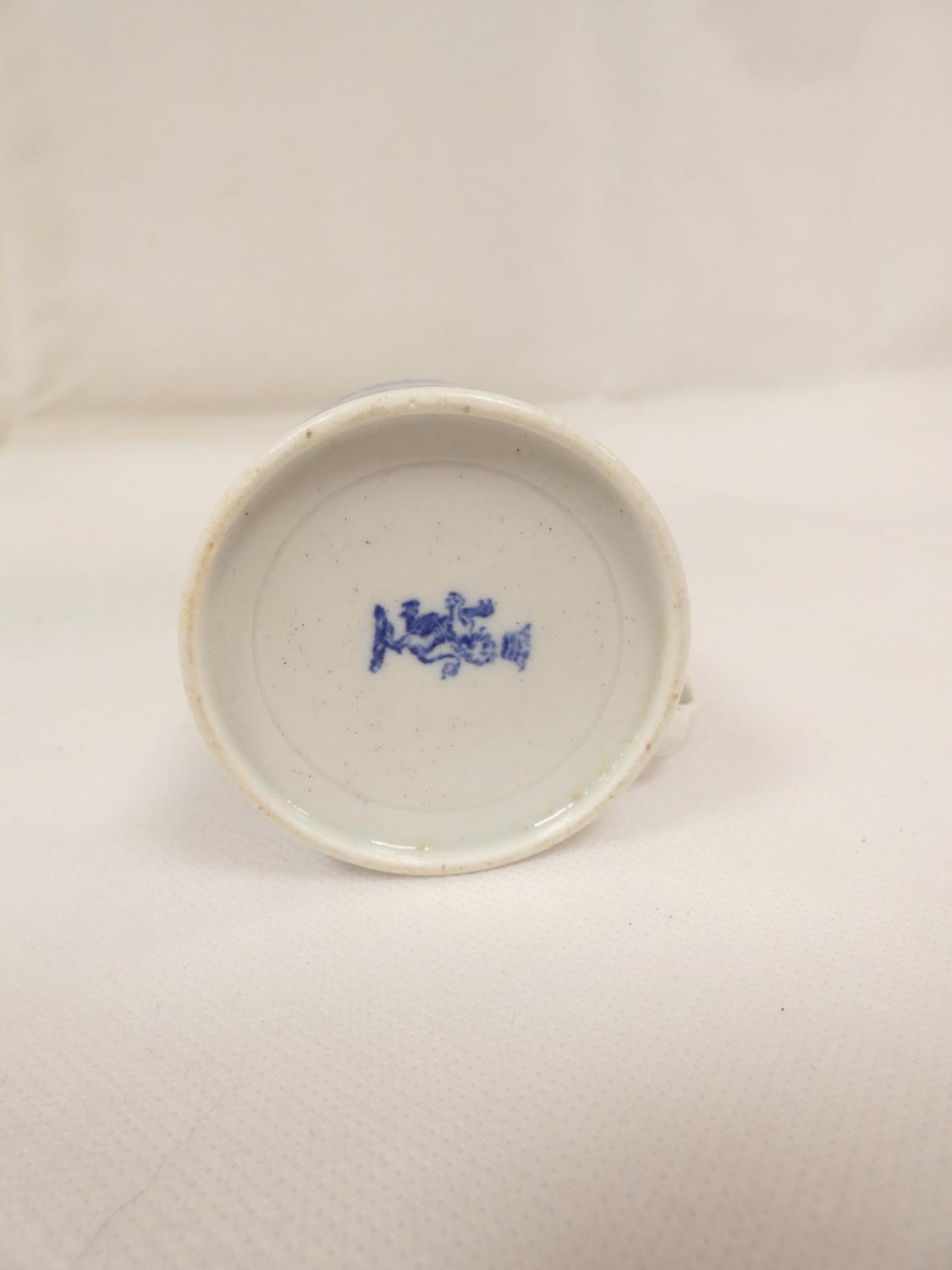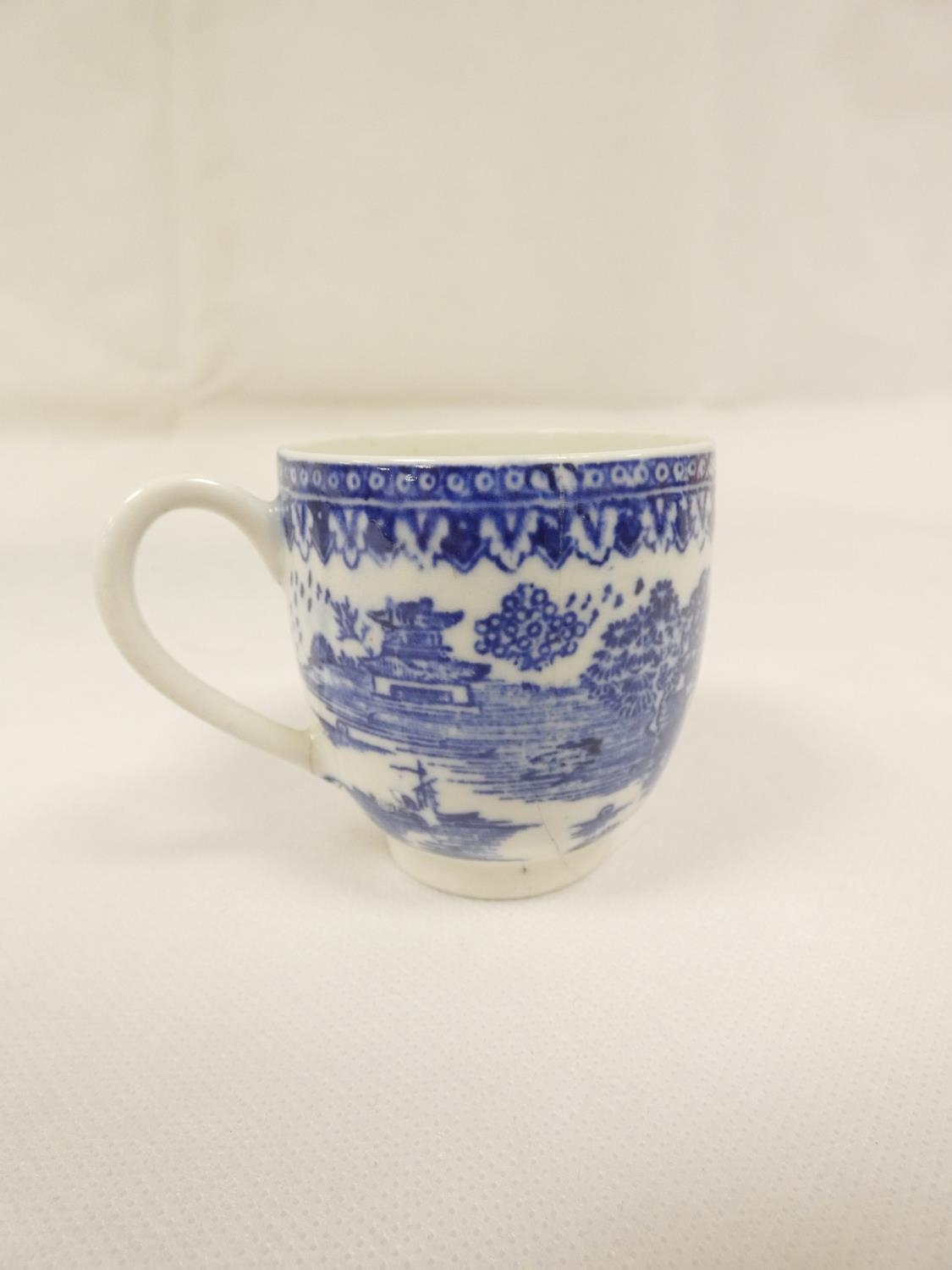Attributed to Enoch Wood coffee can, kinked loop handle and blue printed with "Man on Bridge" pattern, lion rampant below coronet mark, 6cm high, 1785/88; also a similarly lion marked coffee cup, blue printed in dark rock "Gazebo" pattern. (2). For discussion re. these see NCS journals 1995 and later.
