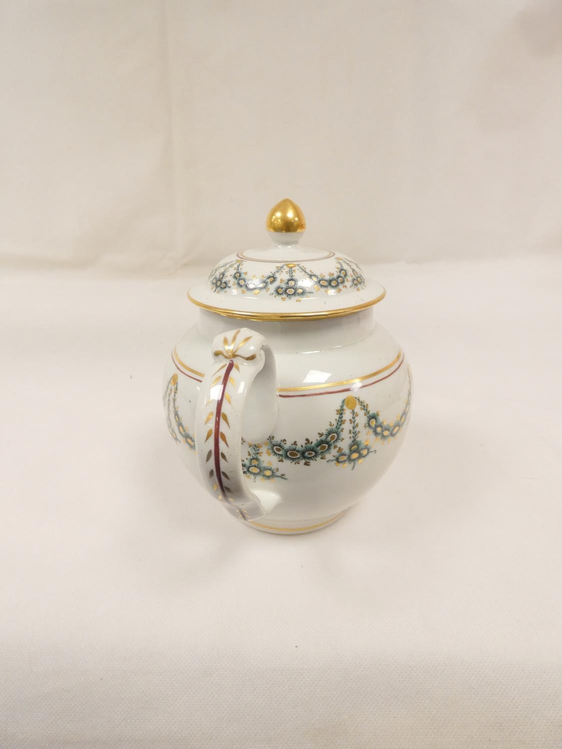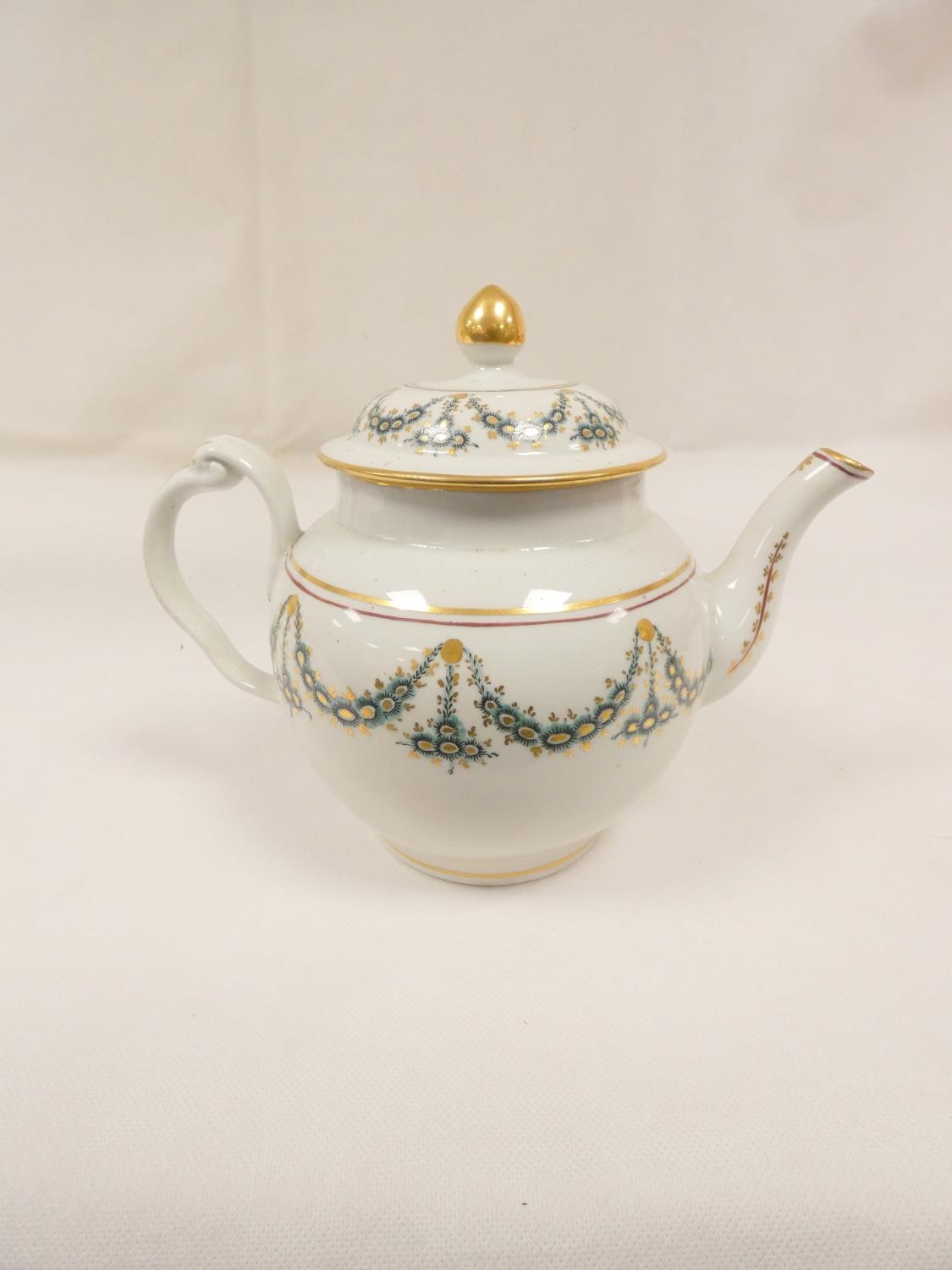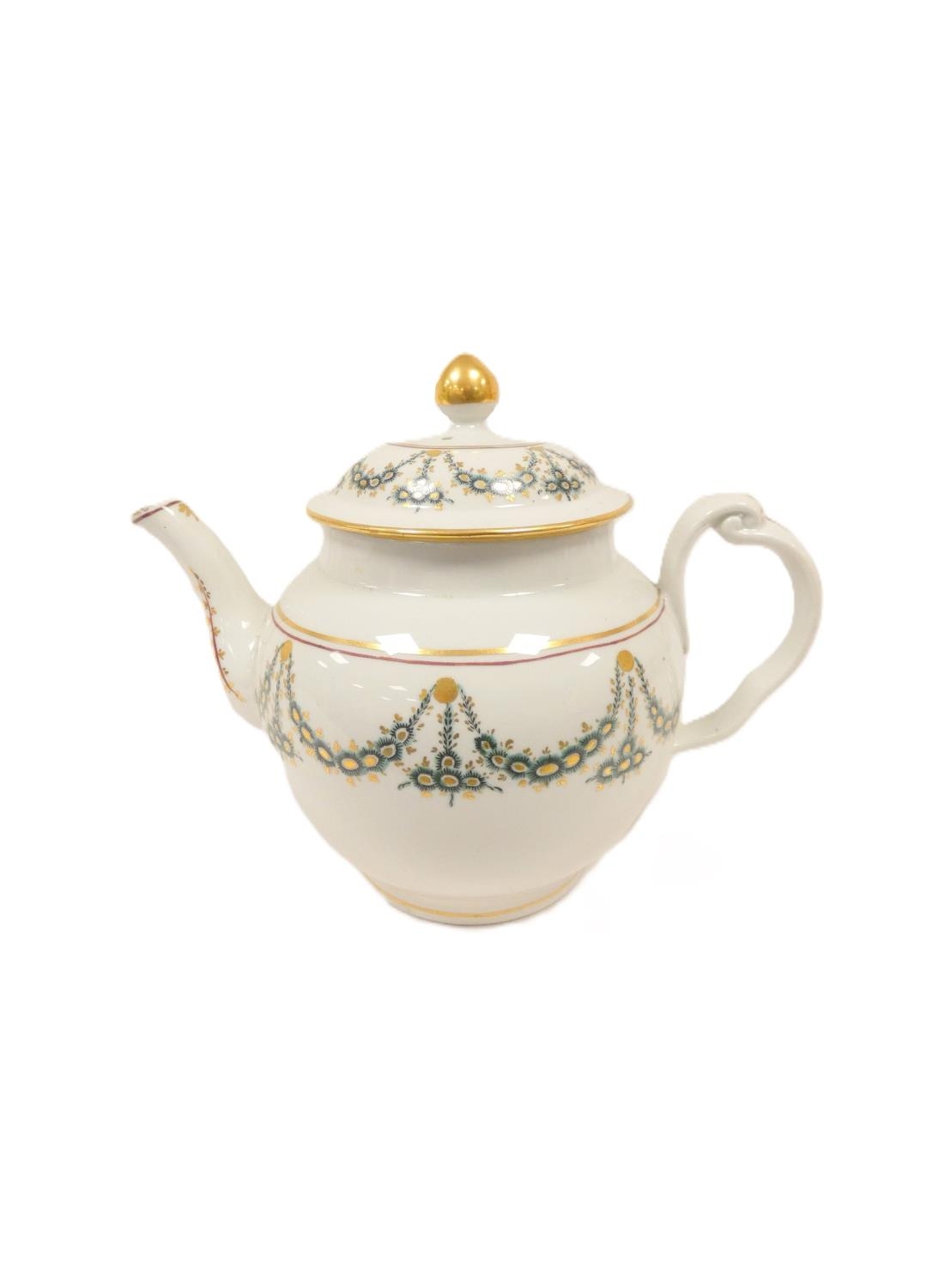 New Hall teapot decorated with green daisy swags and gilt (Preller U24), of globular form with clip handle and curved spout, gilt finial. 18cm high, c.1785/90. Prov. Gary Audley collection.