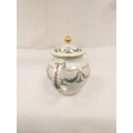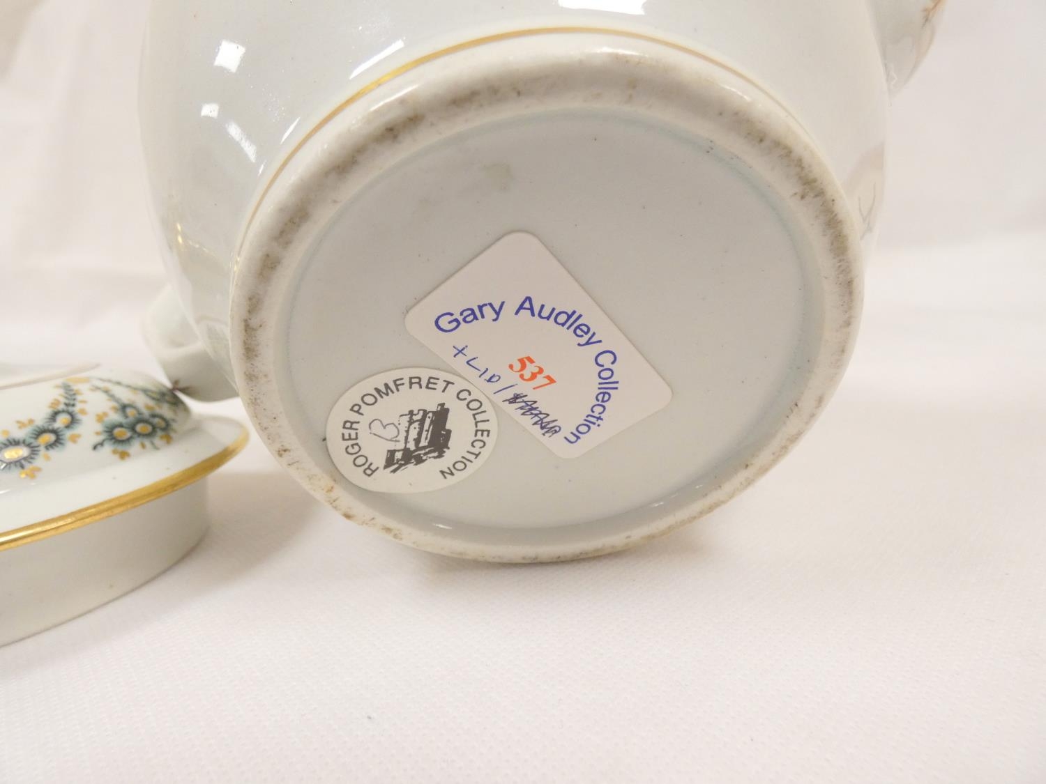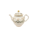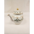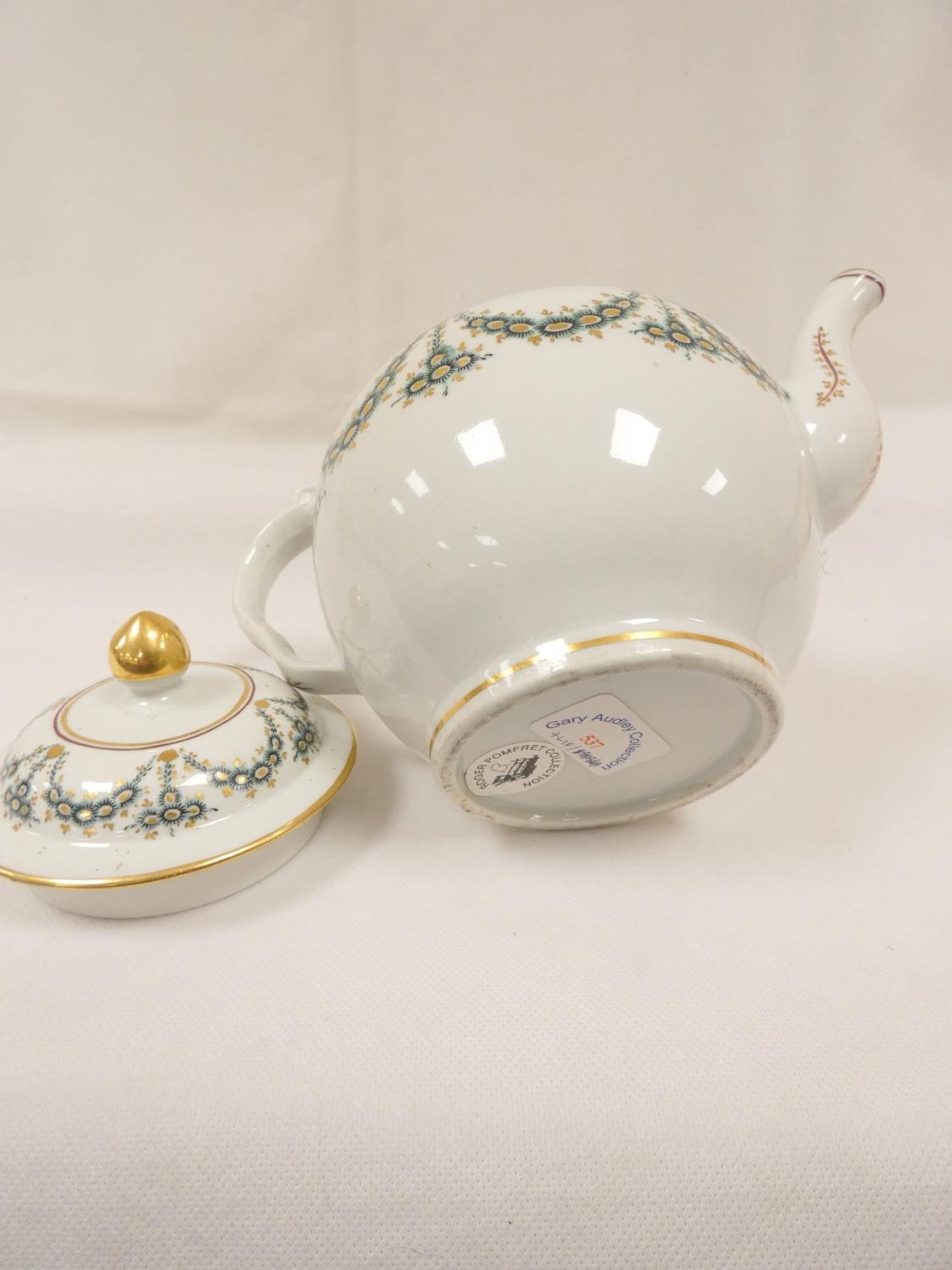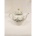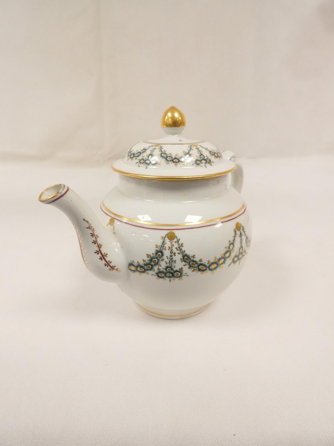 New Hall teapot decorated with green daisy swags and gilt (Preller U24), of globular form with clip handle and curved spout, gilt finial. 18cm high, c.1785/90. Prov. Gary Audley collection.