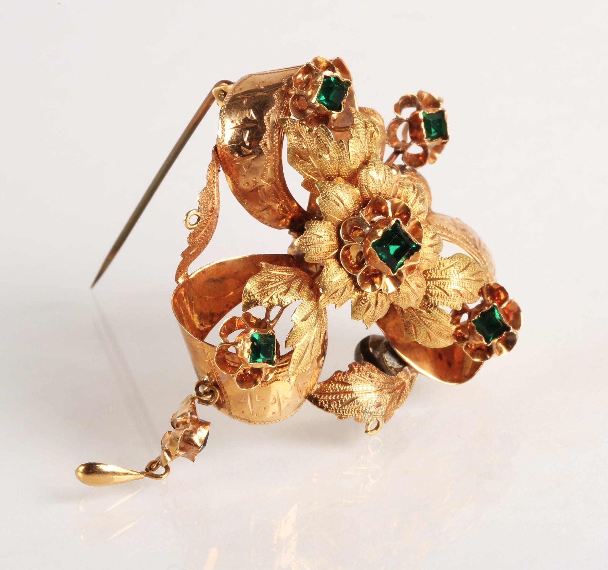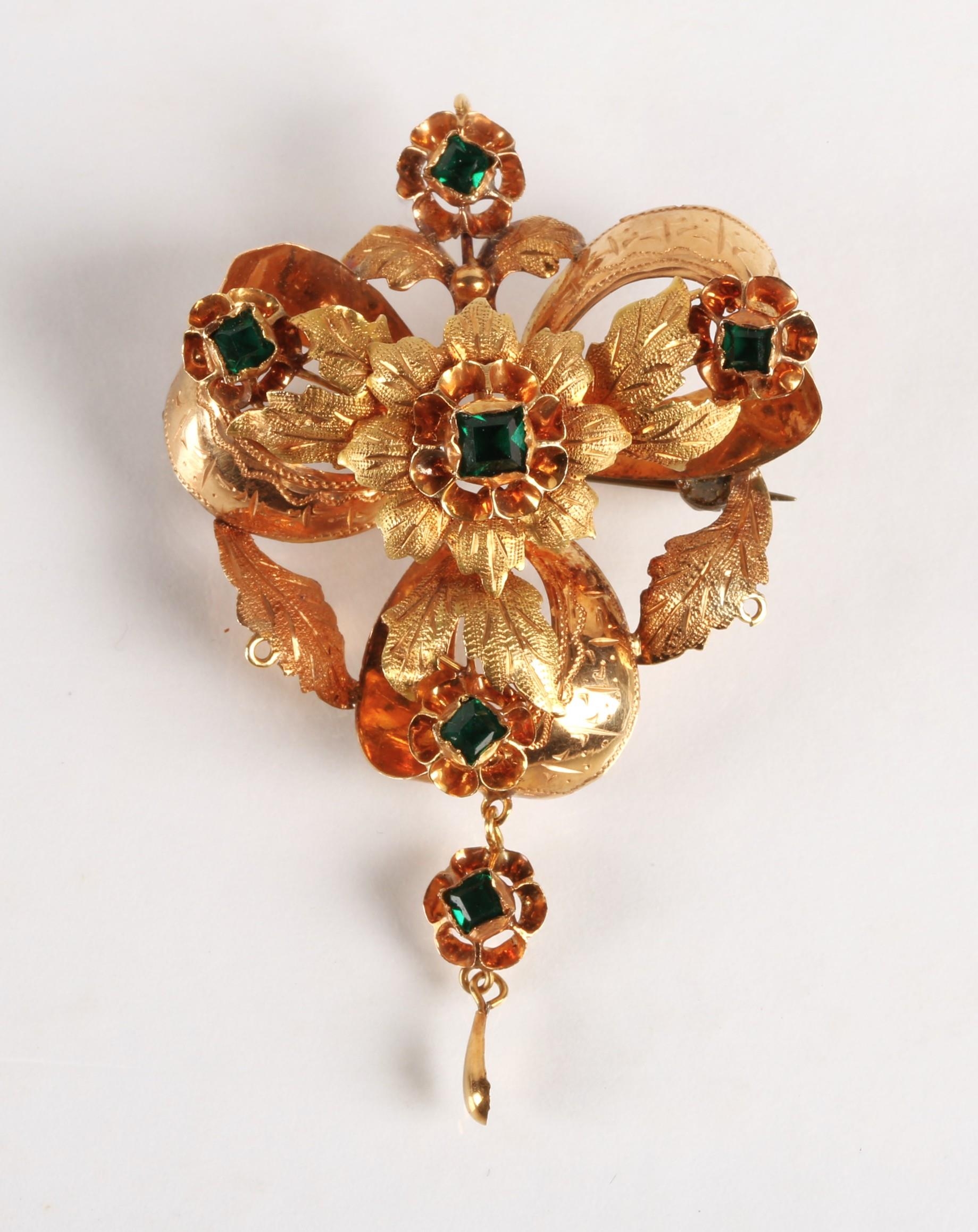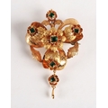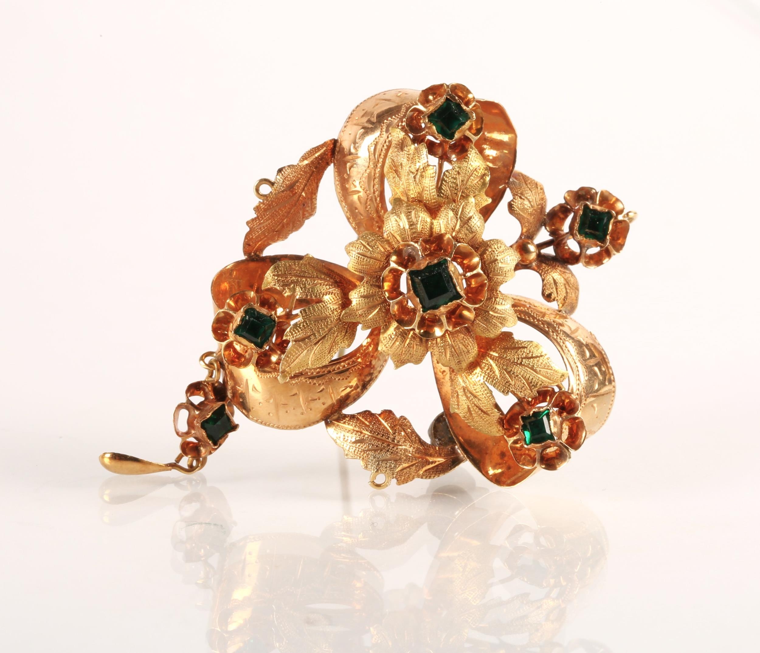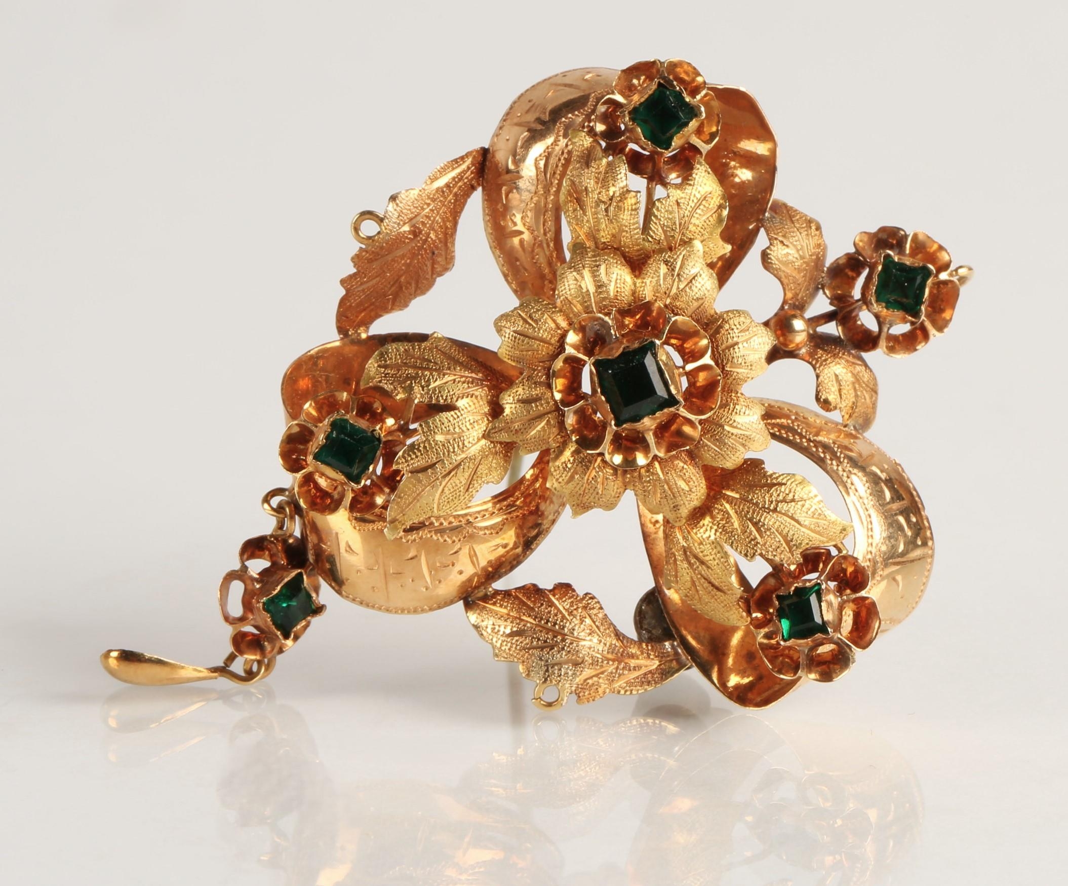 Gold brooch / pendant with drop, set with six small foiled emeralds, unmarked, approximately 5.5cm, gross weight 6.7 grams