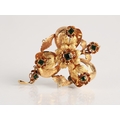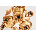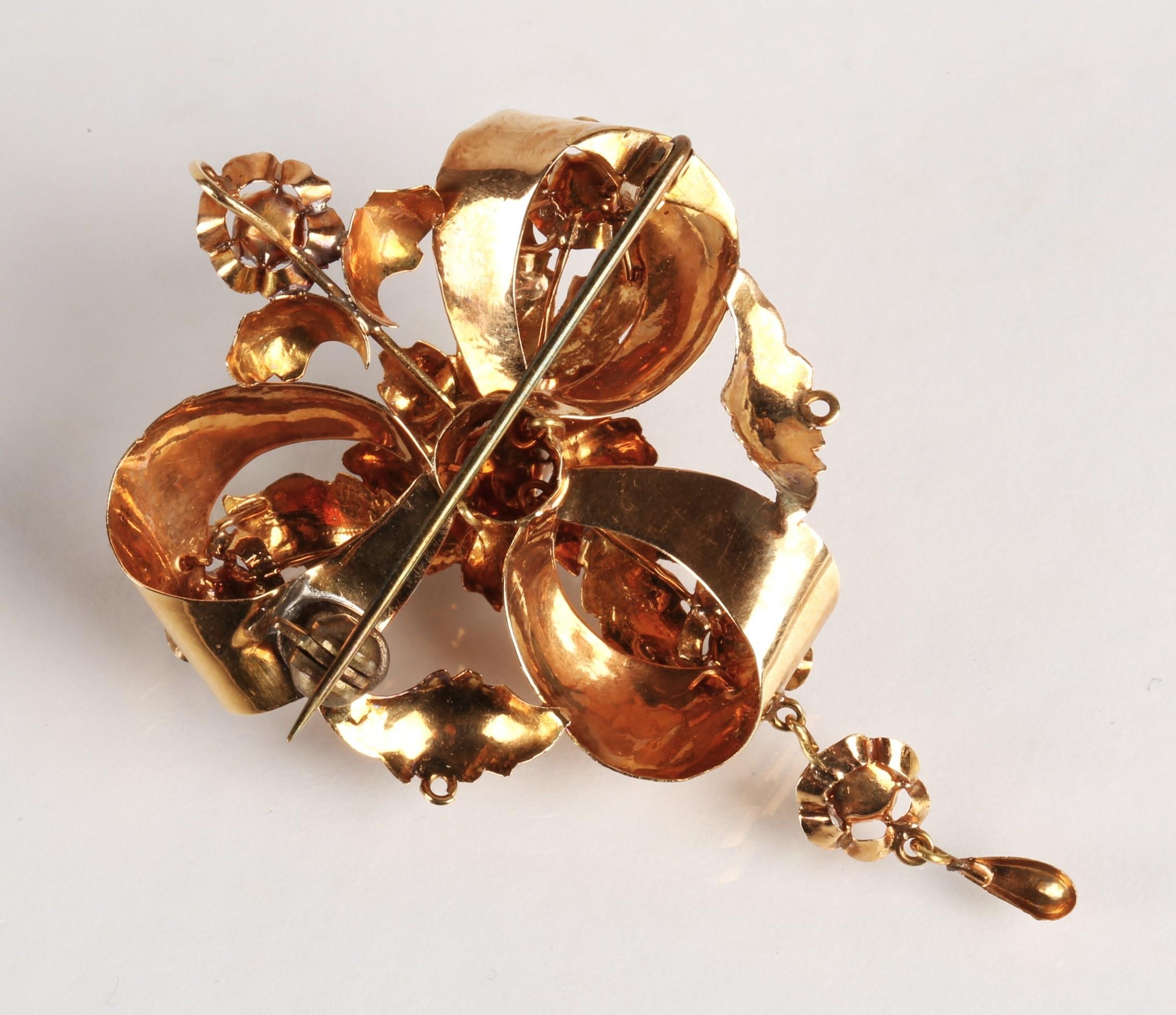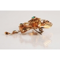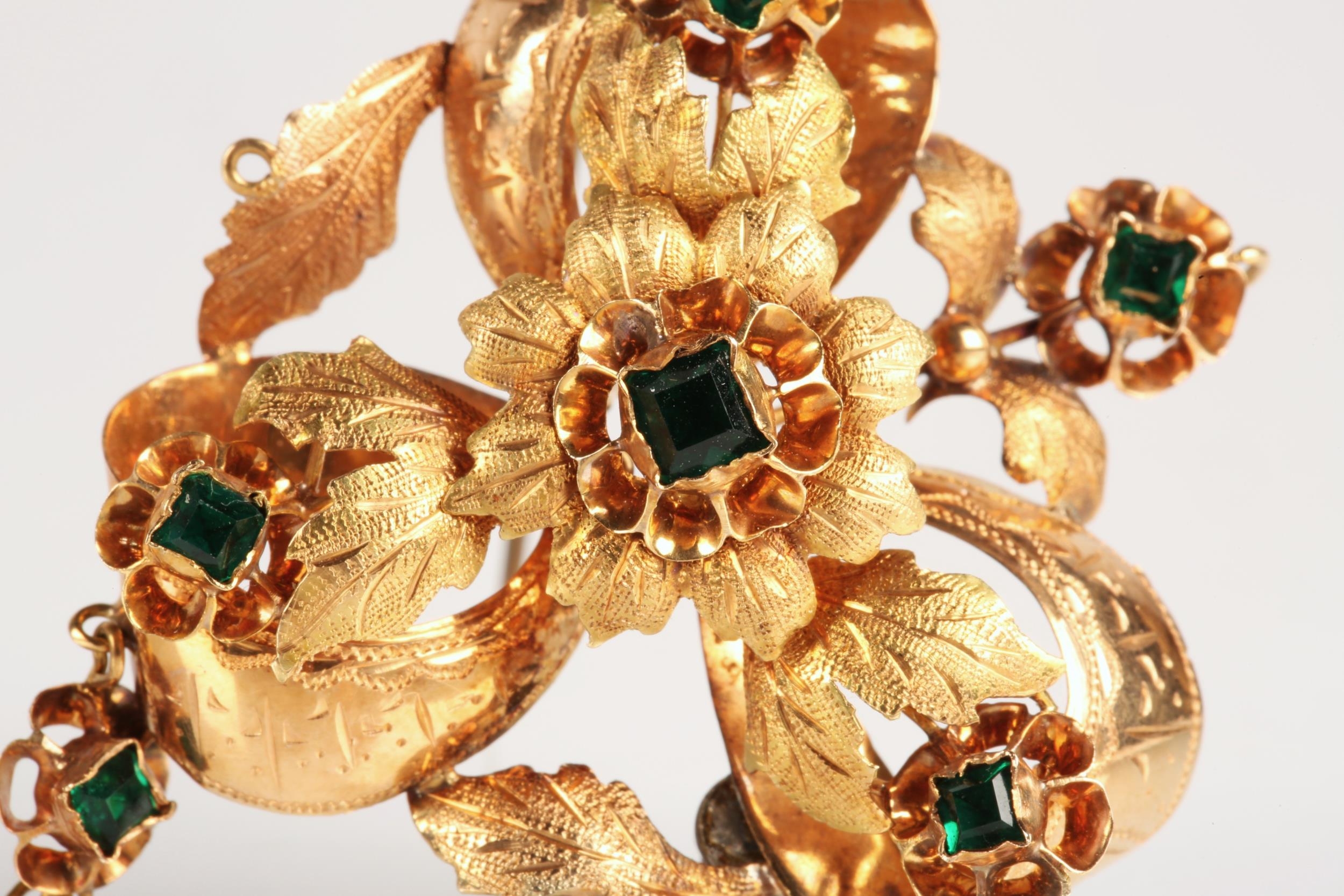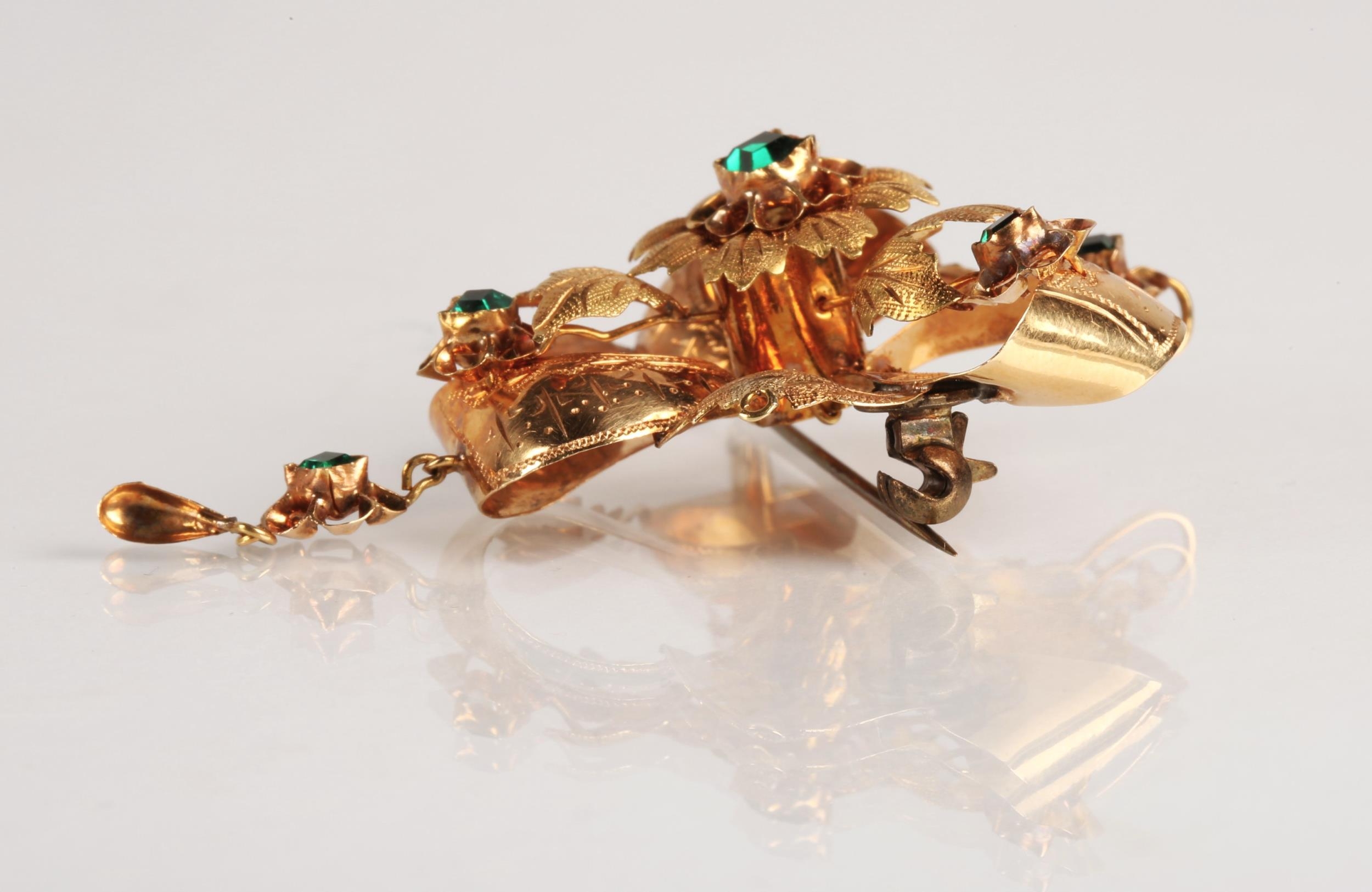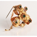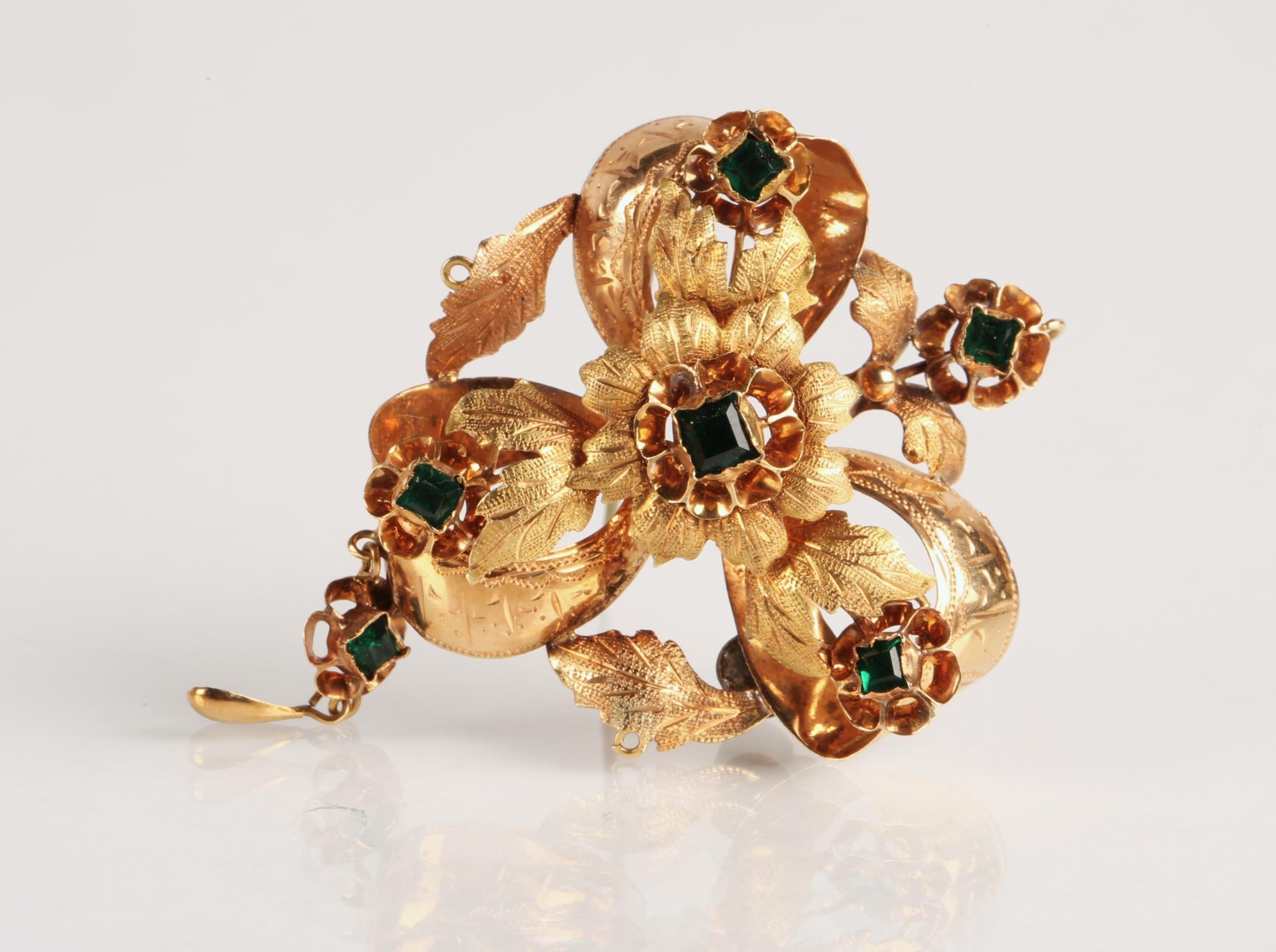 Gold brooch / pendant with drop, set with six small foiled emeralds, unmarked, approximately 5.5cm, gross weight 6.7 grams