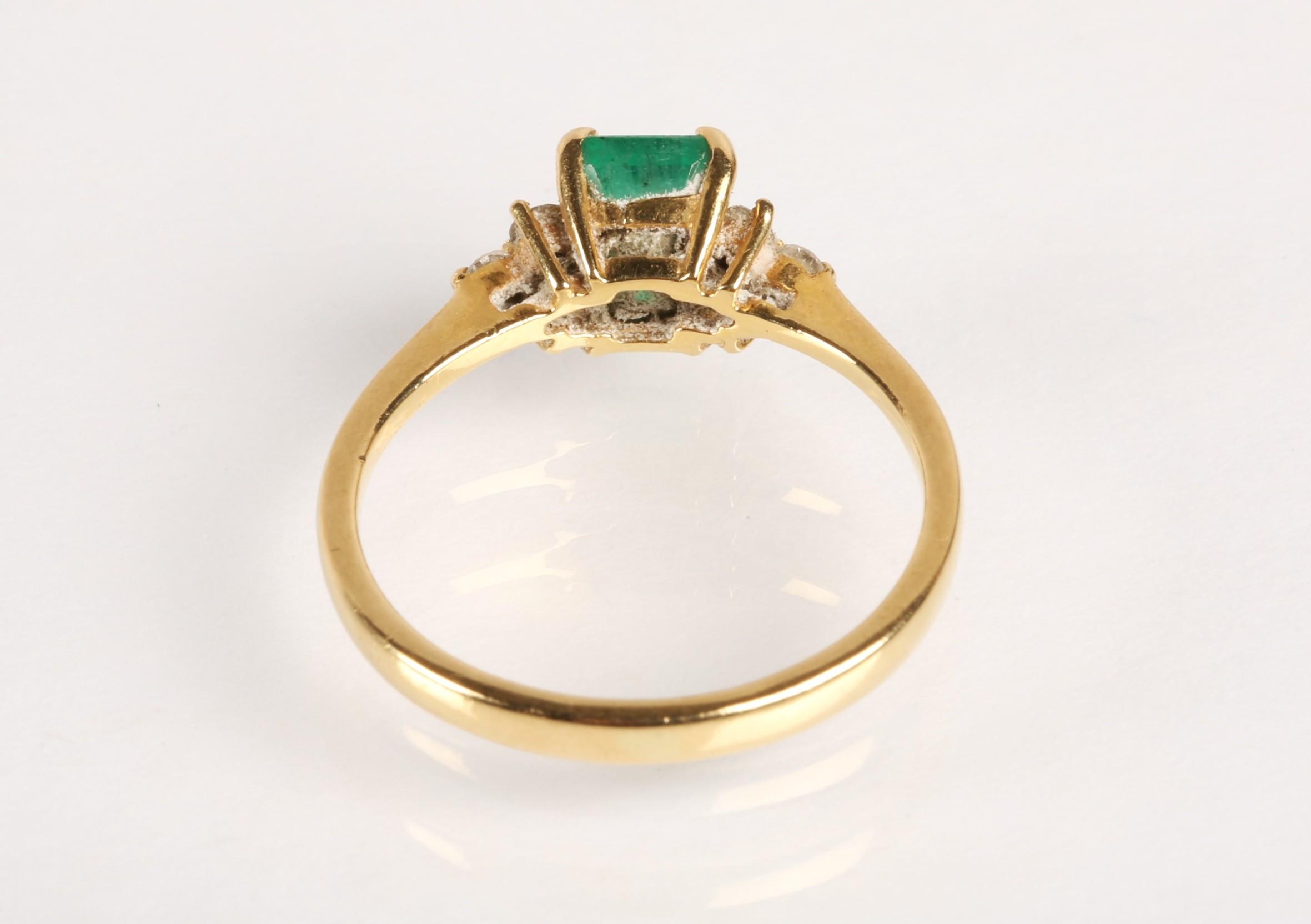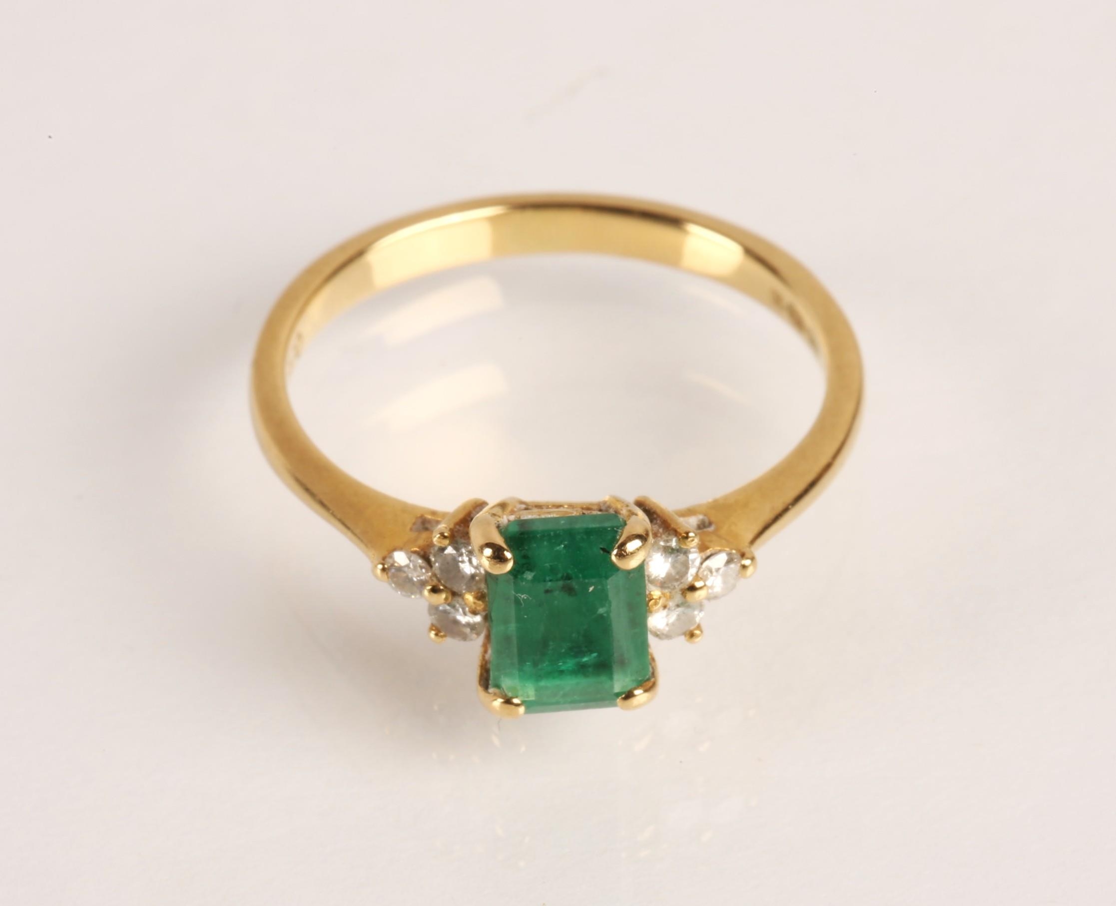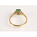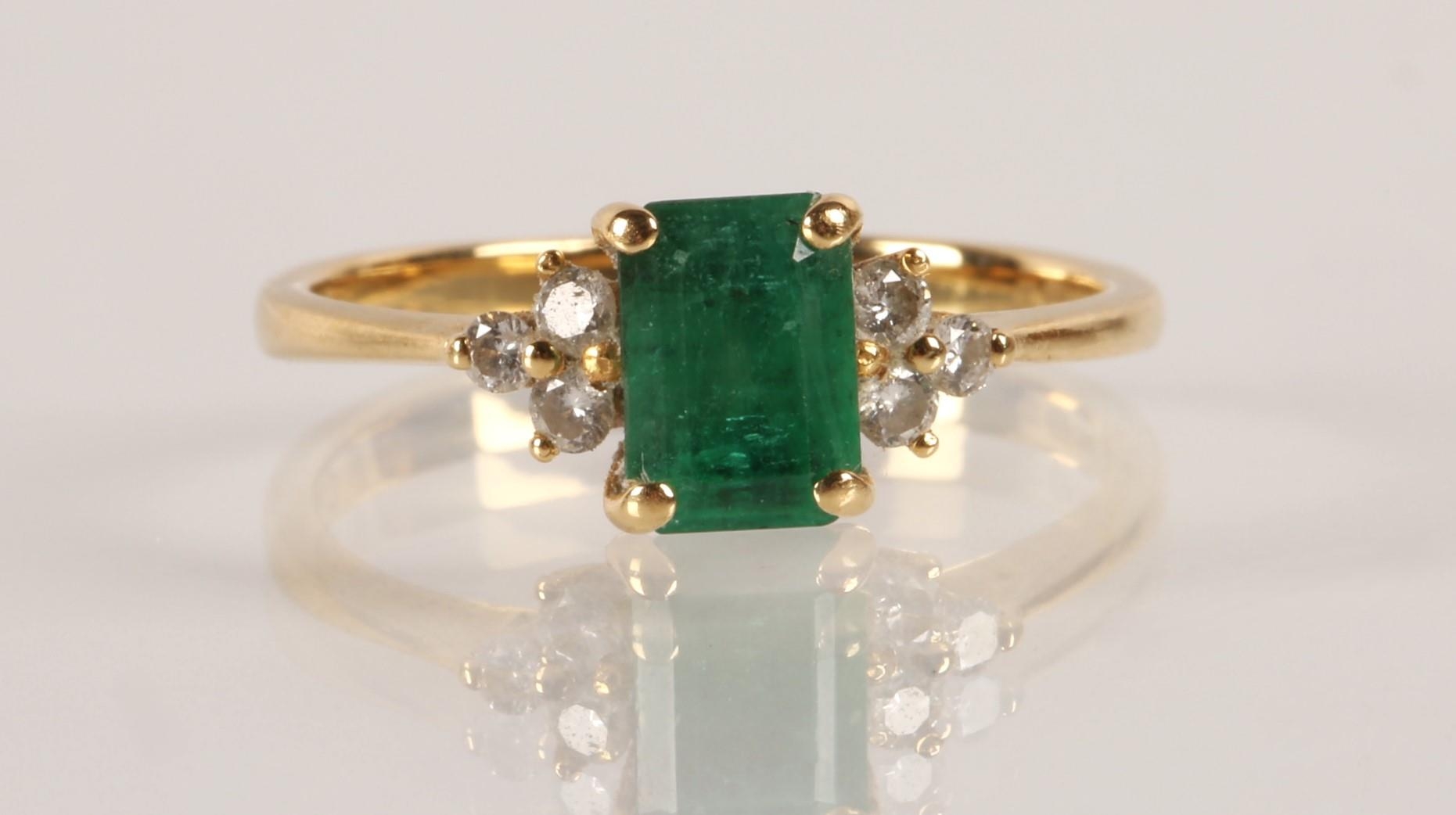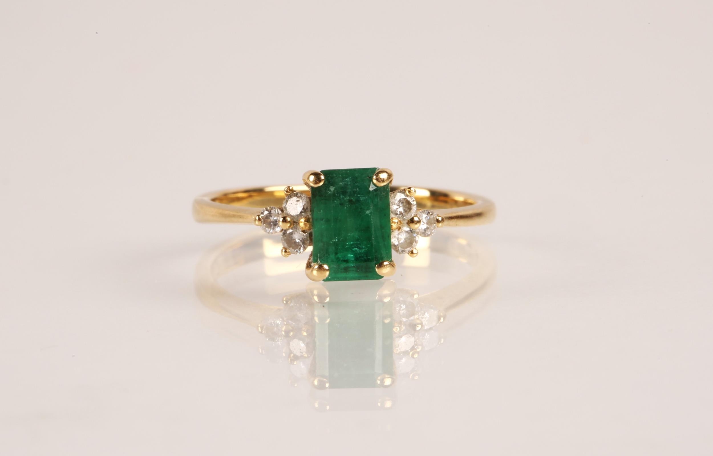 Emerald and diamond ladies cluster ring on gold, set with an emerald cut emerald measuring approximately 5mm, flanked with trefoil small brilliants, size O, gross weight 2.7 grams