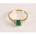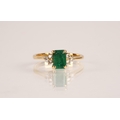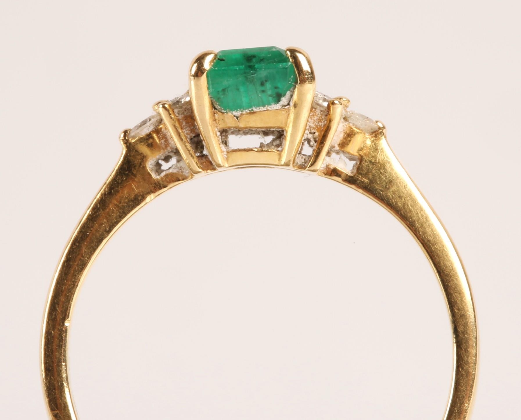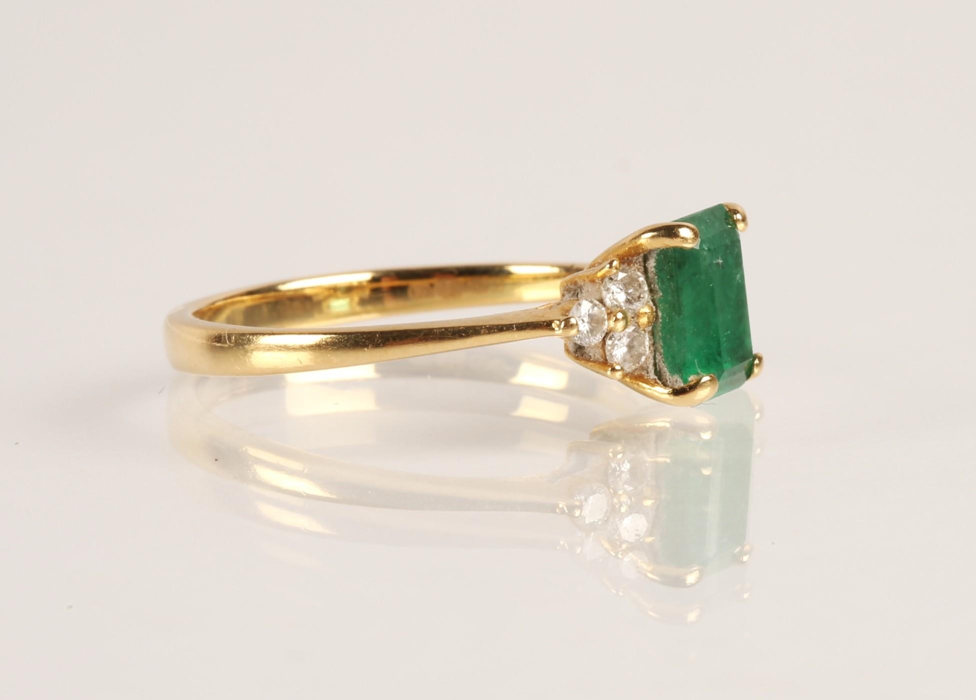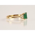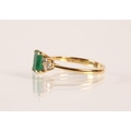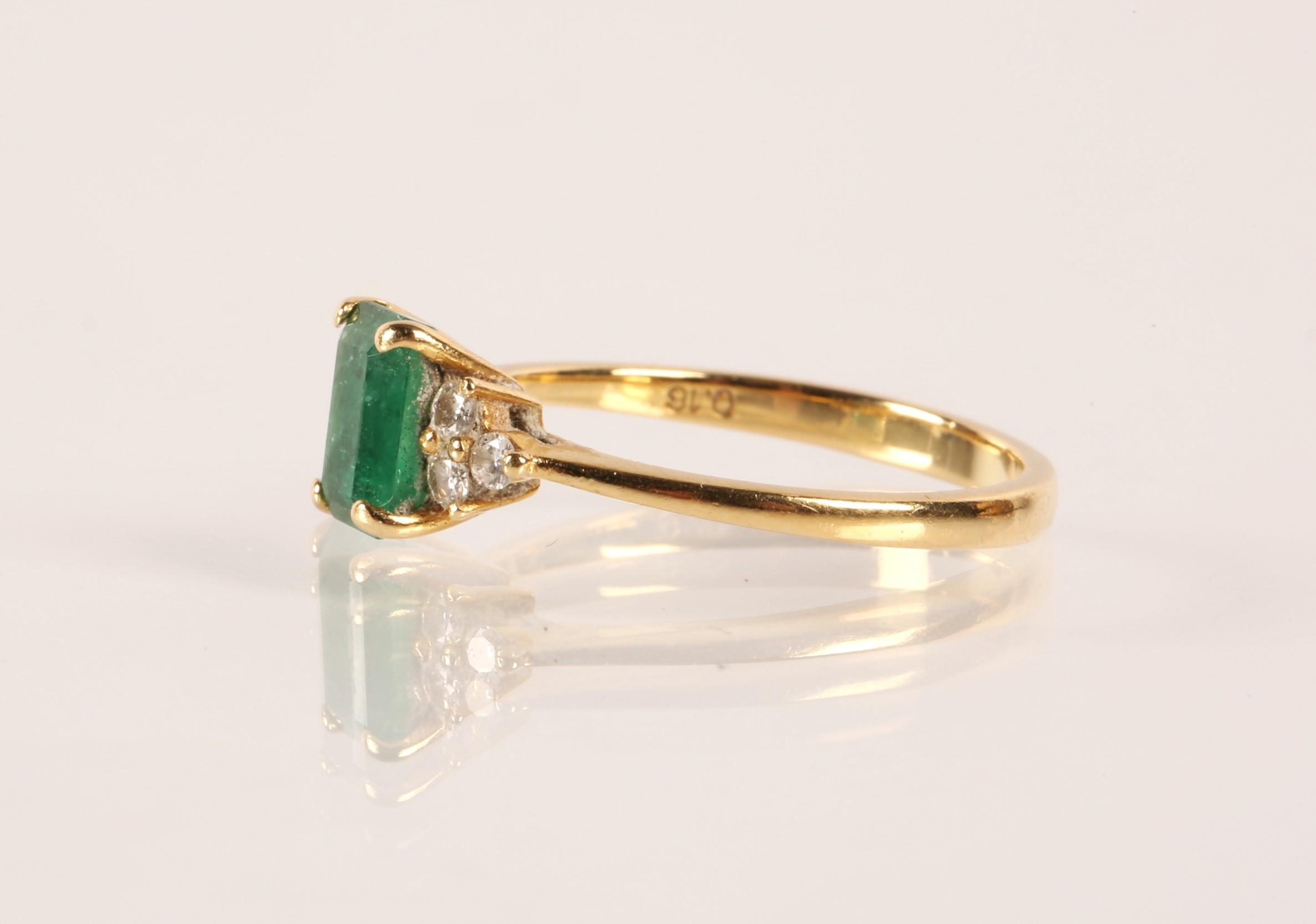 Emerald and diamond ladies cluster ring on gold, set with an emerald cut emerald measuring approximately 5mm, flanked with trefoil small brilliants, size O, gross weight 2.7 grams