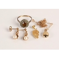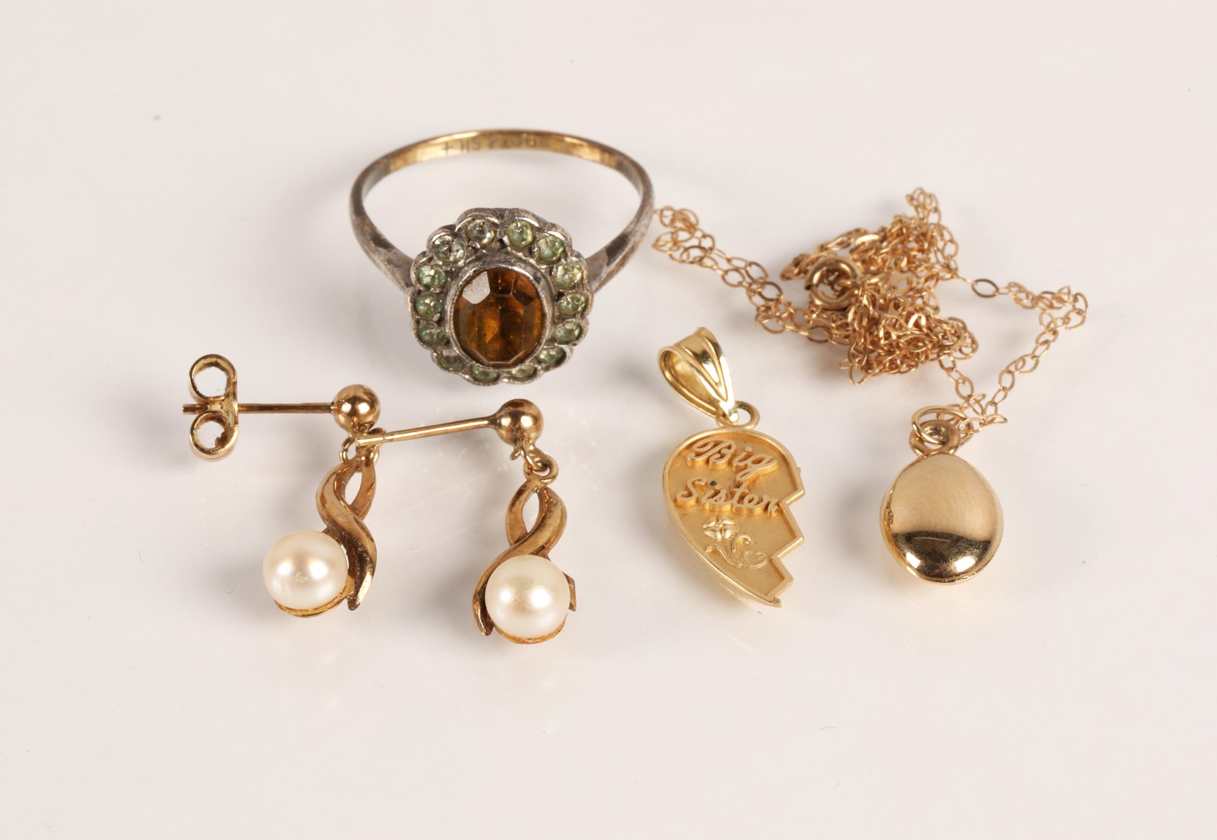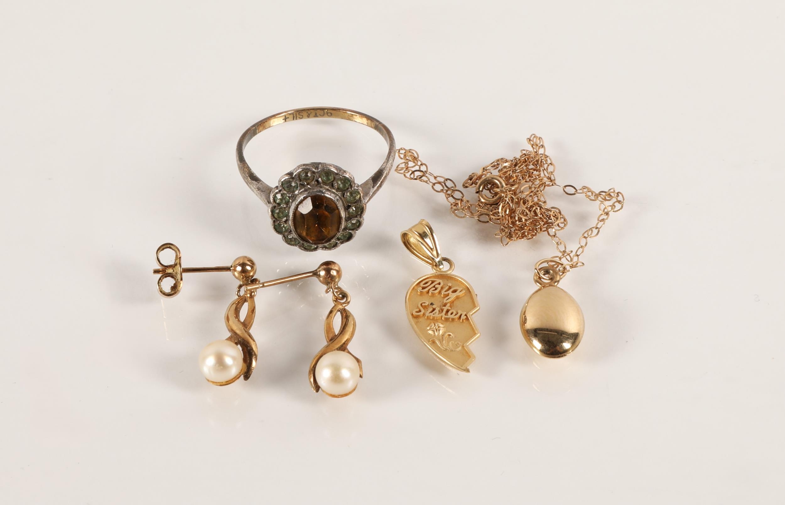 Gold and yellow metal to include pair 9ct pearl earrings (1.2g), 9ct & silver ring (2.5g) 14K gold 'Big Sister' charm (0.7g), and a 9K gold chain with yellow metal coffee bean pendant (0.7g)