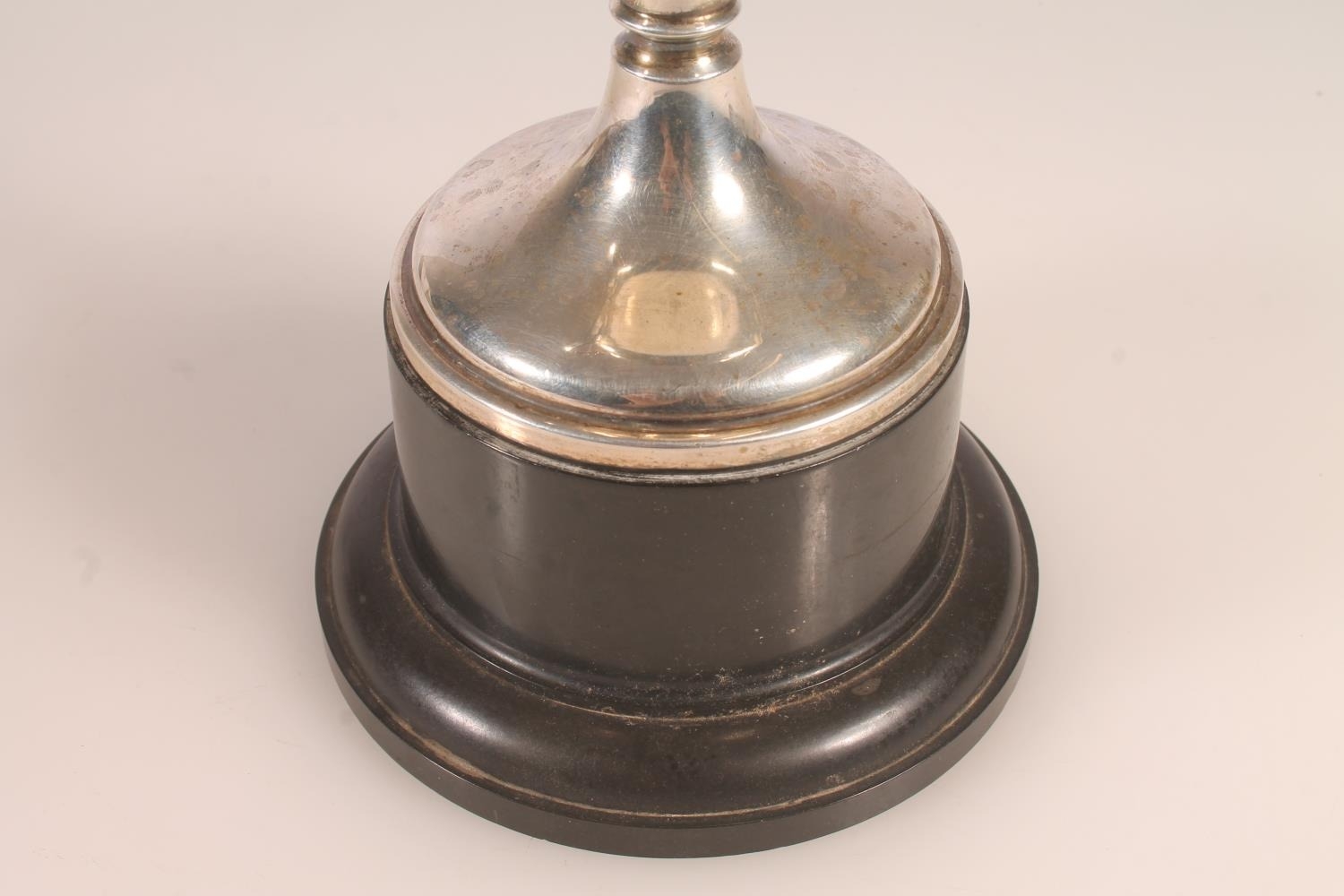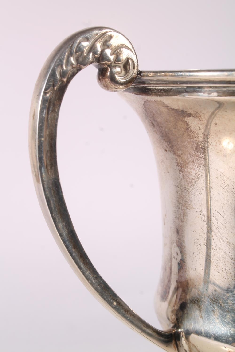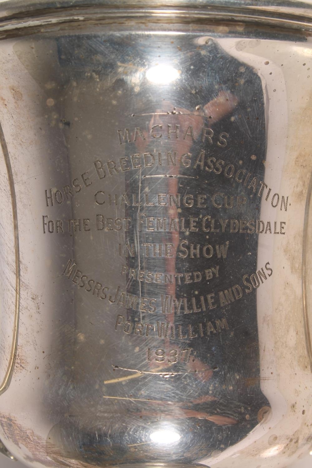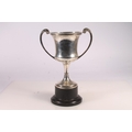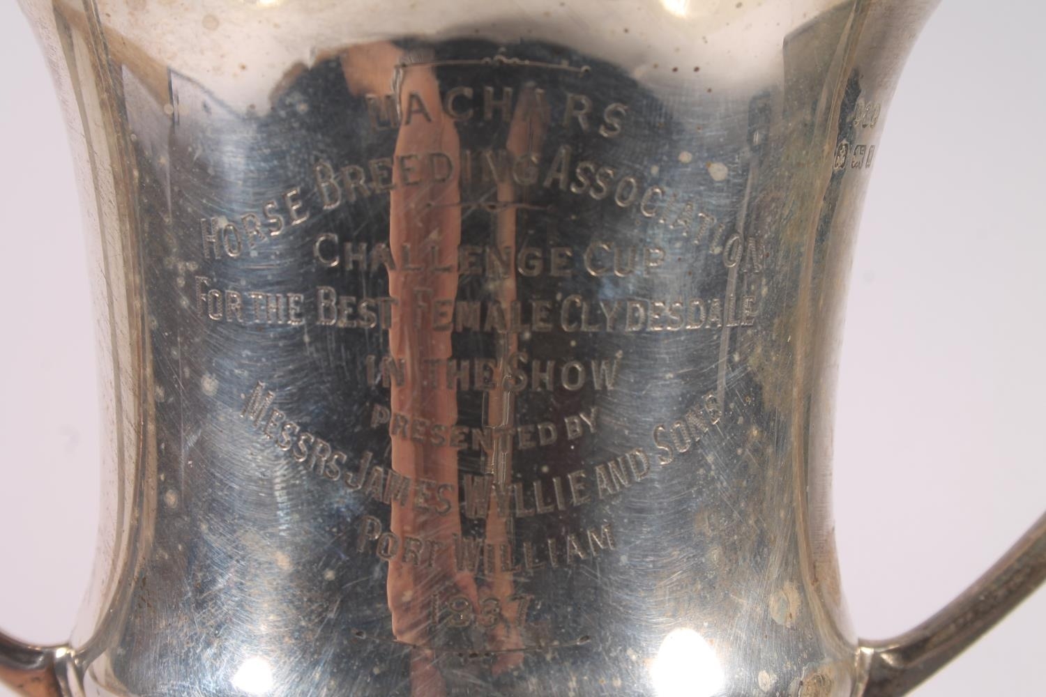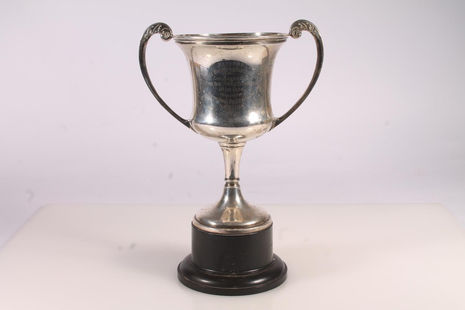 Geo. V silver trophy, the two handled body engraved 'Machars Horse Breeding Association Challenge Cup for the Best Female Clydesdale in the Show, Messrs James Wyllie and Sons Port William 1937', Davies and Powers Birmingham 1934, height on black pedestal base 28.5cm, silver weight 406g.