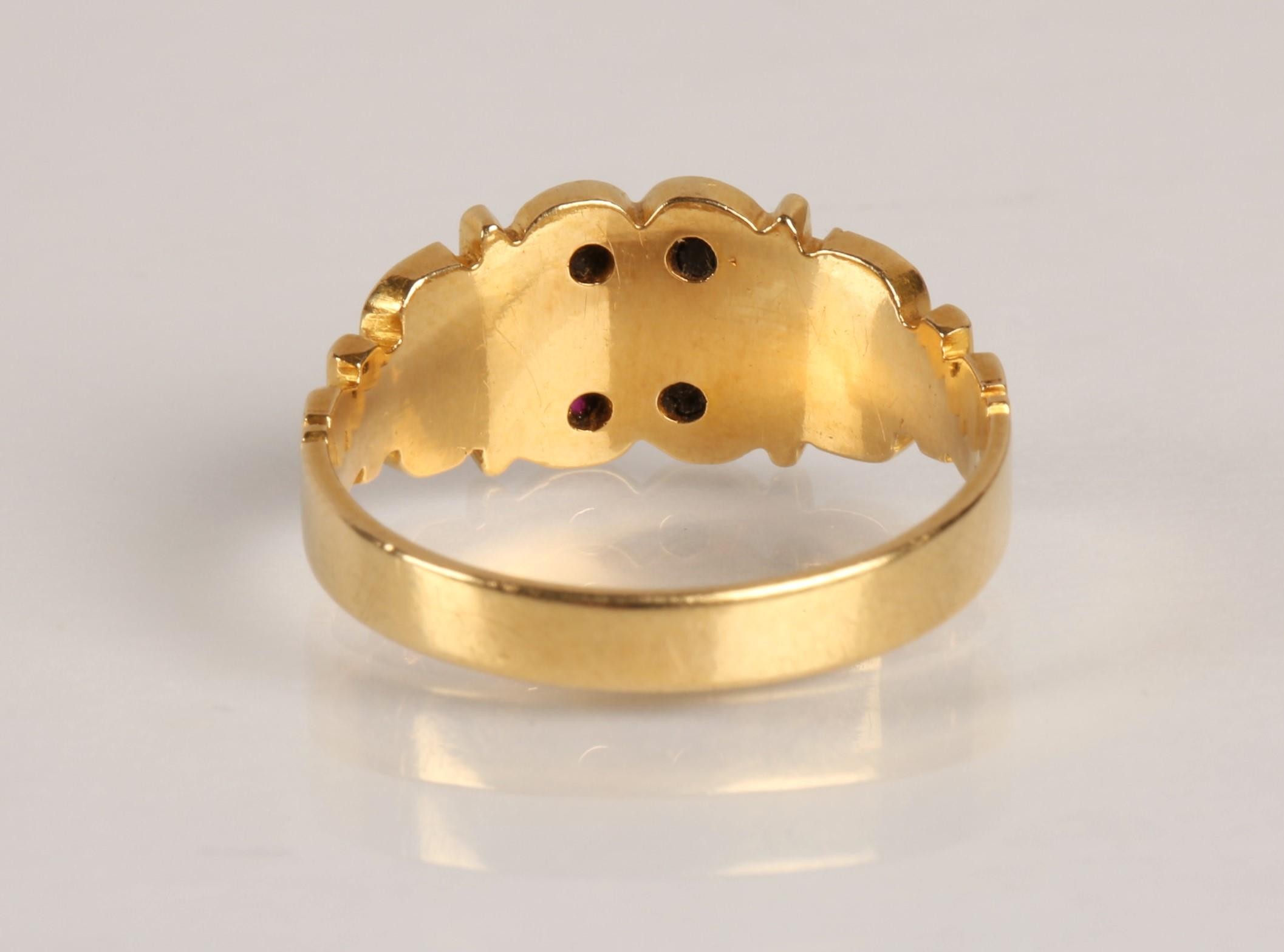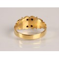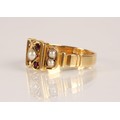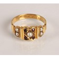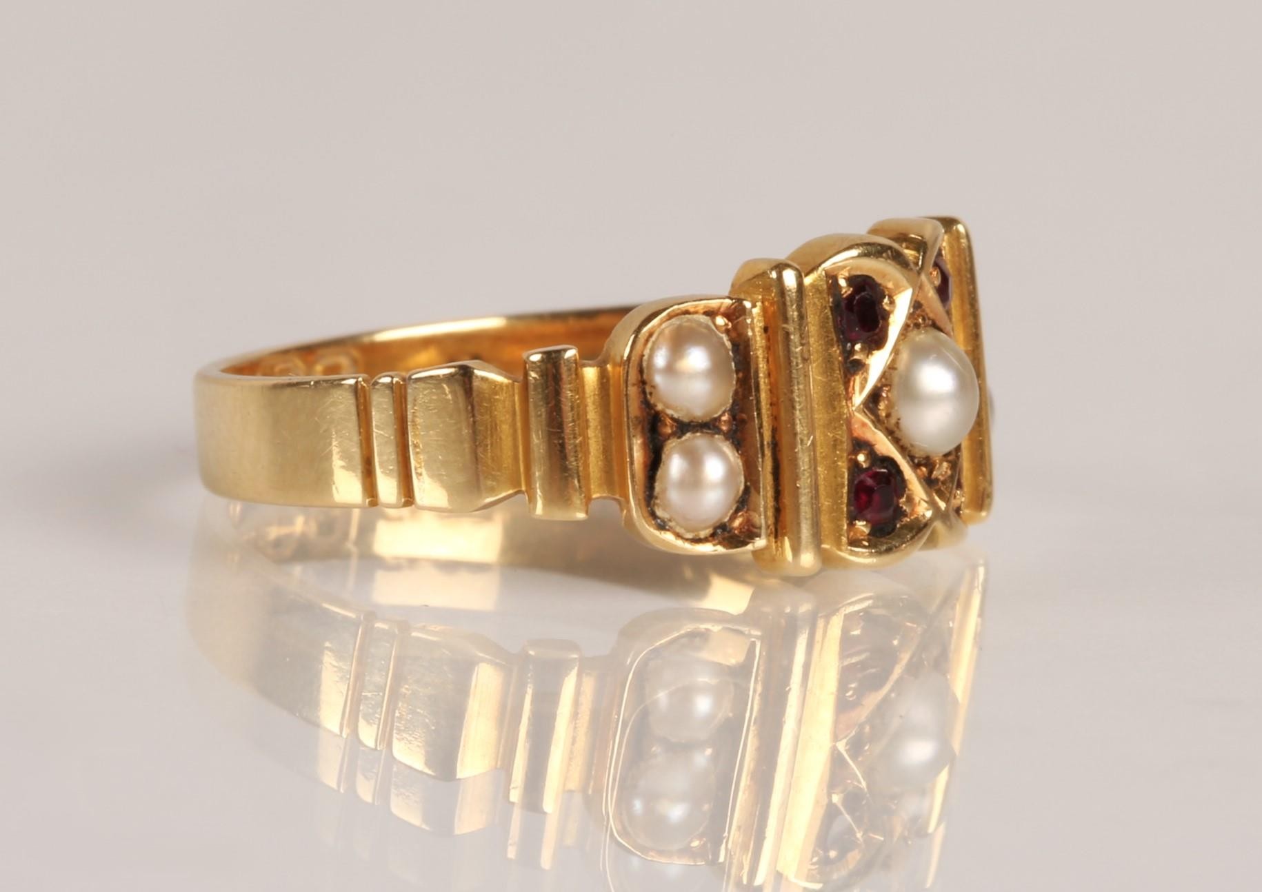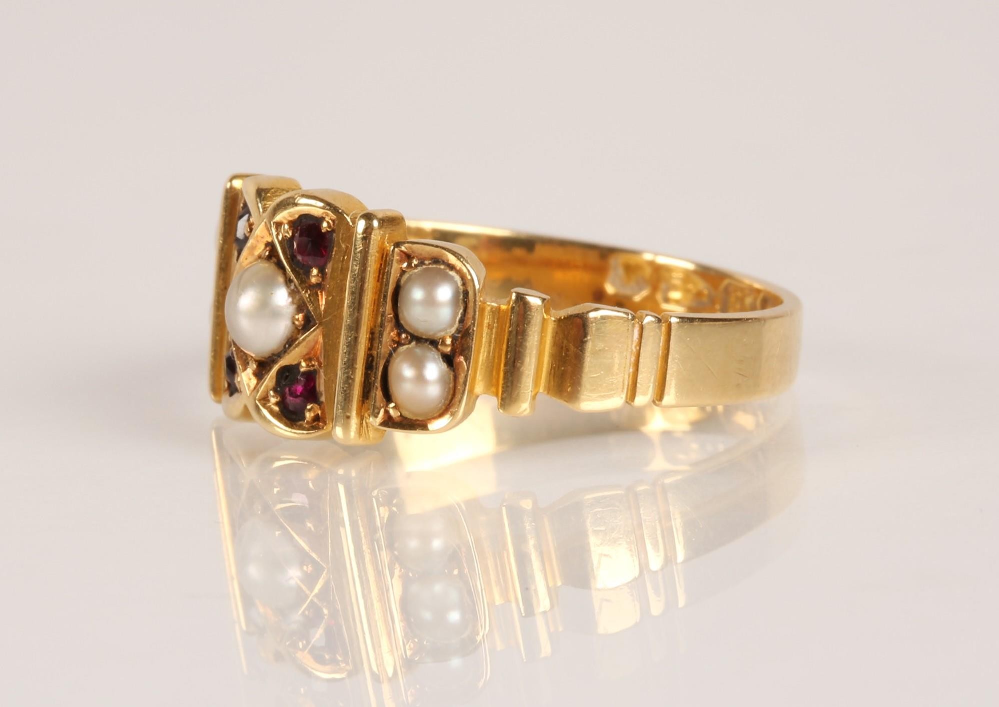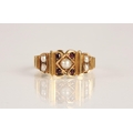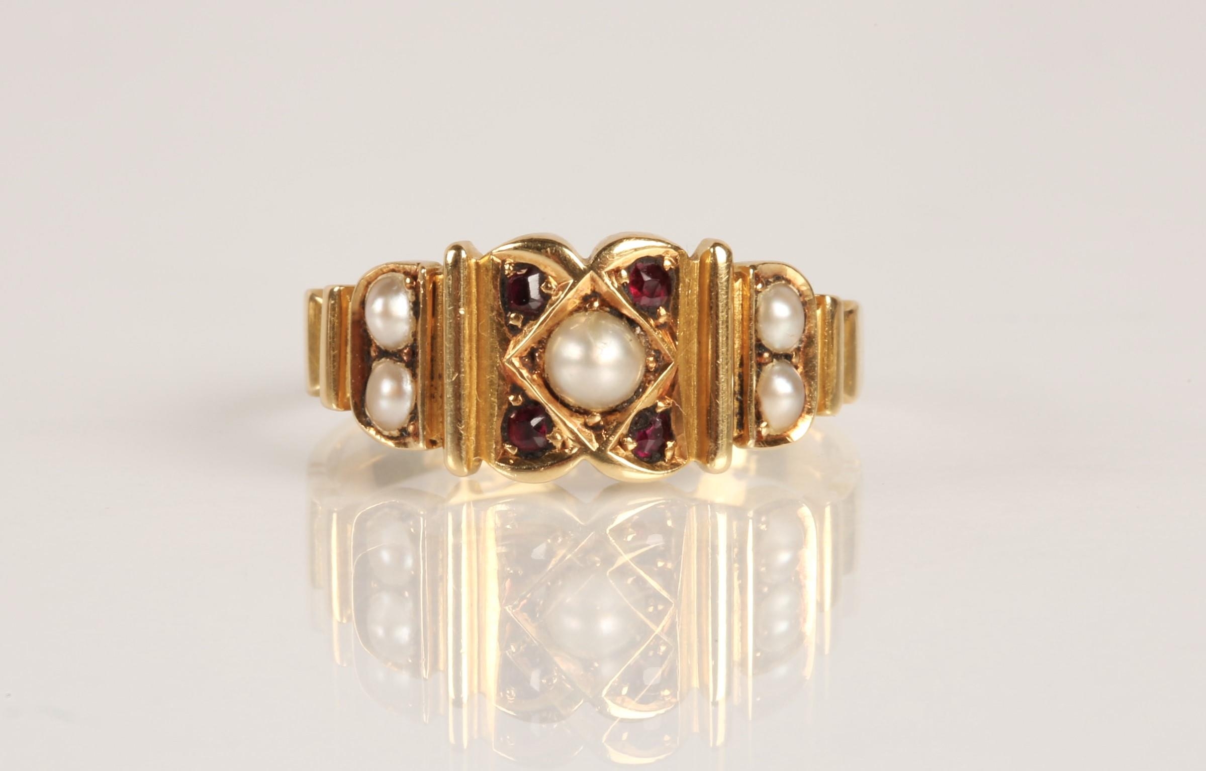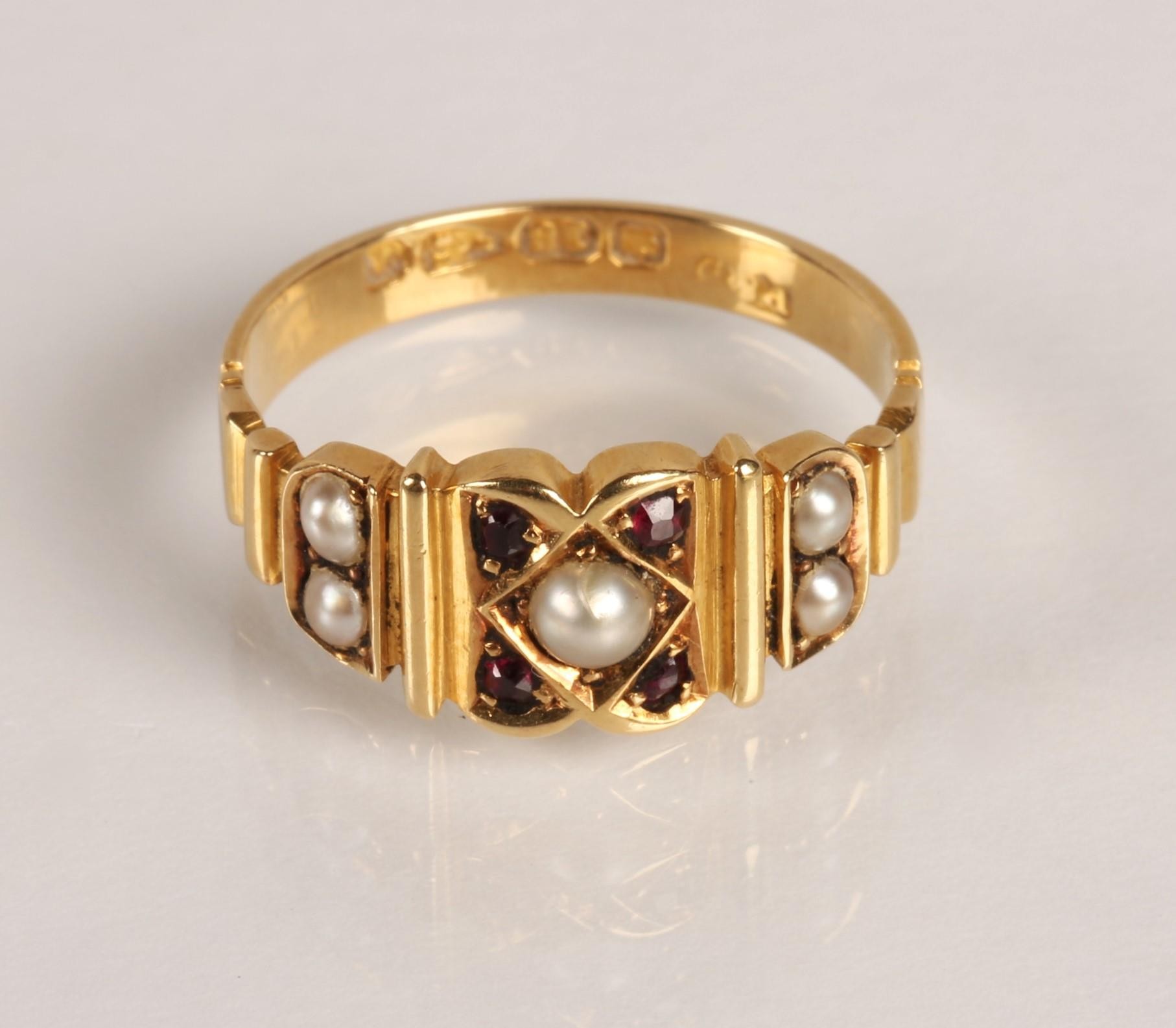 18ct gold garnet and seed pearl ring, Ring size O, gross wei...