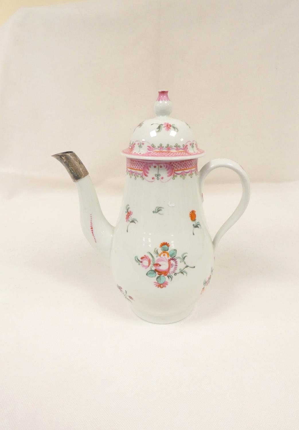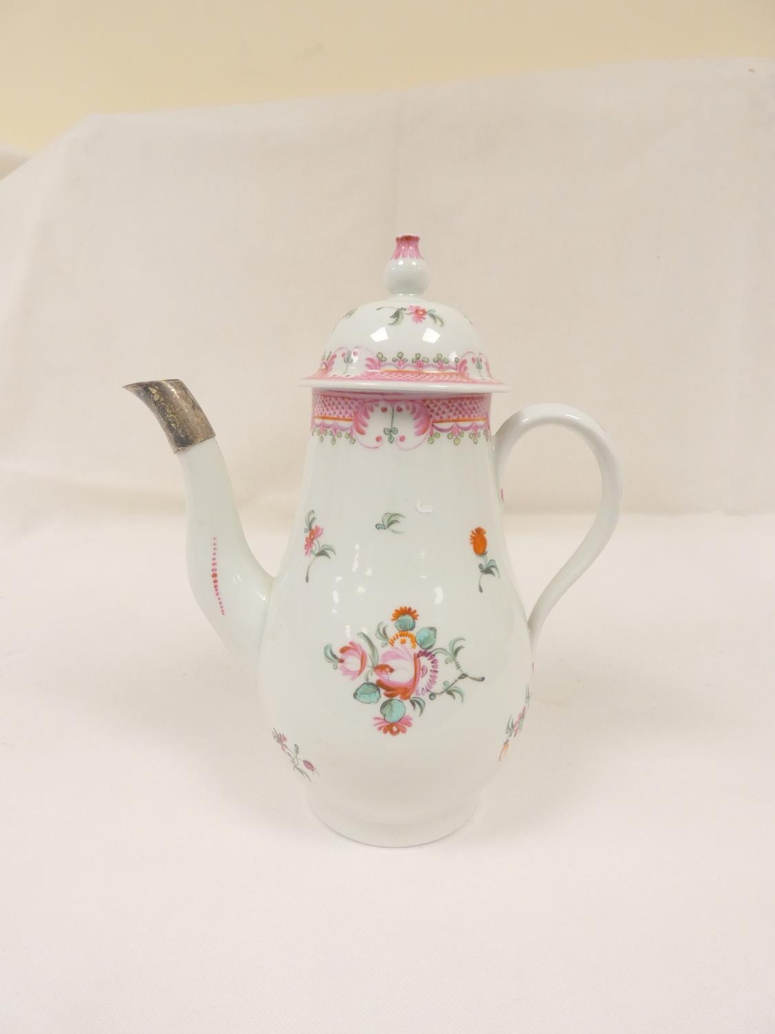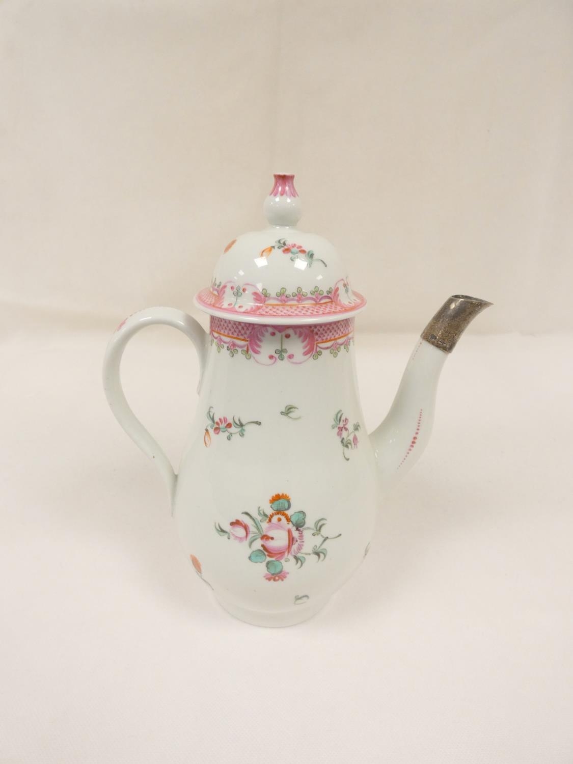 New Hall coffee pot decorated with floral sprays and pink hatched border (pattern 173), of baluster form with onion finial, the curved spout with silver terminal (hallmark 1940). 29cm high, c.1795/1800.