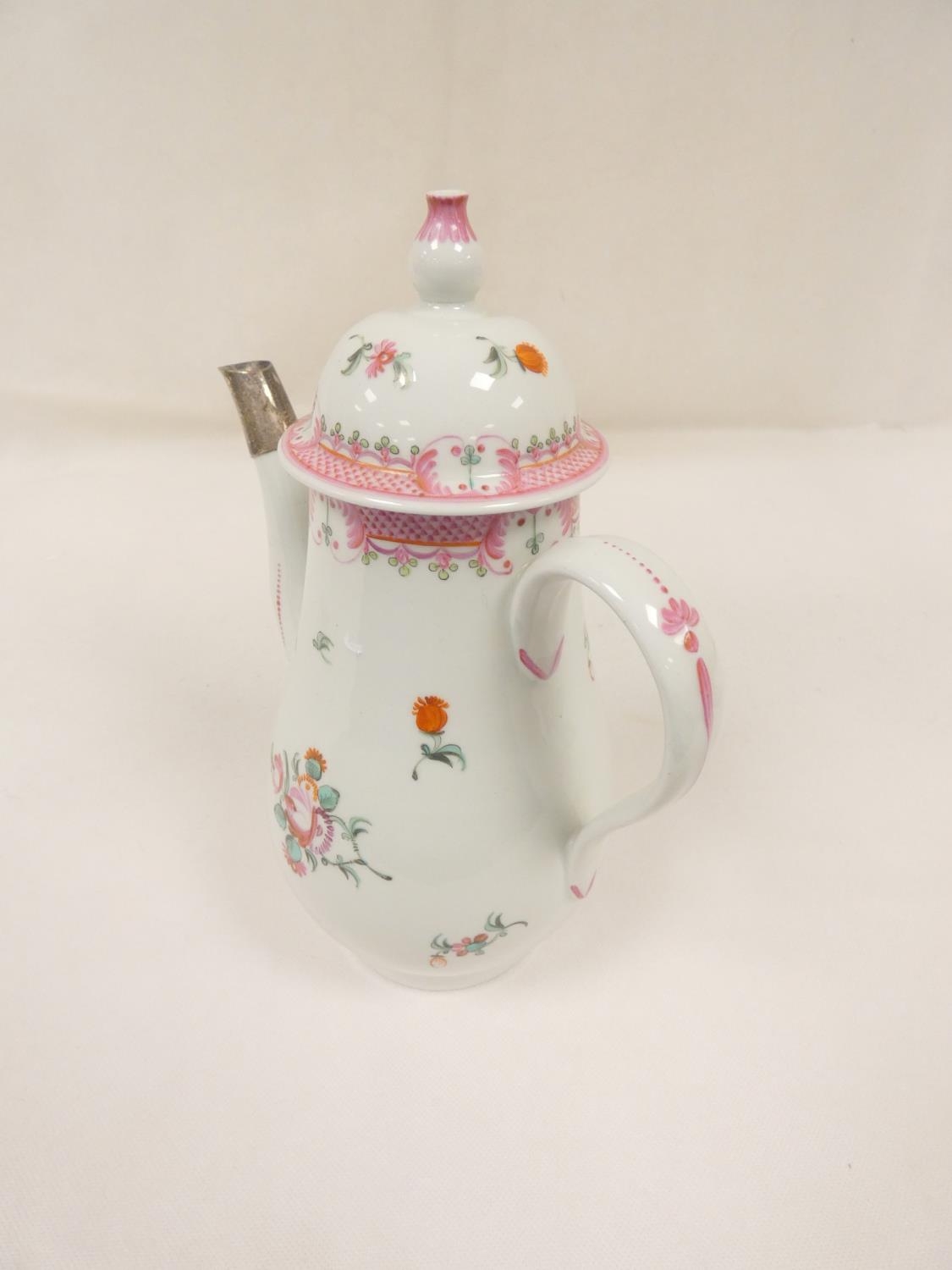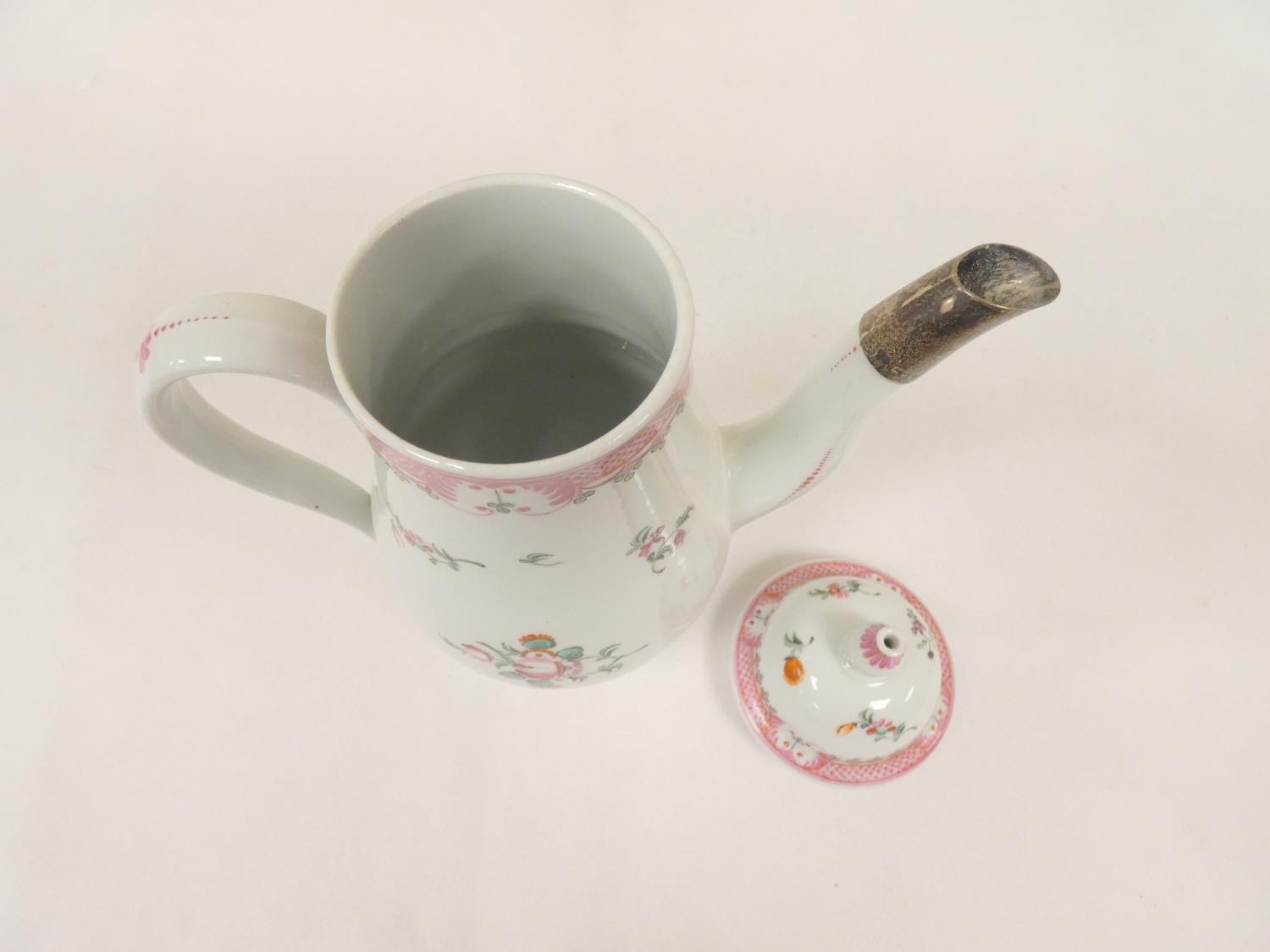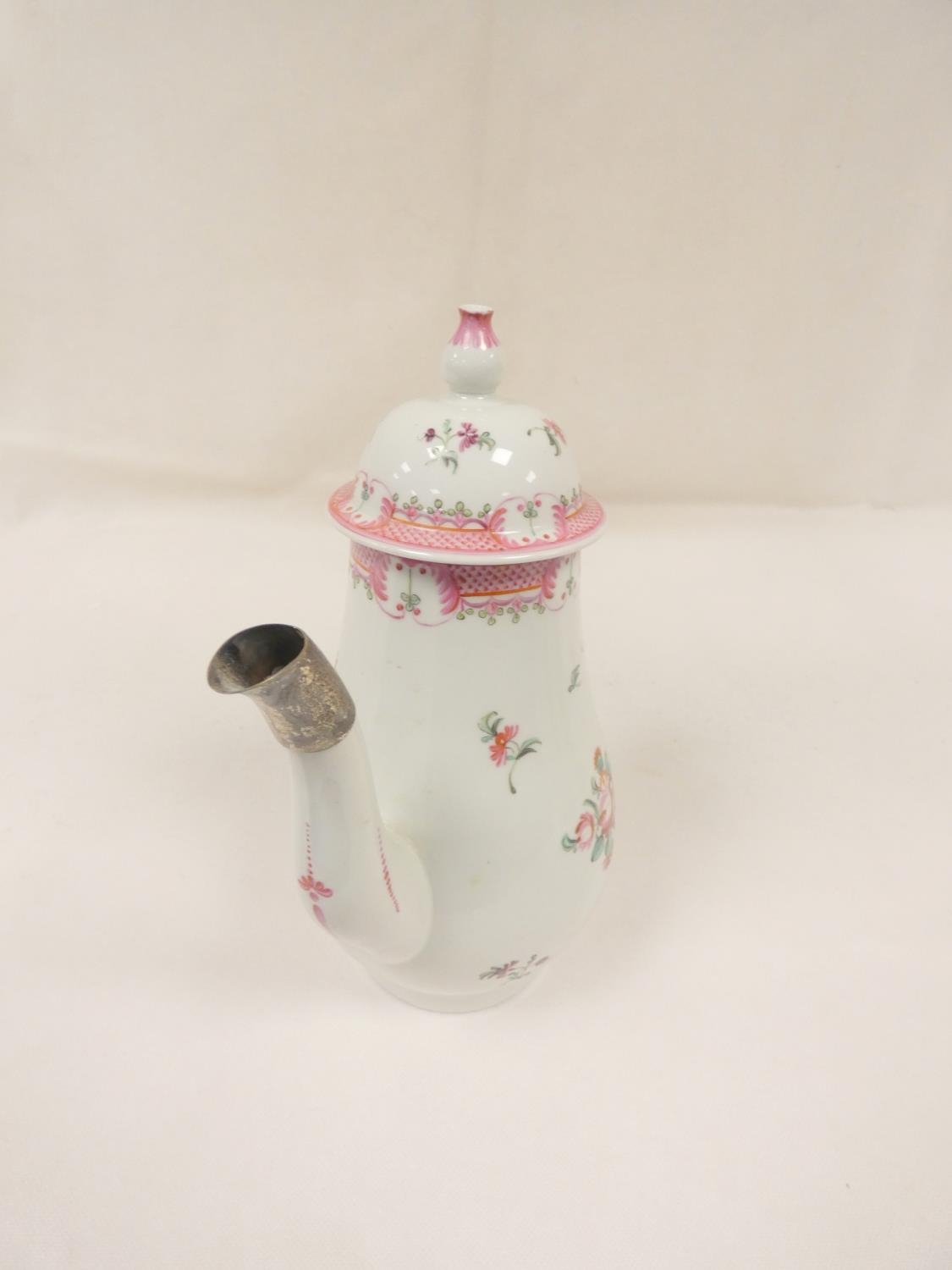 New Hall coffee pot decorated with floral sprays and pink hatched border (pattern 173), of baluster form with onion finial, the curved spout with silver terminal (hallmark 1940). 29cm high, c.1795/1800.