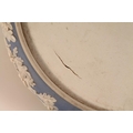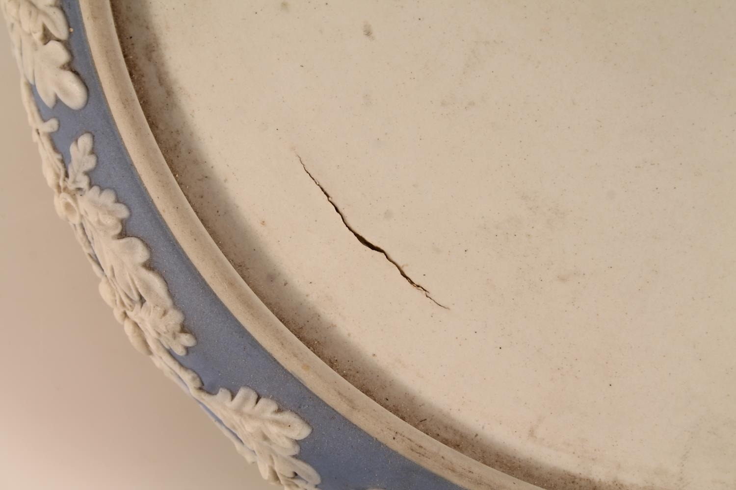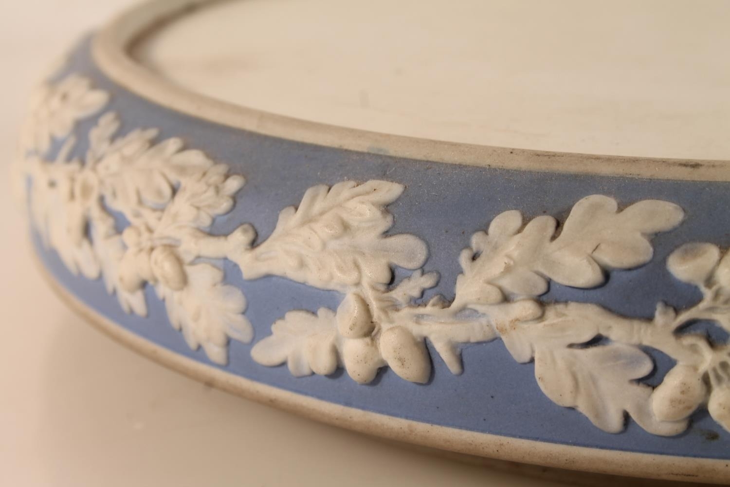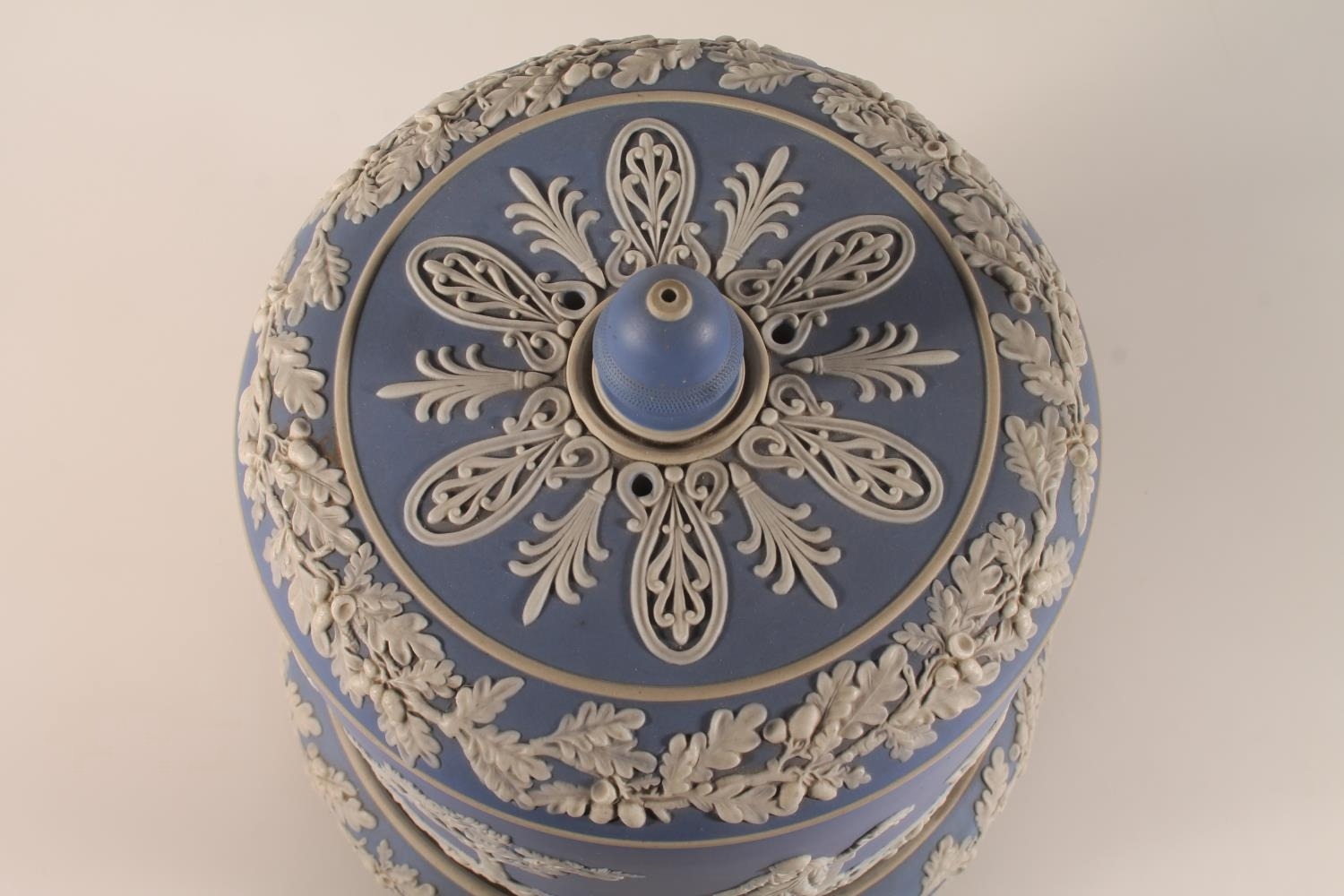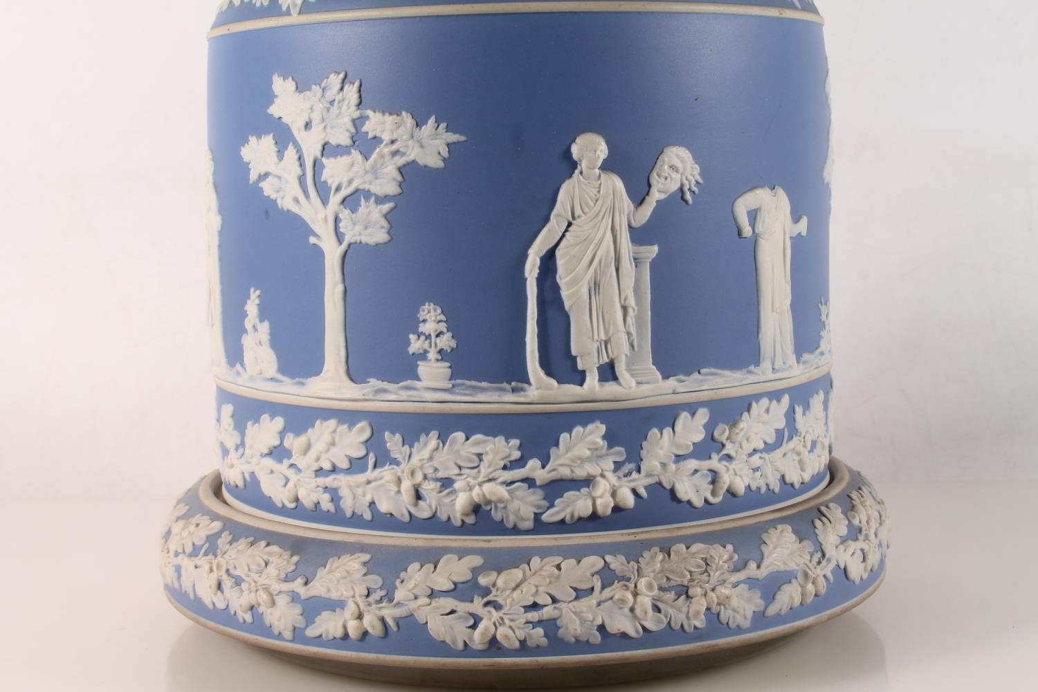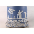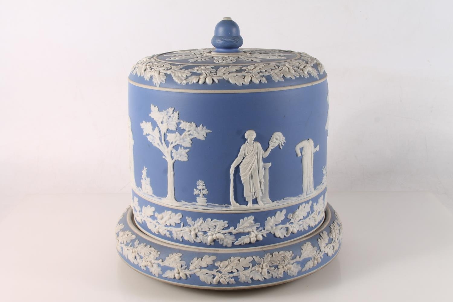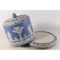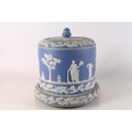 Wedgwood style jasperware blue and white cheese dome on stand decorated with classical scenes, 28cm high.