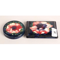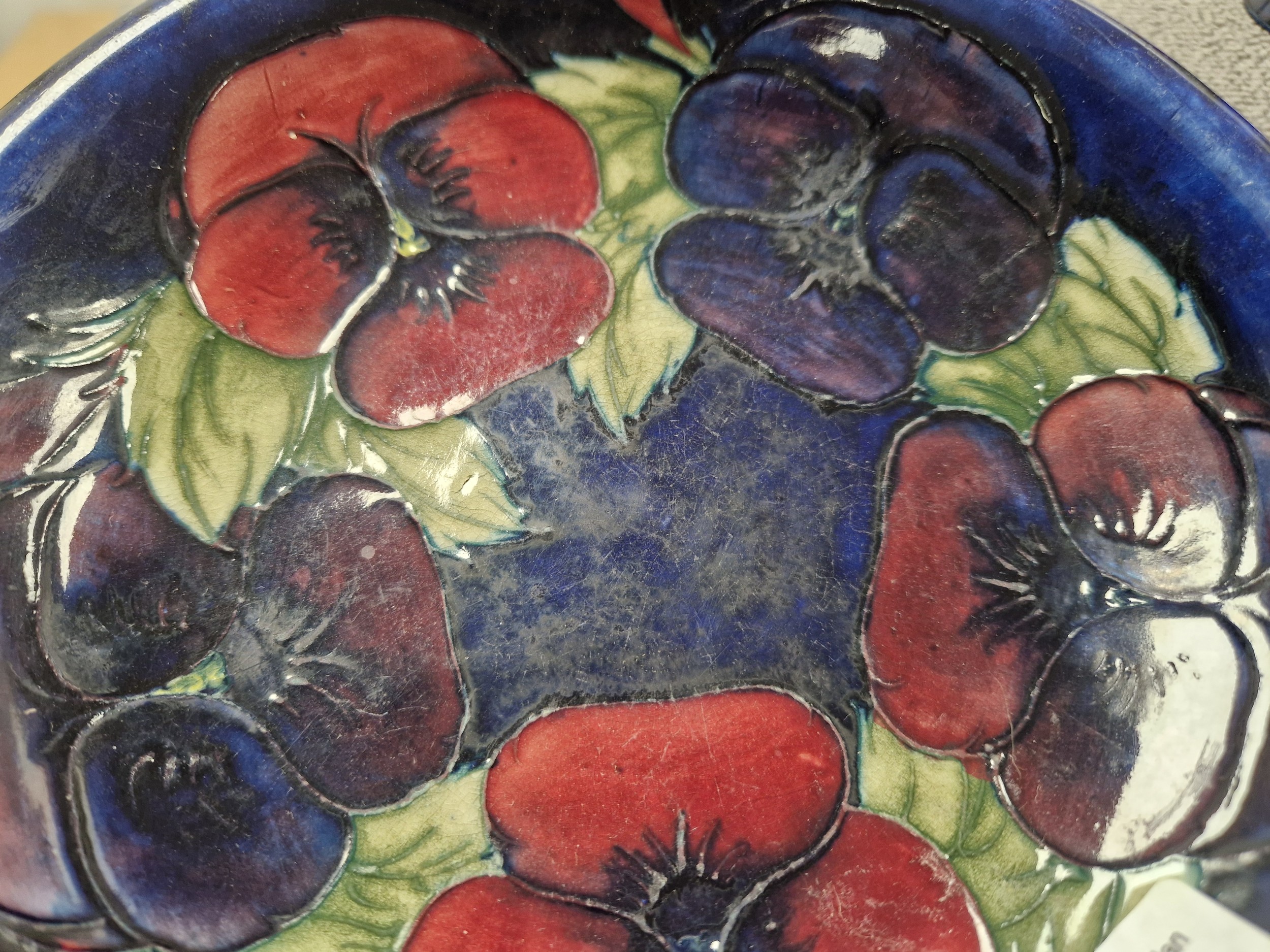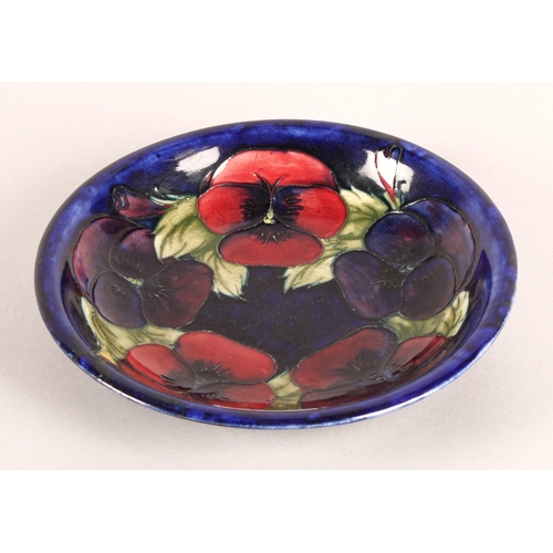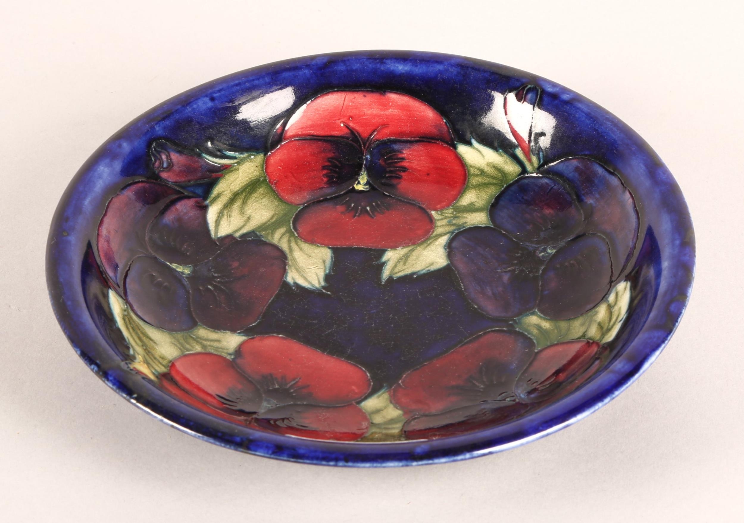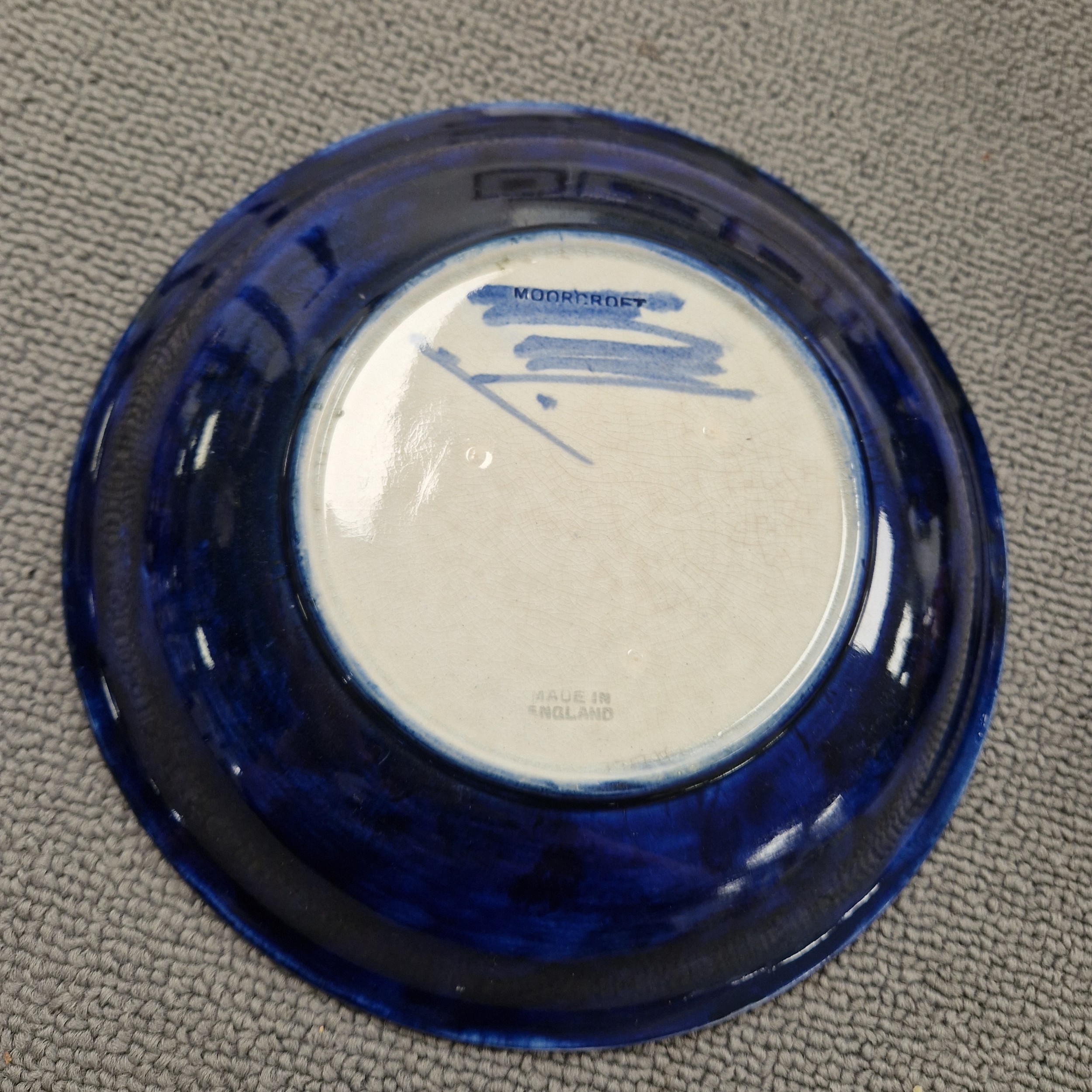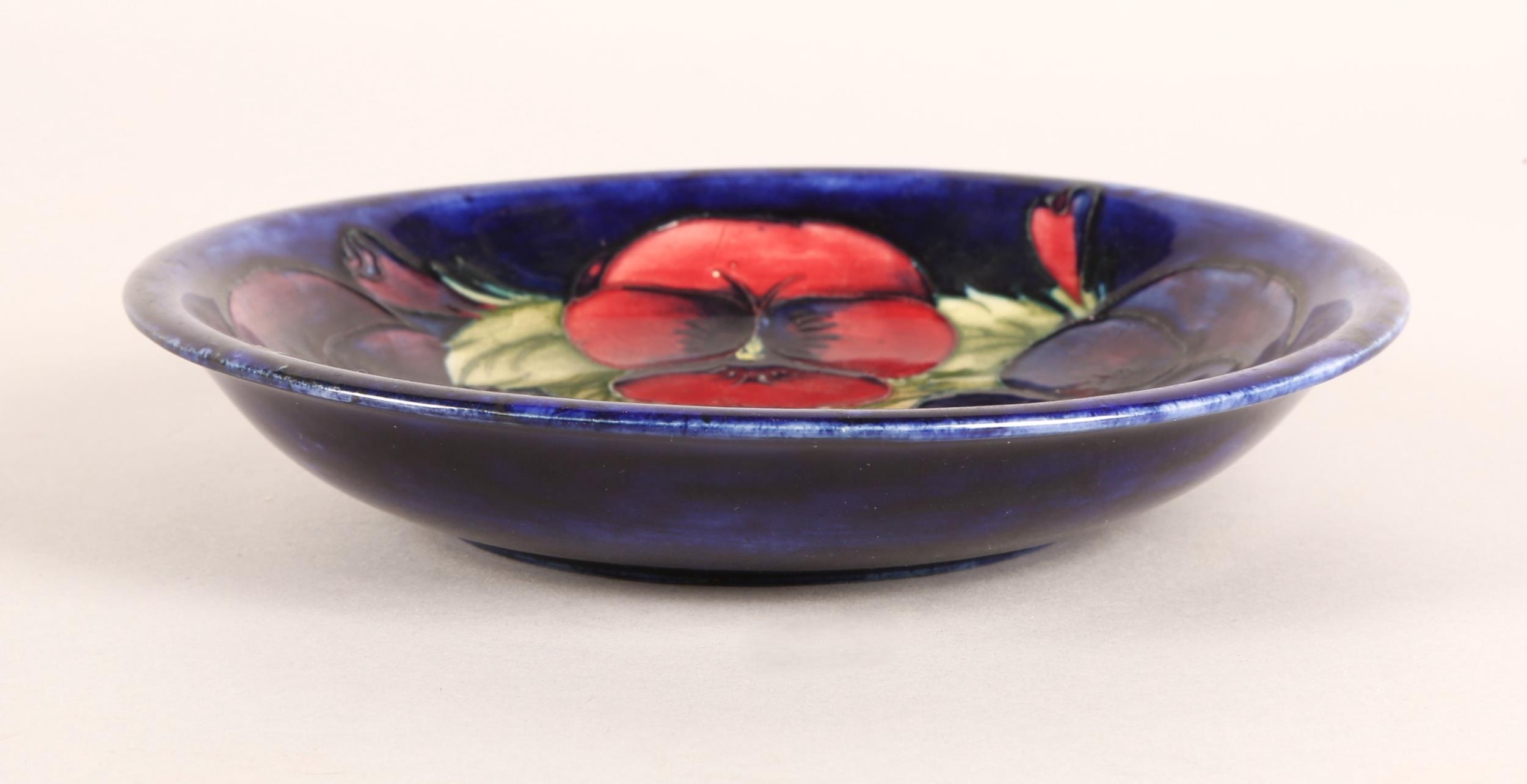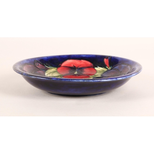 Moorcroft pottery tube lined shallow plate on blue ground, diameter 19cm