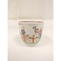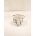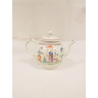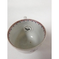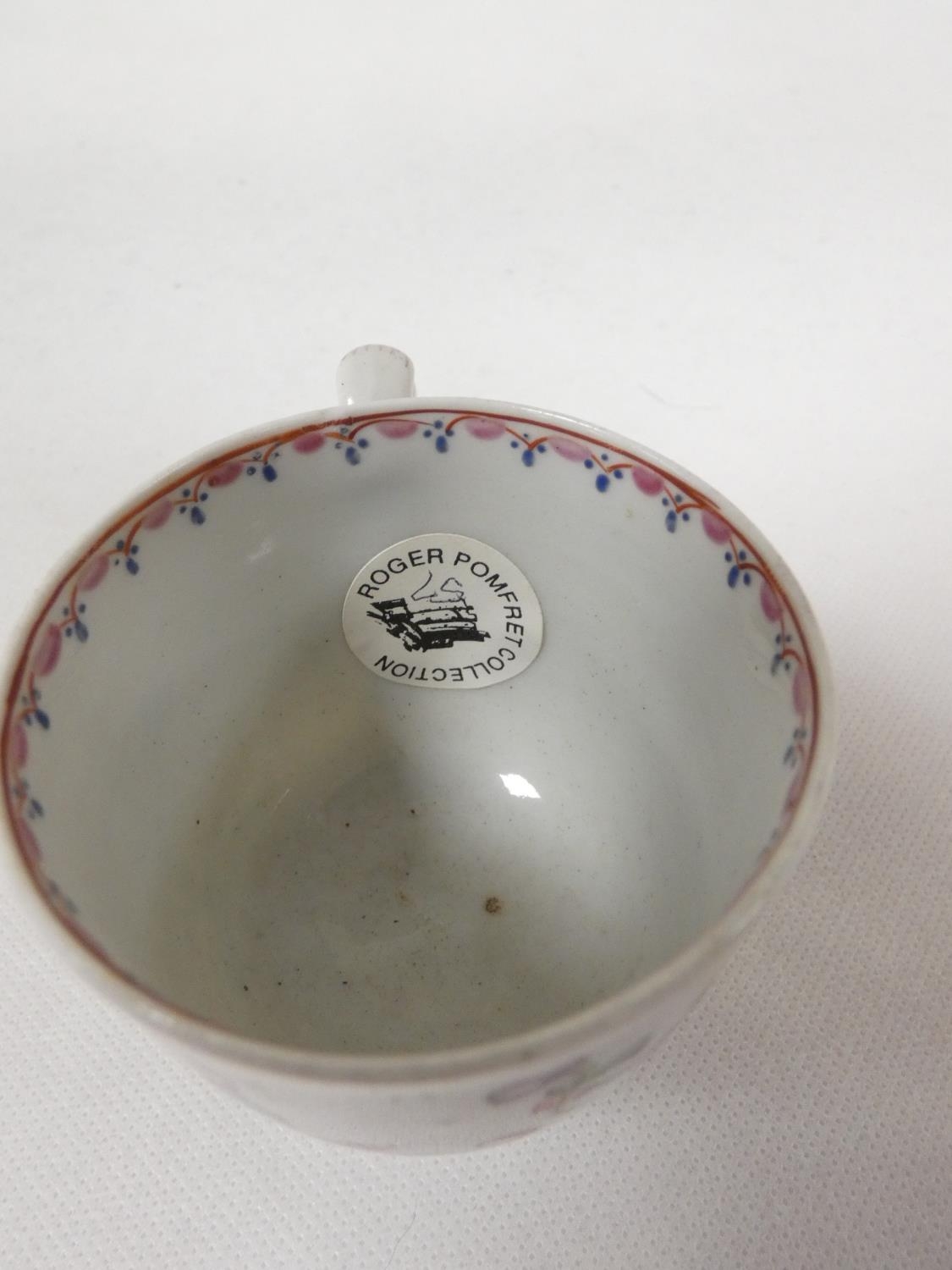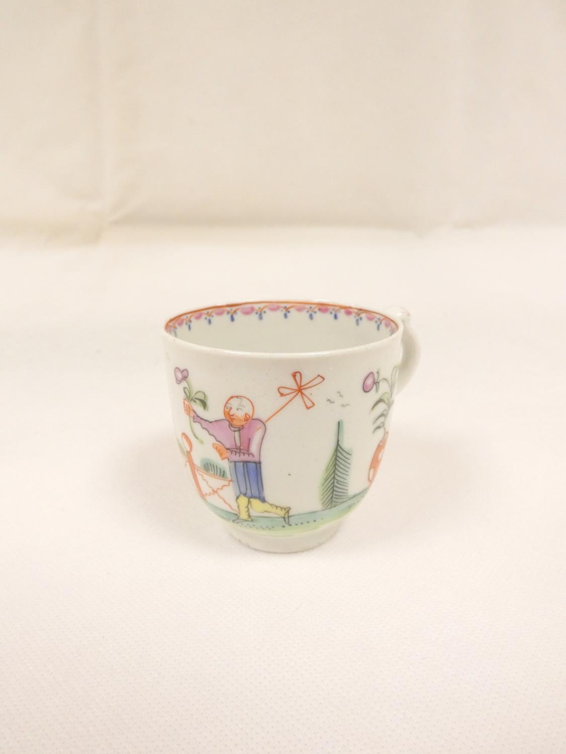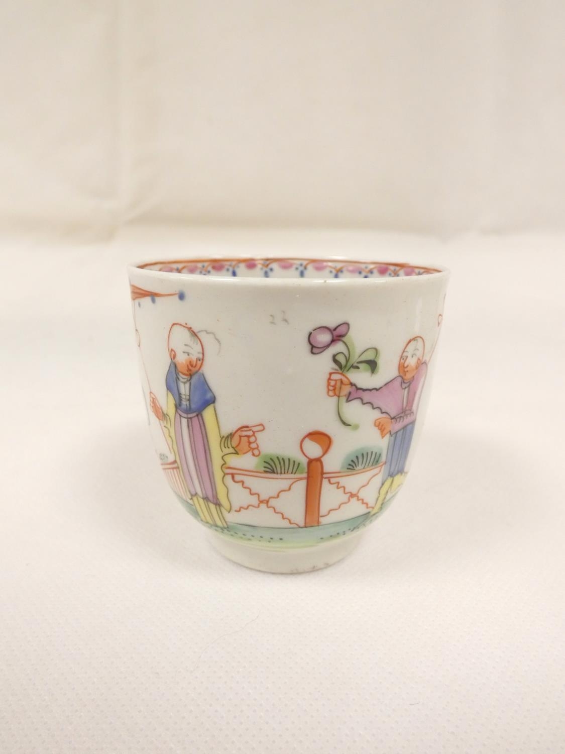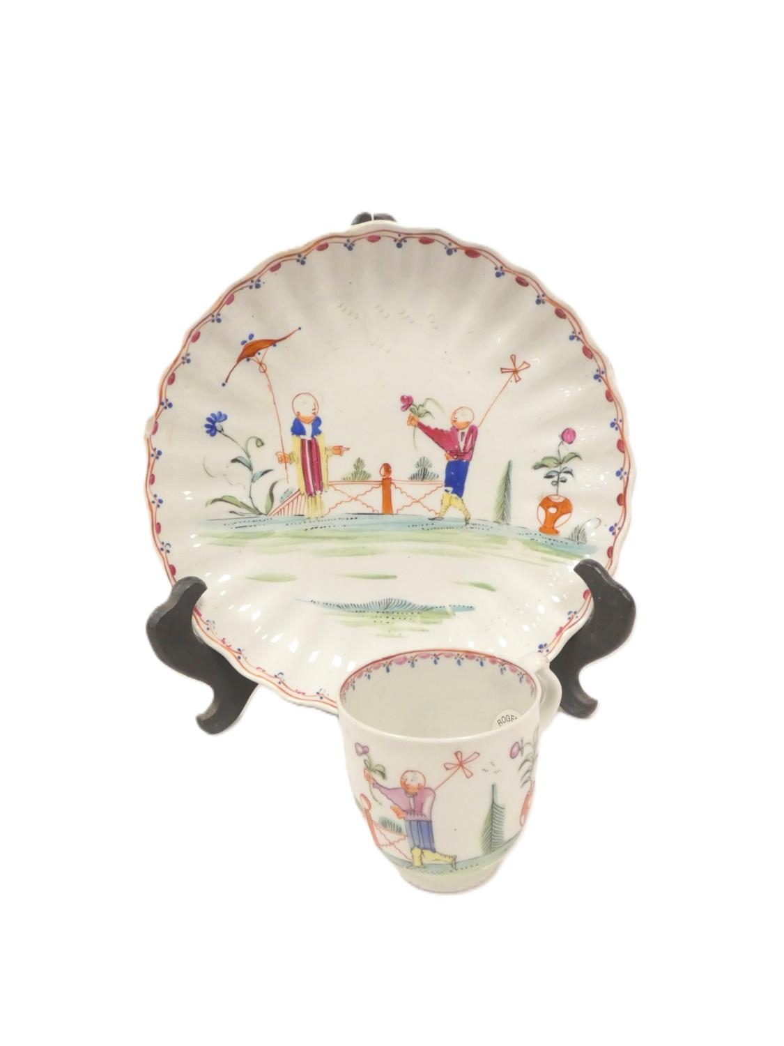 Rare early New Hall bread and butter plate with lobed and corrugated moulding, pattern 20, Chinese figures with windmill and parasol, 21.5cm diameter, c.1782/86; also New Hall wide loop clip handled coffee cup to match. (2).