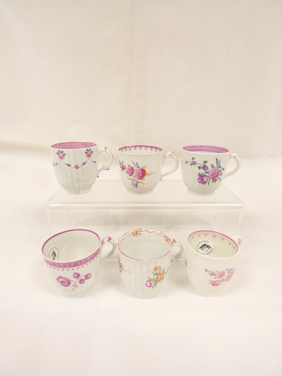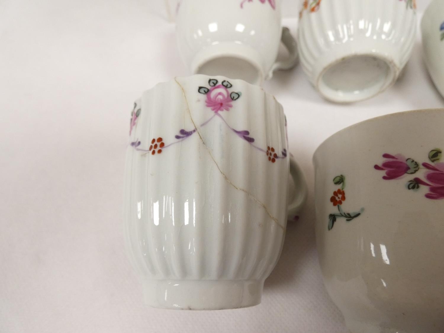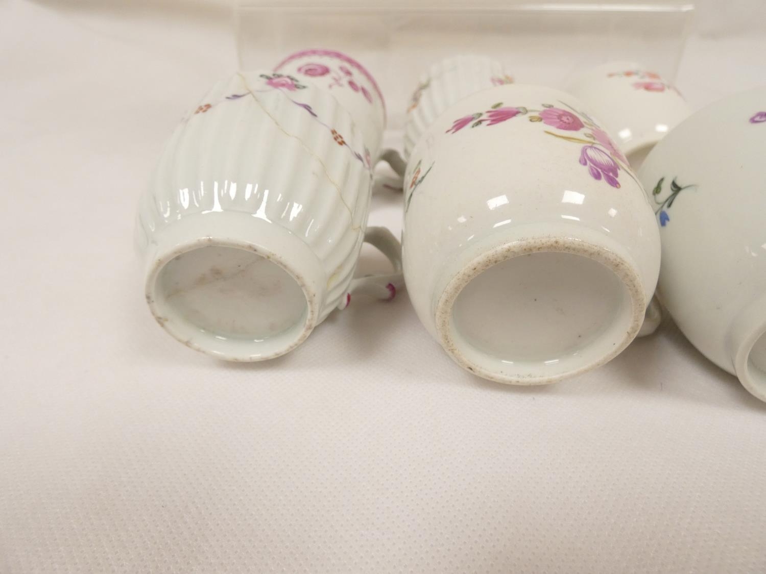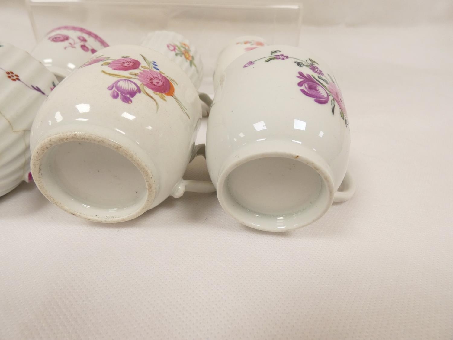 Rare early New Hall coffee cup of corrugated form with double scroll handle, floral sprays with knitting wool rim border, small rim chip and firing damage to foot rim, 6cm high, 1782/85; and four others, floral spray patterns. (5).