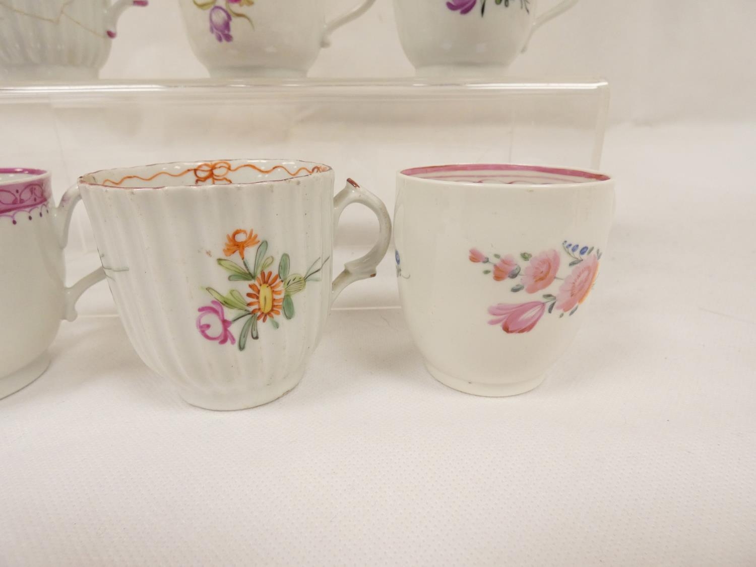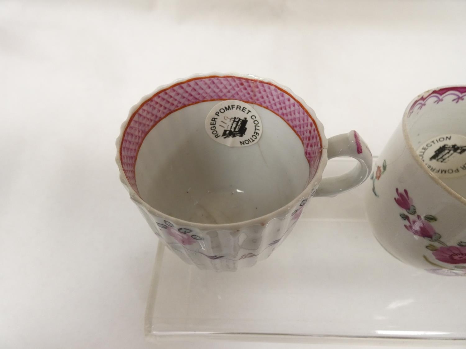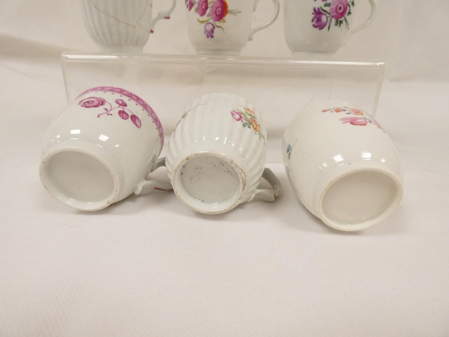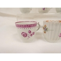 Rare early New Hall coffee cup of corrugated form with double scroll handle, floral sprays with knitting wool rim border, small rim chip and firing damage to foot rim, 6cm high, 1782/85; and four others, floral spray patterns. (5).