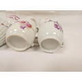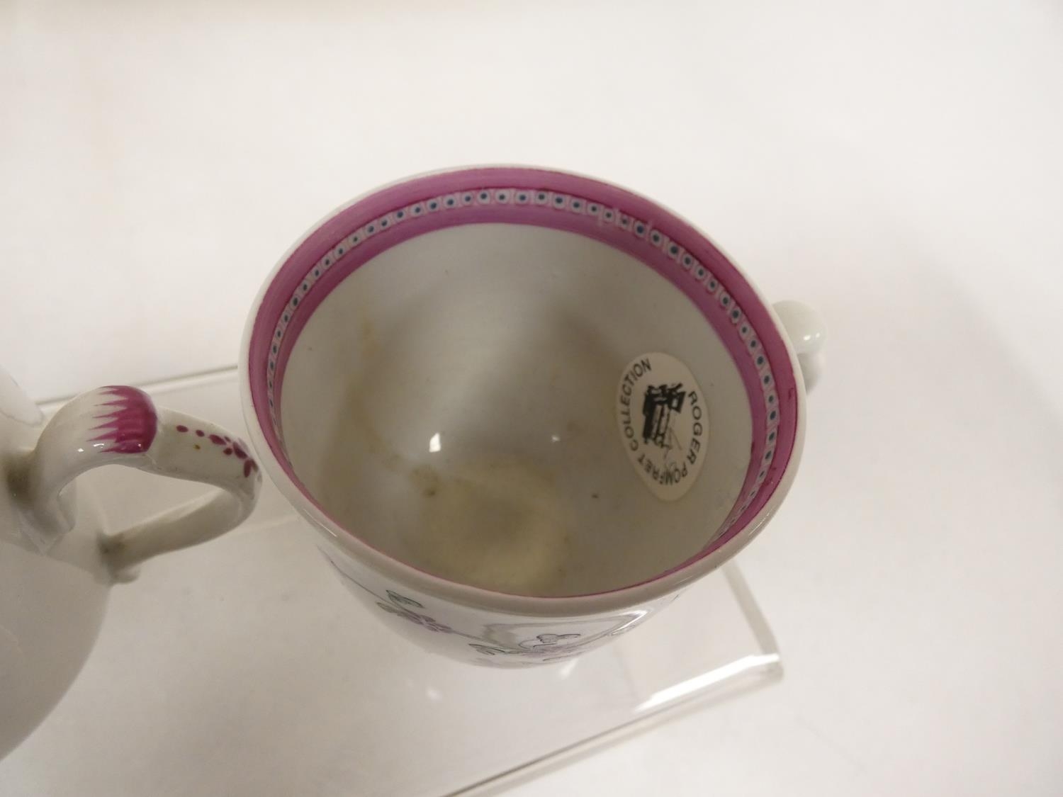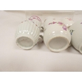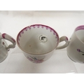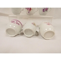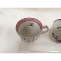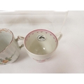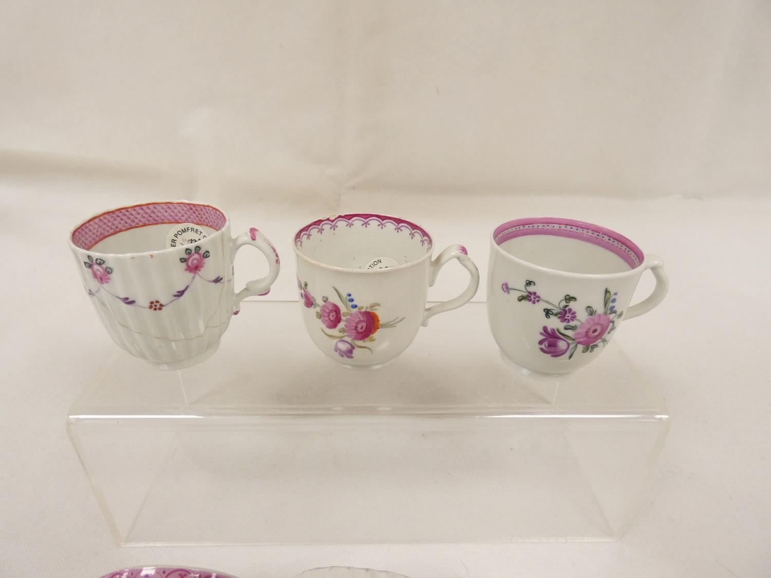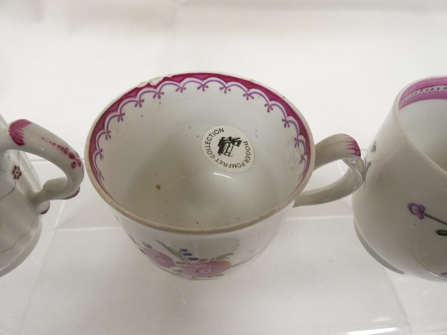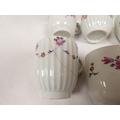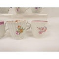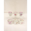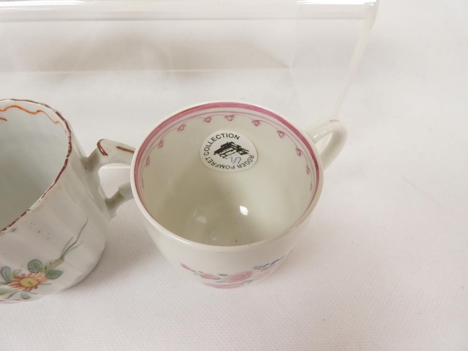 Rare early New Hall coffee cup of corrugated form with double scroll handle, floral sprays with knitting wool rim border, small rim chip and firing damage to foot rim, 6cm high, 1782/85; and four others, floral spray patterns. (5).